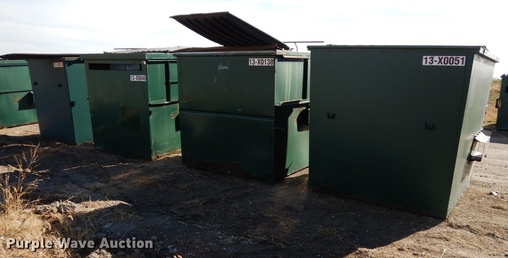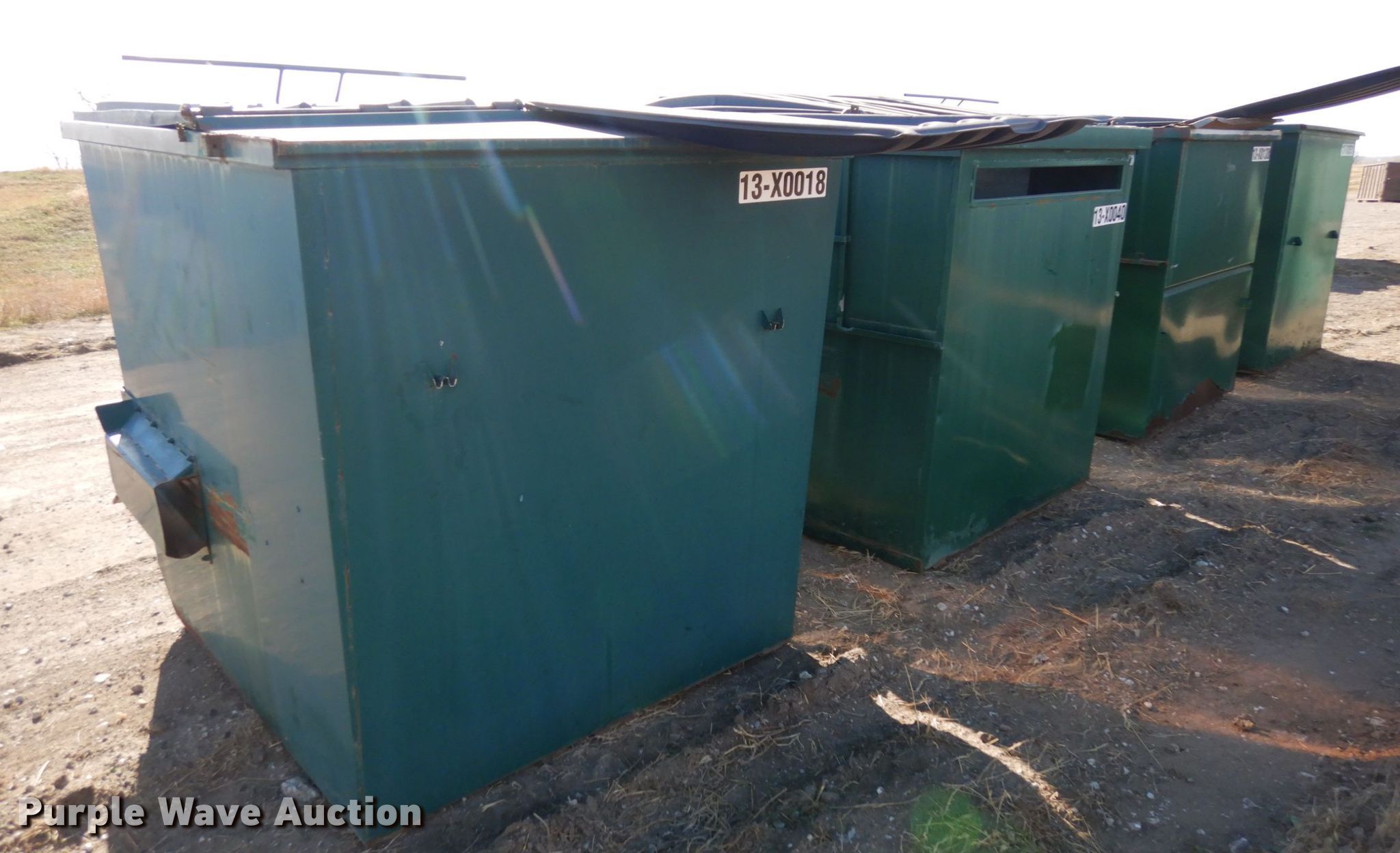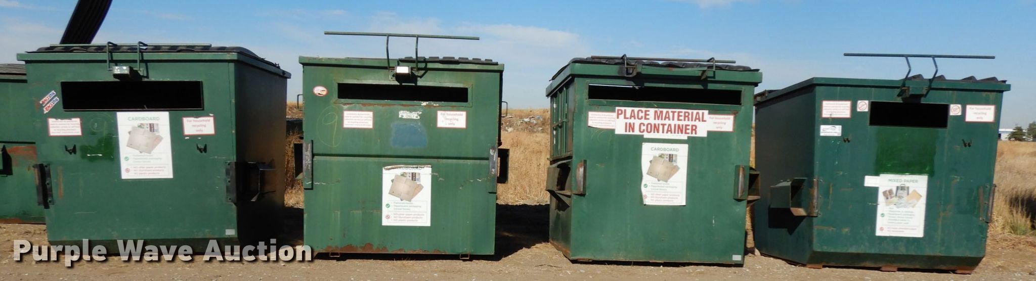 Purple Wave is selling a used Refuse or Compaction Equip. in Nebraska. This item is a (4) dumpsters with the following: Approx. 69"W x 75"D x 75"H, Eight yd. capacities, EIN 13-X0018, 13-X0040, 13-X0138, 13-X0051, Unit# 9