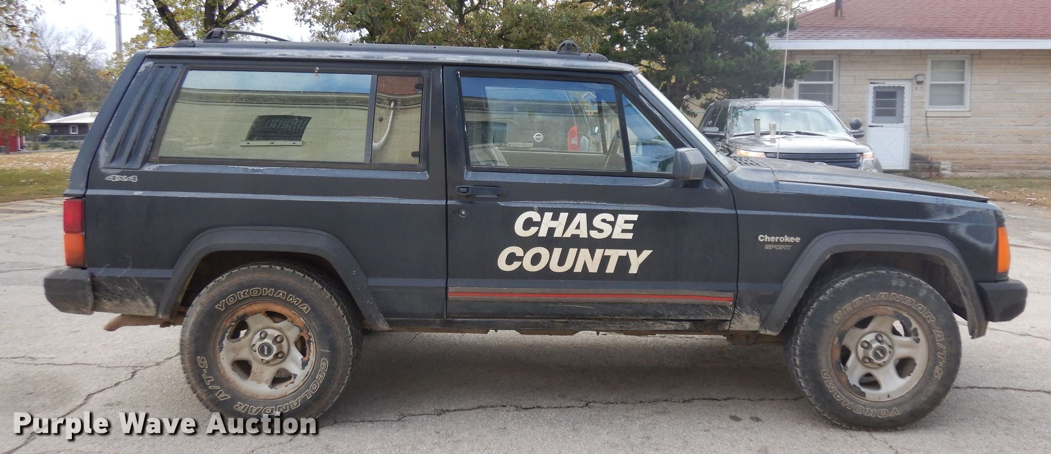 1996 Jeep Cherokee Sport SUV. 141,564 miles on odometer. Engine Displacement: 4.0L L6 OHV 12V, Cylinders: 6, Fuel type: Gas. Transmission Automatic, Four wheel drive. Interior AC, Heat, Power windows, Power locks, Cruise control. Tires Size: 235/75R15. Notes Non-operational fan motor. Kansas title. 1J4FJ67S7TL247885. Chase County Road and Bridge Dept.. Cottonwood Falls, KS 66845