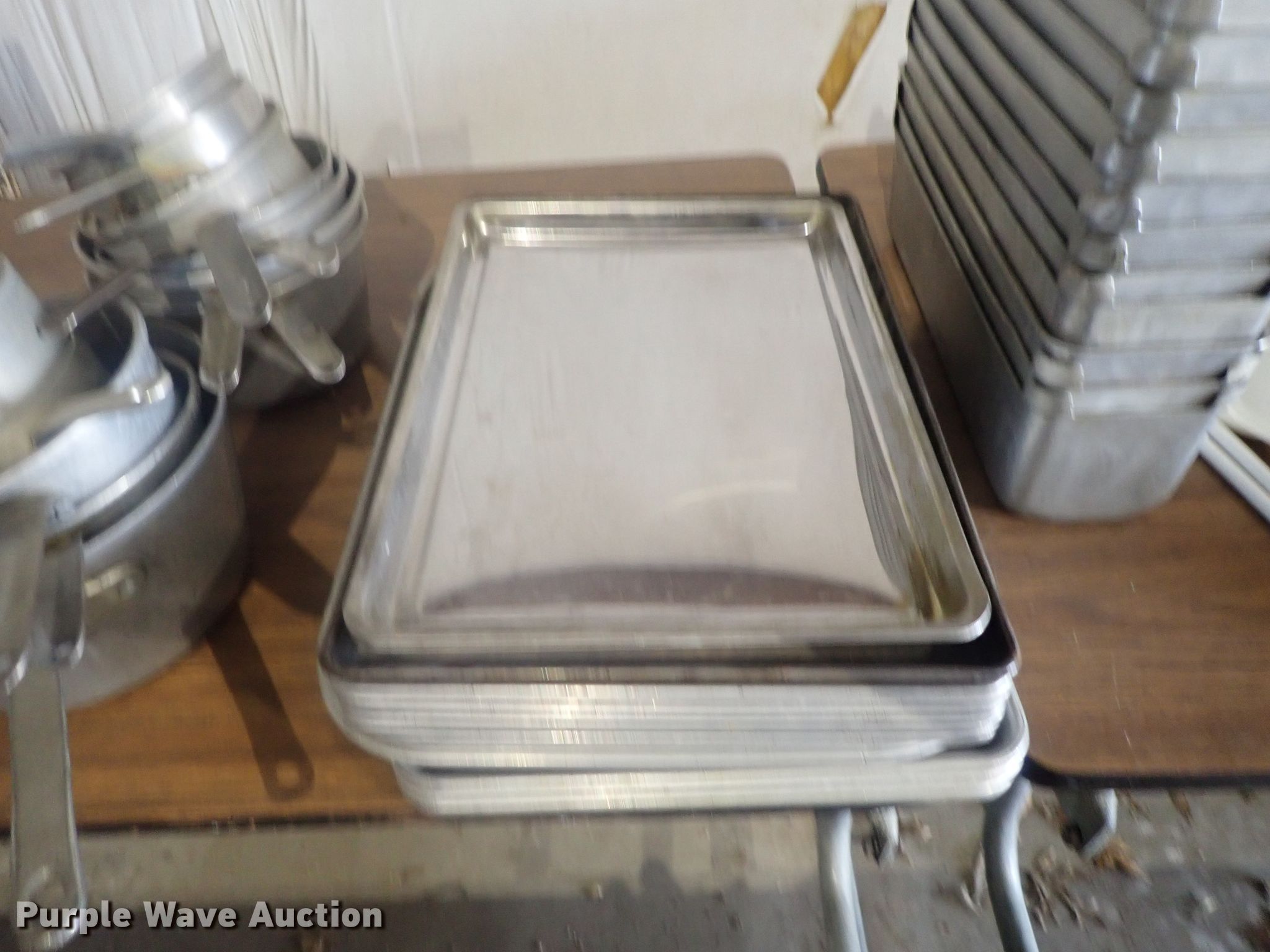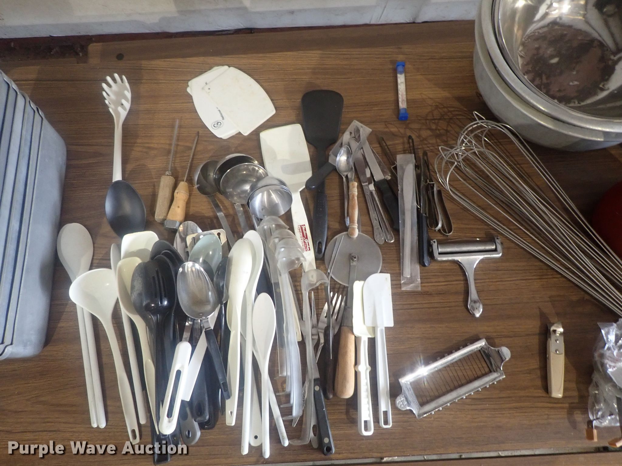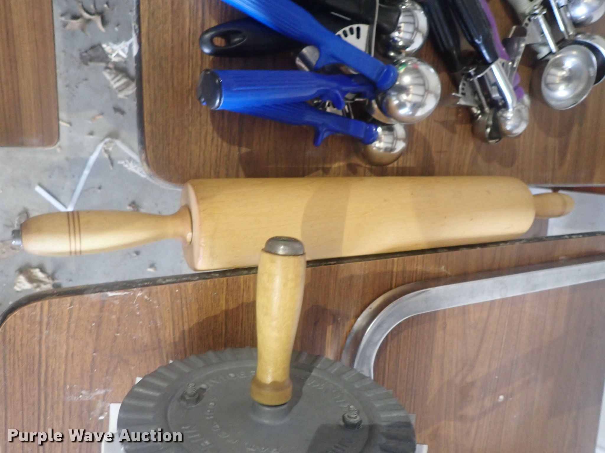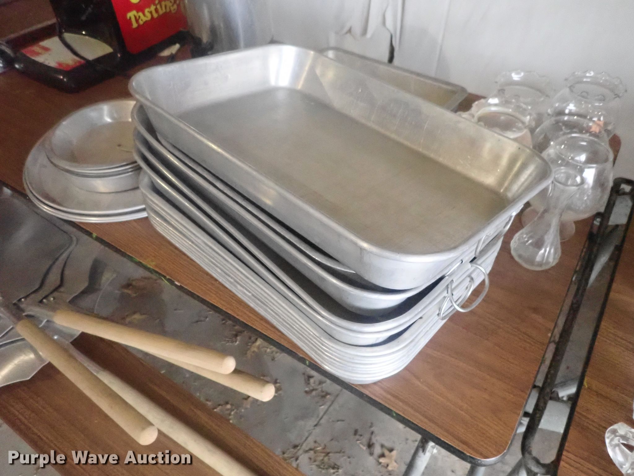 Purple Wave is selling a used Restaurant Equip. in Kansas. This item is a Restaurant equipment and supplies with the following: GE microwave, Cupcake pans, Scales, Pitchers, Glasses, Cake pans, Coffee pot, Pizza pans, Pizza peels, Nacho cheese dispenser, Vollrath food warmer, Rolling pins, Ice cream scoops, Assorted metal pans, Whisks, Assorted serving utensils, Bread pans, Baking sheets, Pots, Fryer baskets, Blenders, Mixer, Cutting boards, Serving trays and more, Tables not included