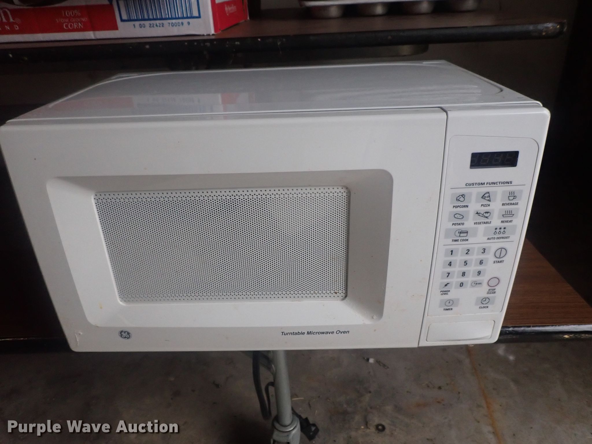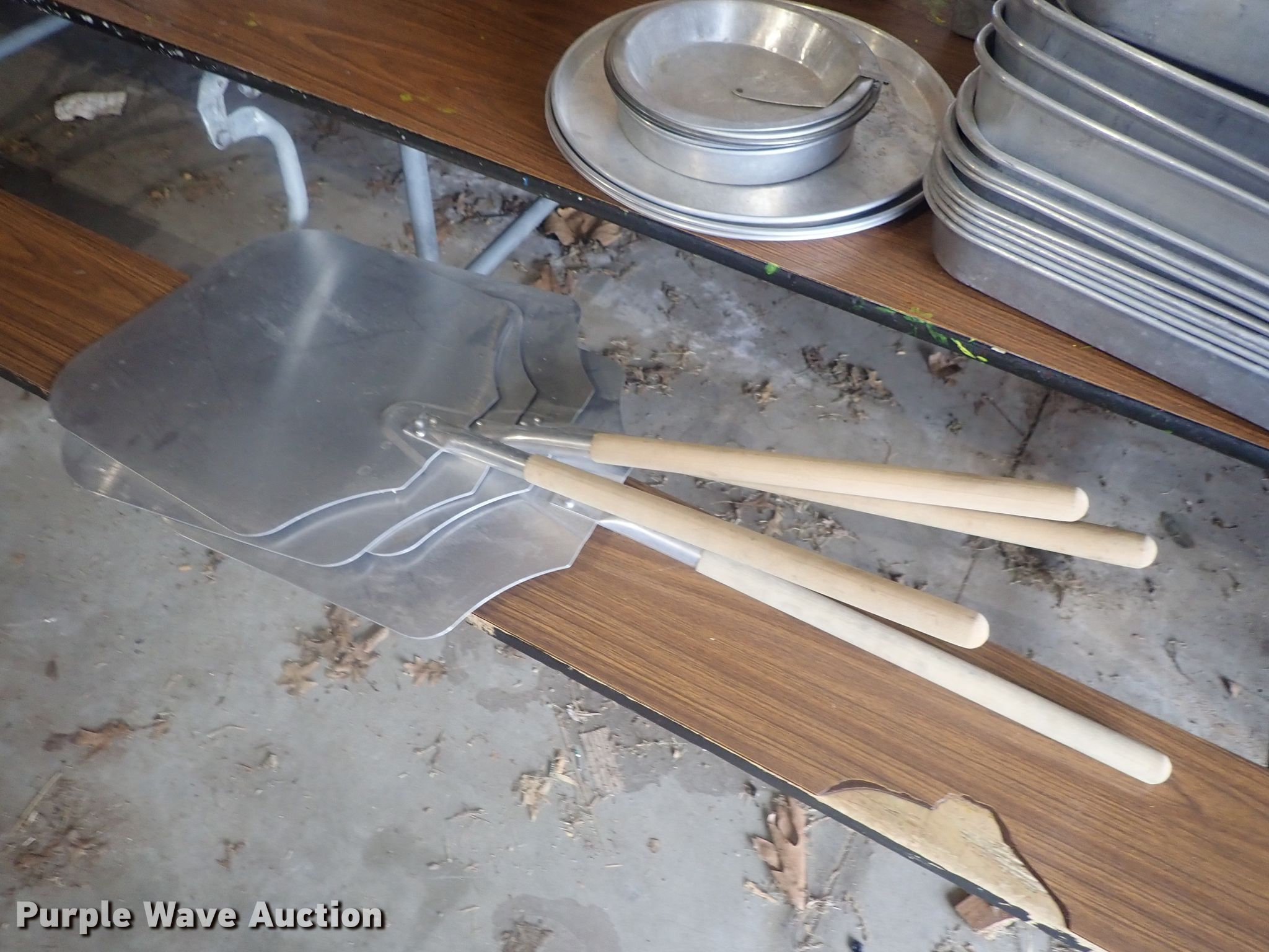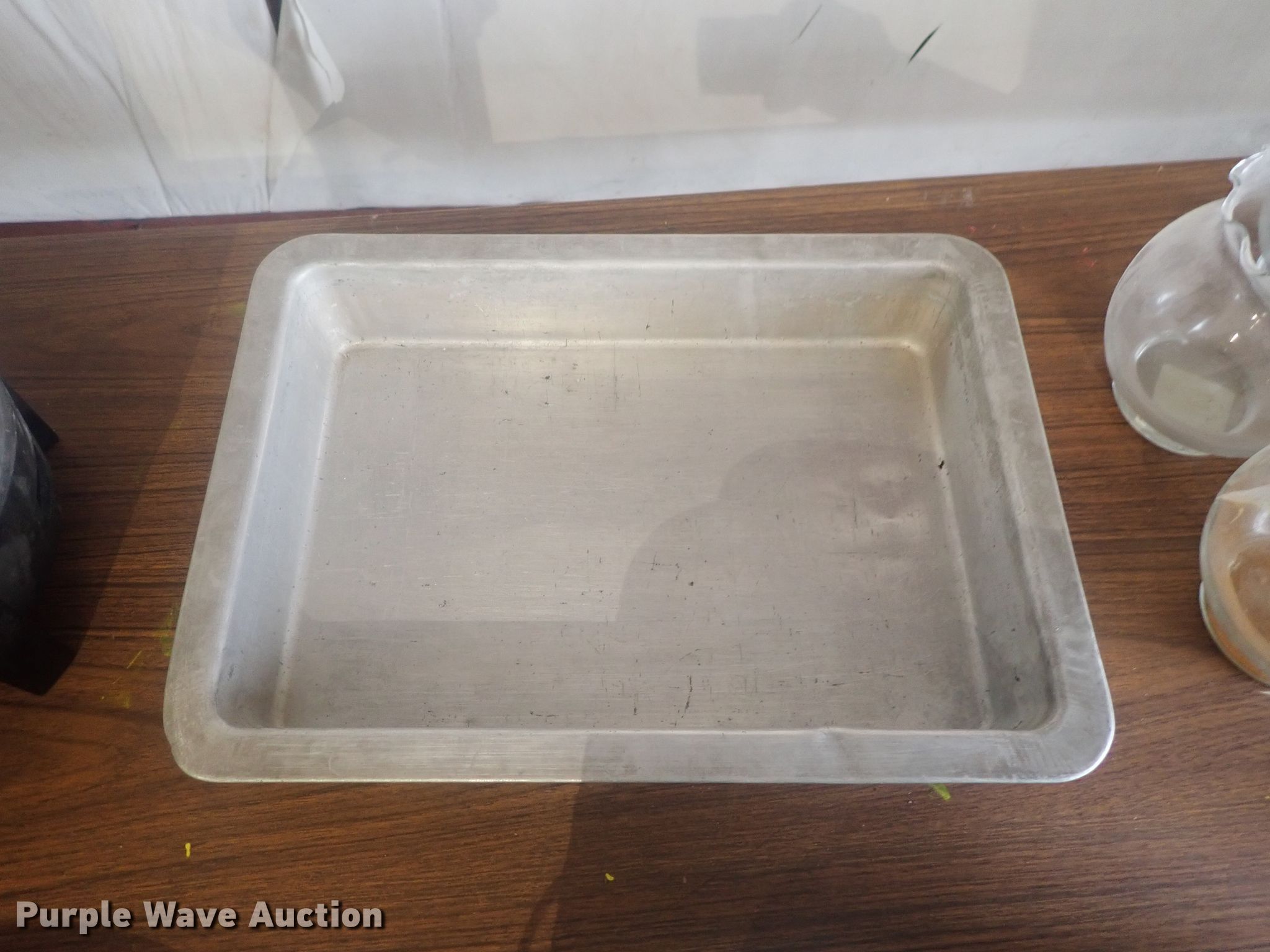 Purple Wave is selling a used Restaurant Equip. in Kansas. This item is a Restaurant equipment and supplies with the following: GE microwave, Cupcake pans, Scales, Pitchers, Glasses, Cake pans, Coffee pot, Pizza pans, Pizza peels, Nacho cheese dispenser, Vollrath food warmer, Rolling pins, Ice cream scoops, Assorted metal pans, Whisks, Assorted serving utensils, Bread pans, Baking sheets, Pots, Fryer baskets, Blenders, Mixer, Cutting boards, Serving trays and more, Tables not included
