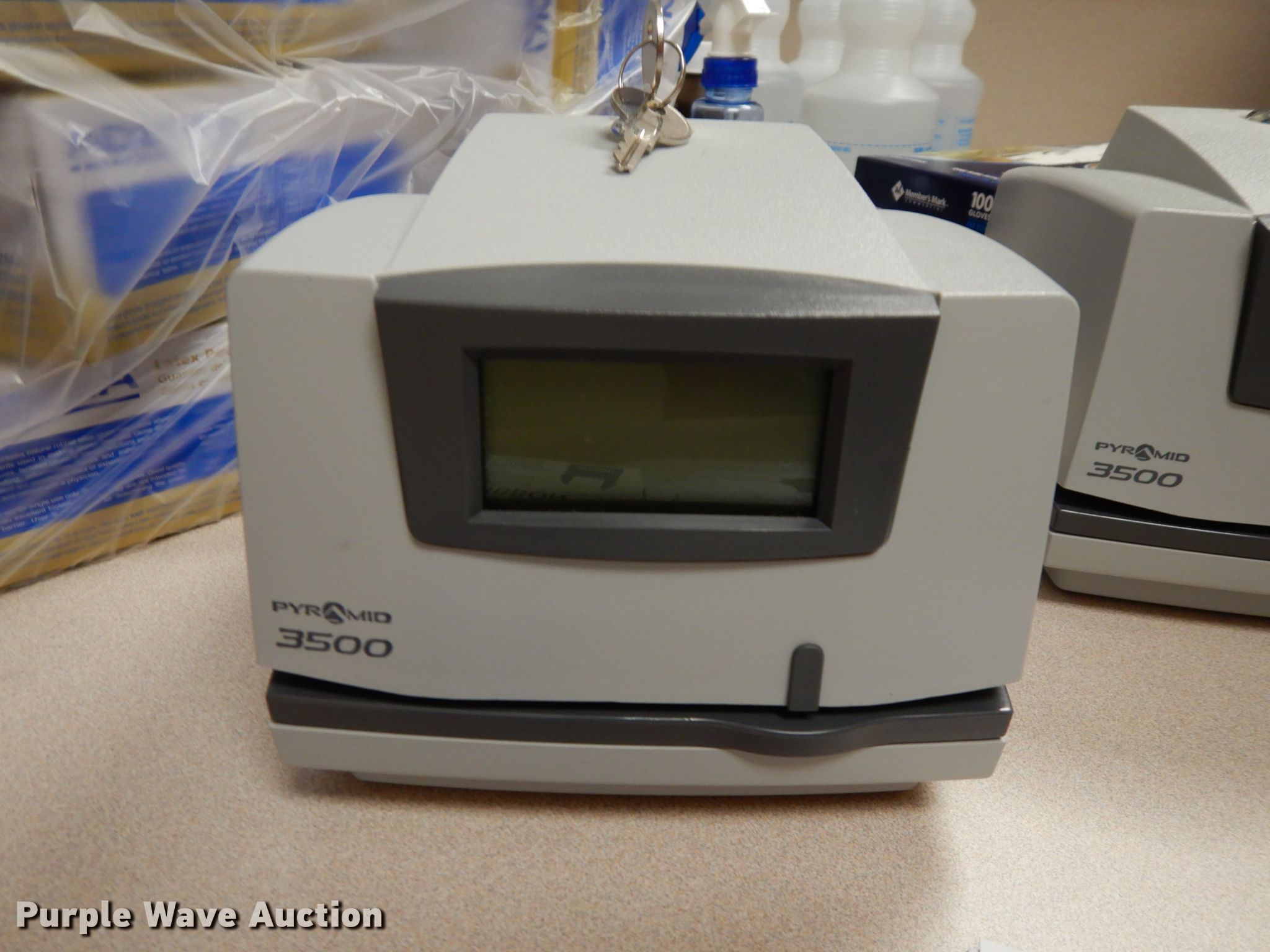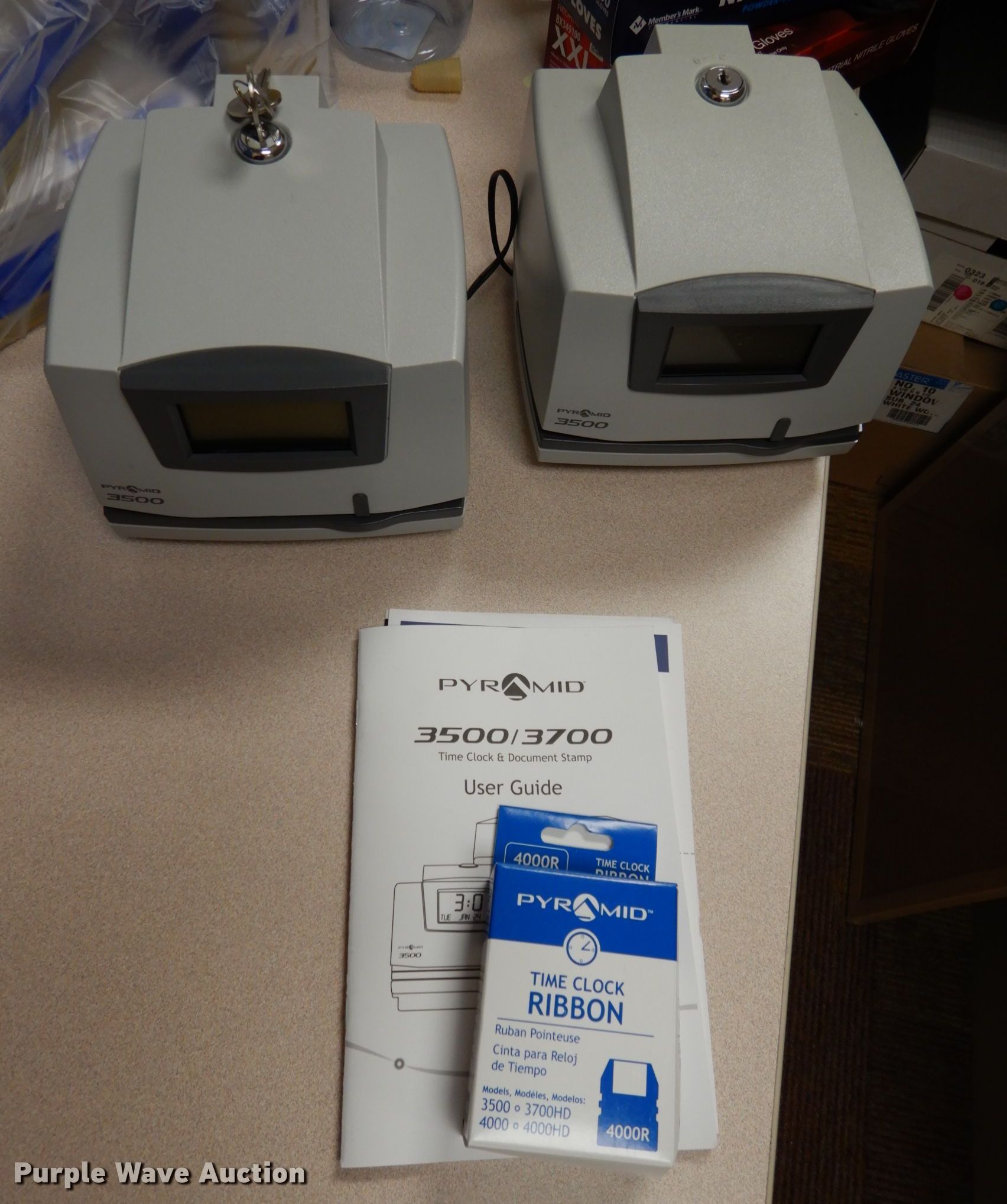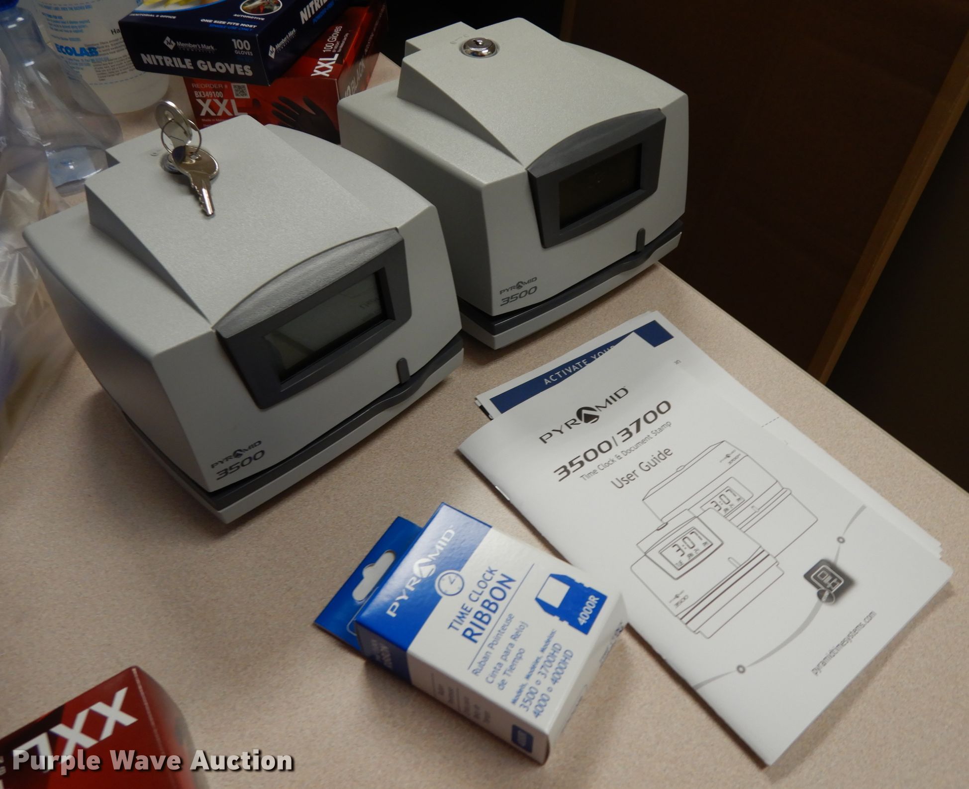 Purple Wave is selling a used Office Supplies and Equip. in Nebraska. This item is a (2) Pyramid 3500 time clocks/document stamps with the following: Unused time clock ribbon, Operator/user guide