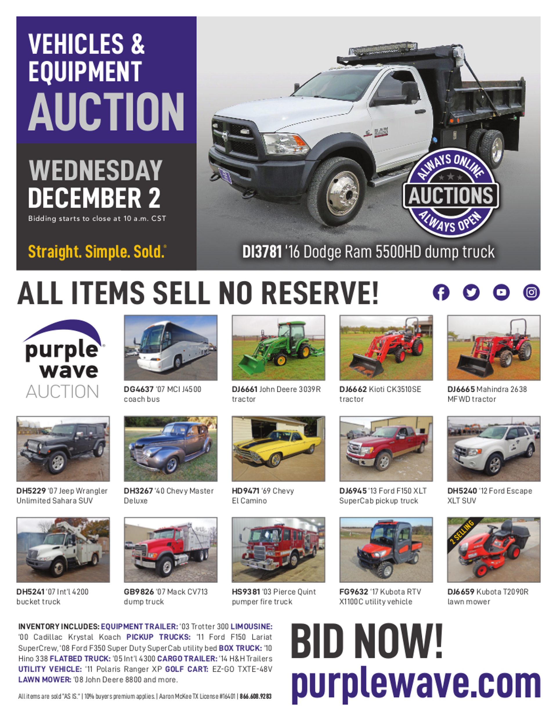 This auction is conducted by Purple Wave, Inc., whose home office is 825 Levee Drive, Manhattan, Kansas. Aaron McKee, Texas auctioneer license # 16401, operates Purple Wave, Inc. Complaints against us may be directed to the Texas Department of Licensing and Regulation, P.O. Box 12157, Austin, Texas 78711, (512) 463-6599. For additional required information, see the attached document.