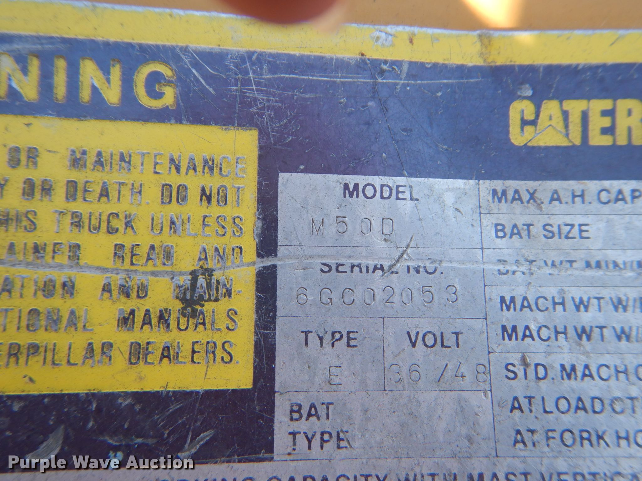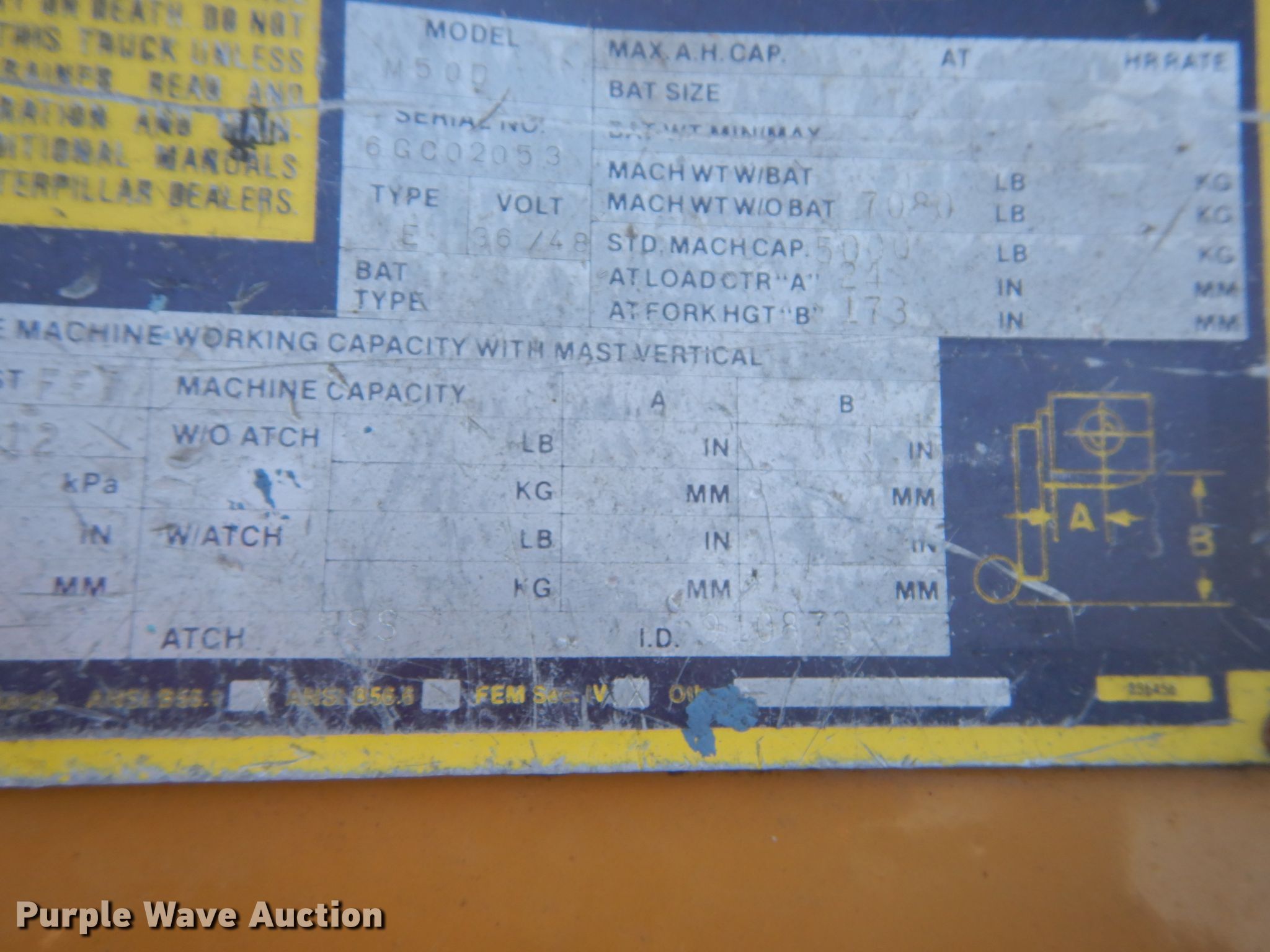 Caterpillar M50D forklift. 955 hours on meter, Serial: 6GC02053. Electric motor Charger included Phase: Single, Three. Transmission Hydrostatic. Operators station OROPS. Operational Maximum lift capacity: 5,000 lbs, Maximum lift height: 173", Mast stages: 3, Side shift, Mast tilt, Fork length: 42". Tires Front: 18x8x12 1/8, Rear: 16x5x10.5, Solid. Notes Batteries will not hold charge, Non-operational unit. AA Auto Parts LLC. Bethalto, IL 62010