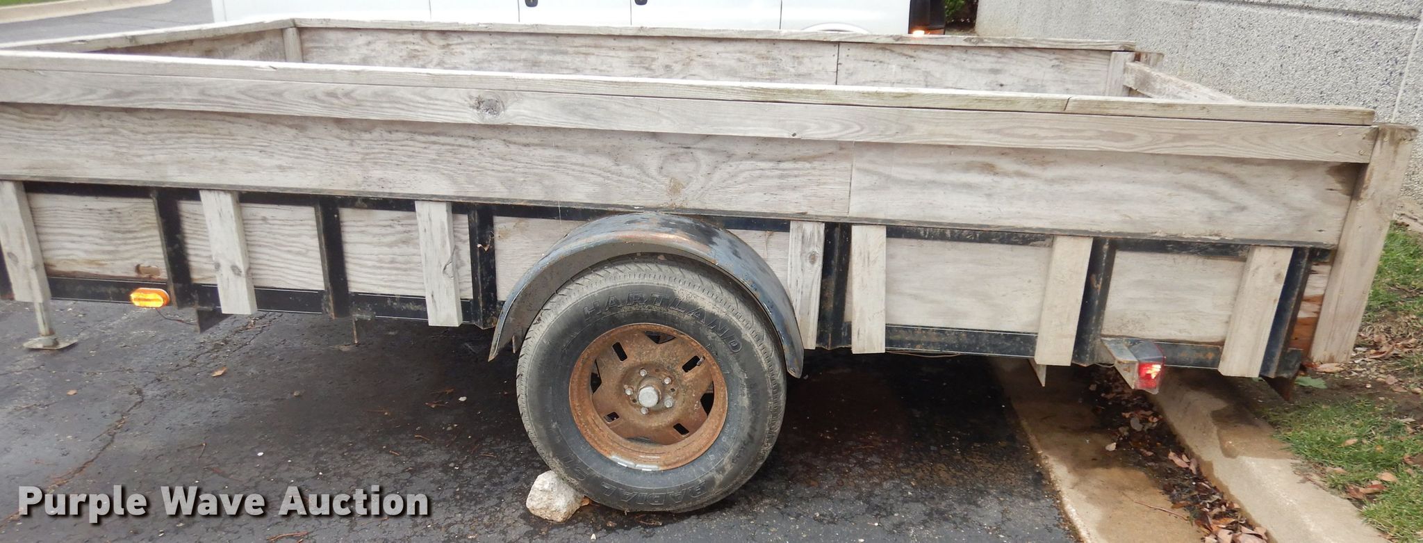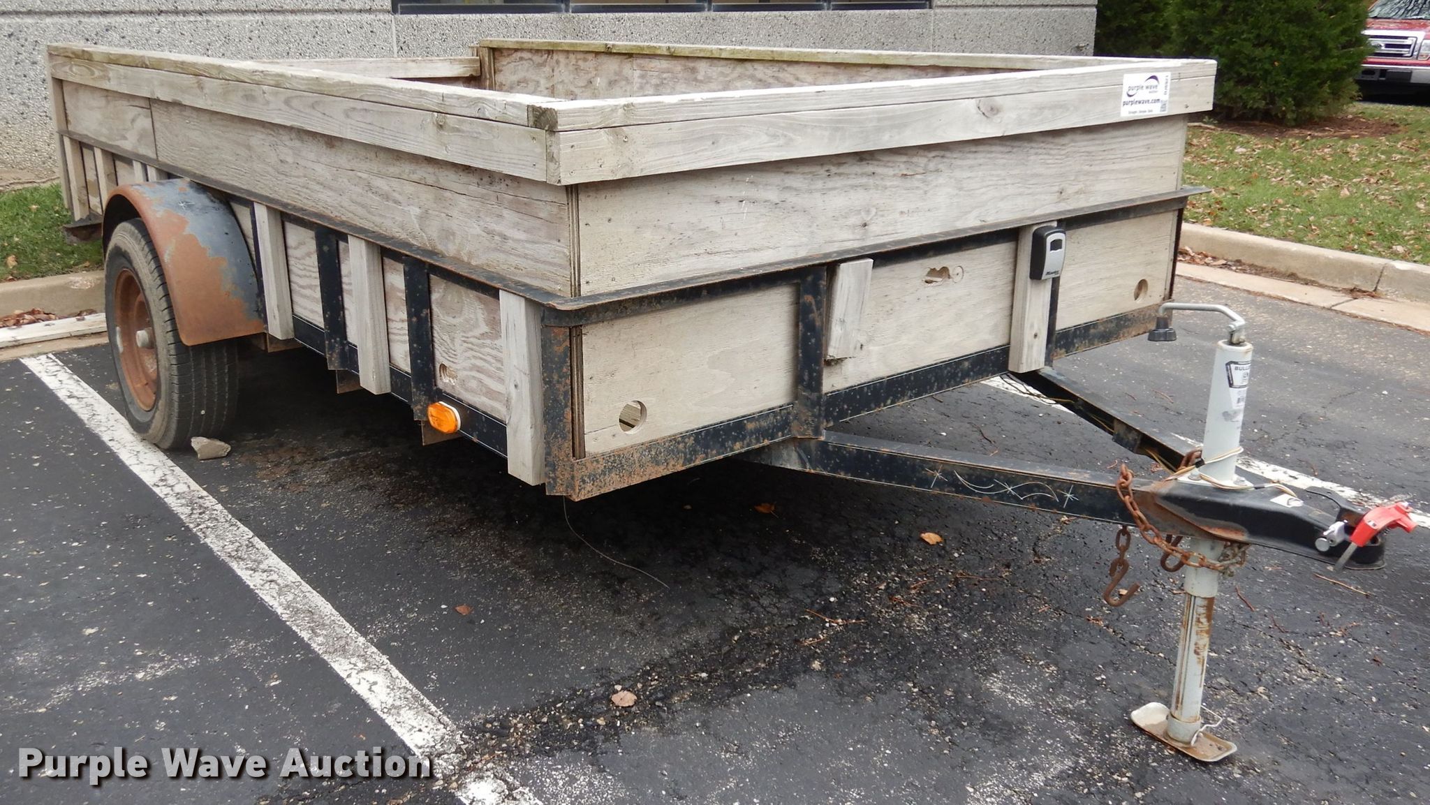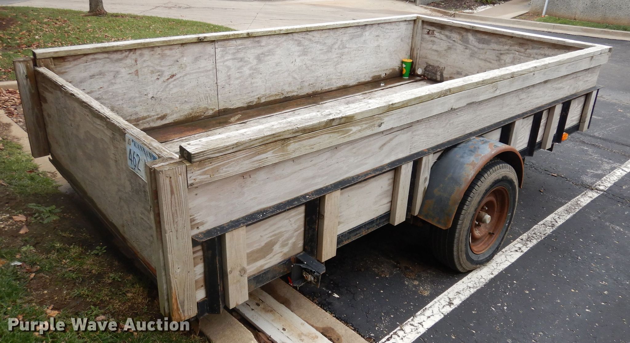 Purple Wave is selling a used Car or Utility Trailer in Kansas. This item is a 2016 shop built utility trailer with the following: 12'6"L x 6'6"W deck, 2'3" side height, Wood deck, Removable end gate, 2" ball hitch, Single leg landing gear, Single axle, Nexen 215/75R15 tires, Hitch lock not included, One taillight damaged