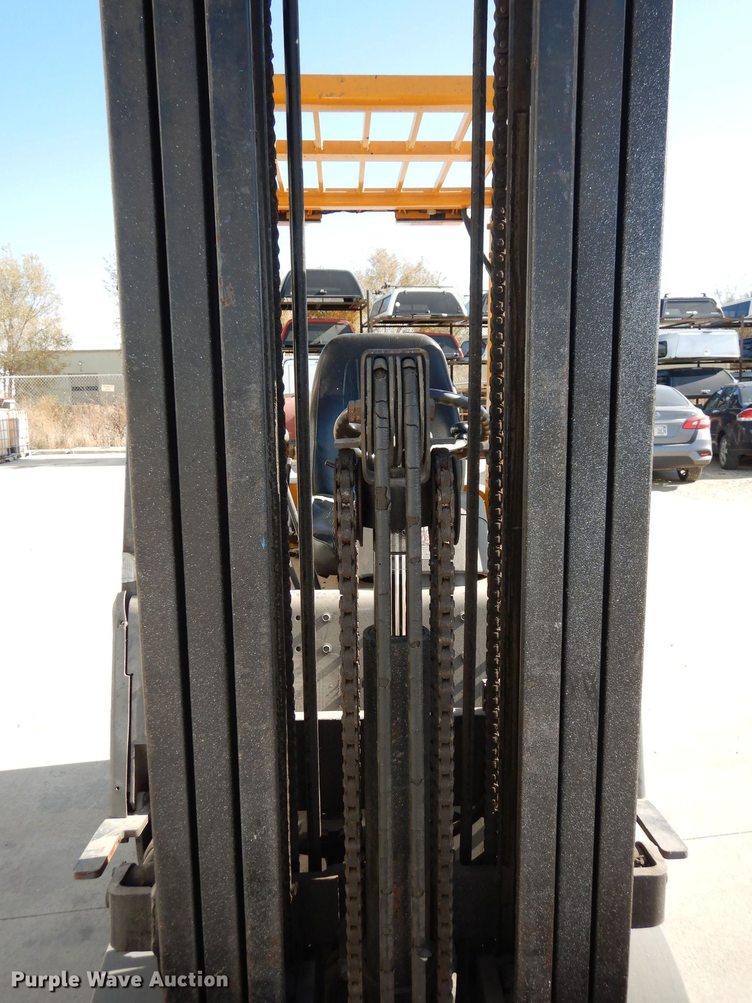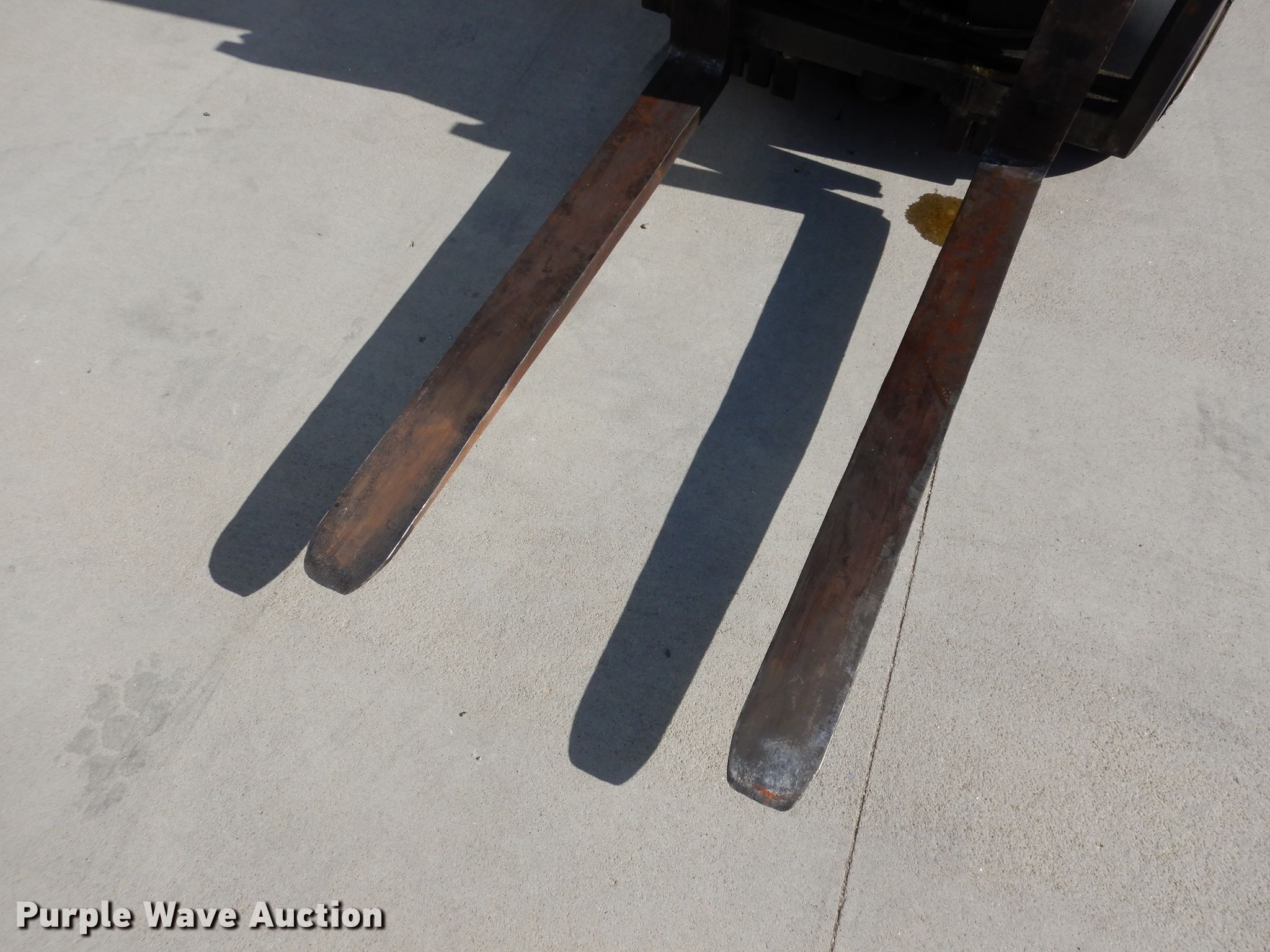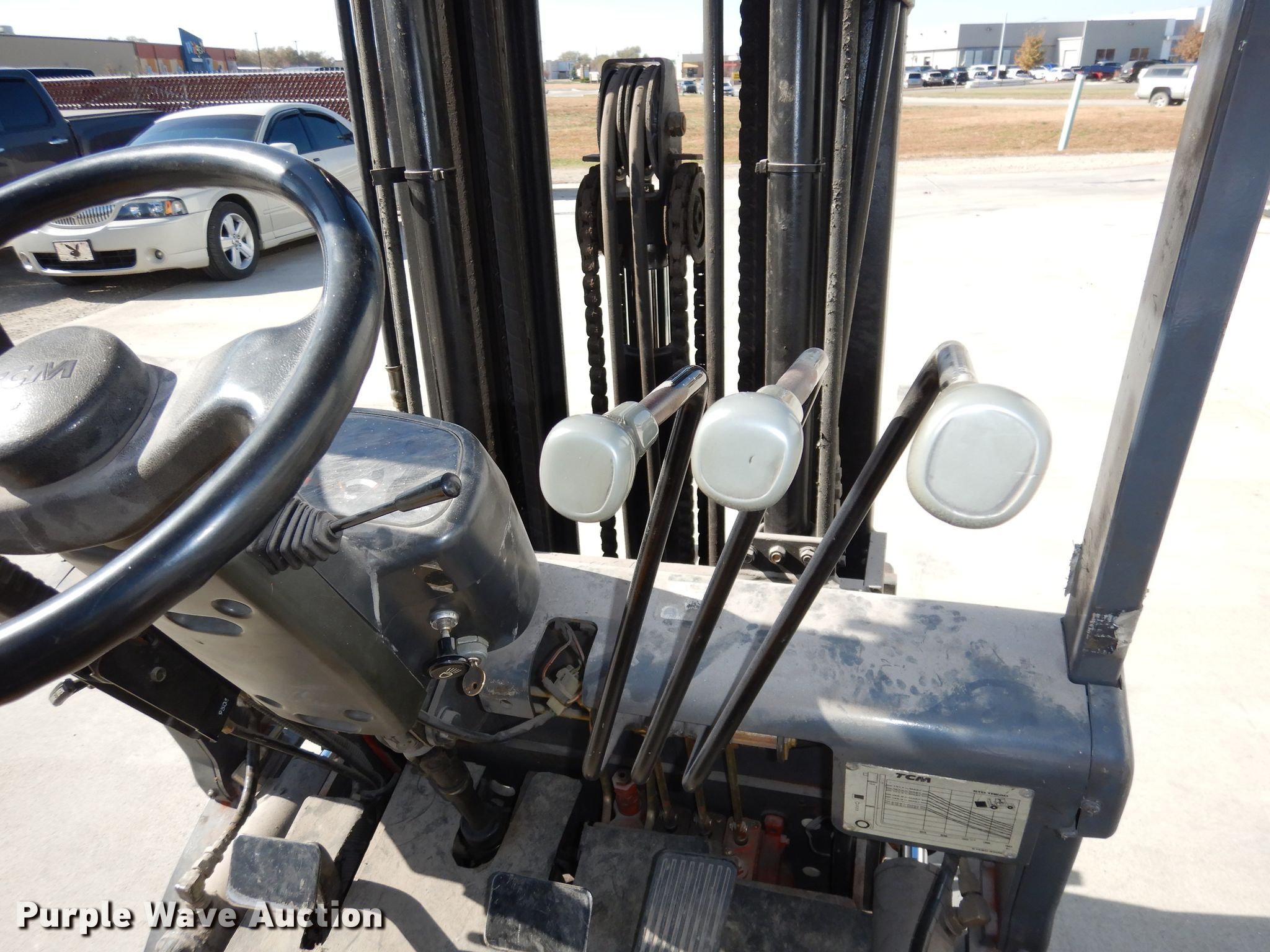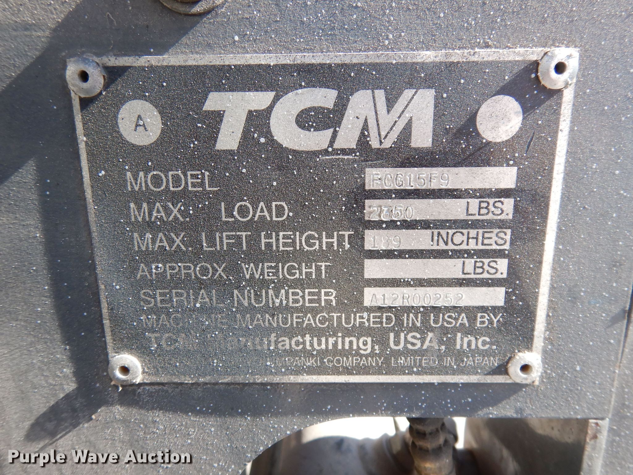 TCM FCG15F9 forklift. 4,698 hours on meter, Serial: A12R00252. Engine Fuel type: LPG LP bottle: Not included. Transmission Powershift. Operators station OROPS. Operational Maximum lift capacity: 2,350 lbs, Maximum lift height: 189", Mast stages: 3, Side shift, Mast tilt, Fork length: 42". Tires Front: 21x6x15, Rear: 14x4.5x8, Solid. Notes One cylinder leaks. Manhattan, KS 66503