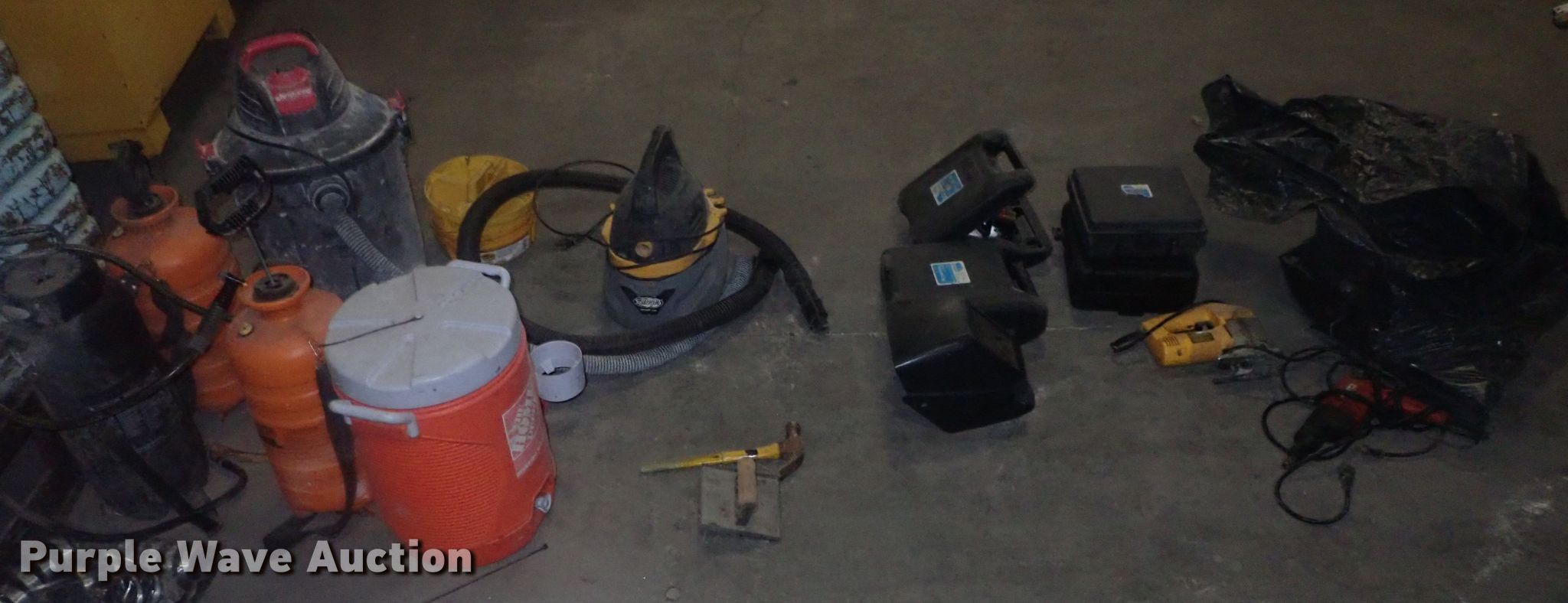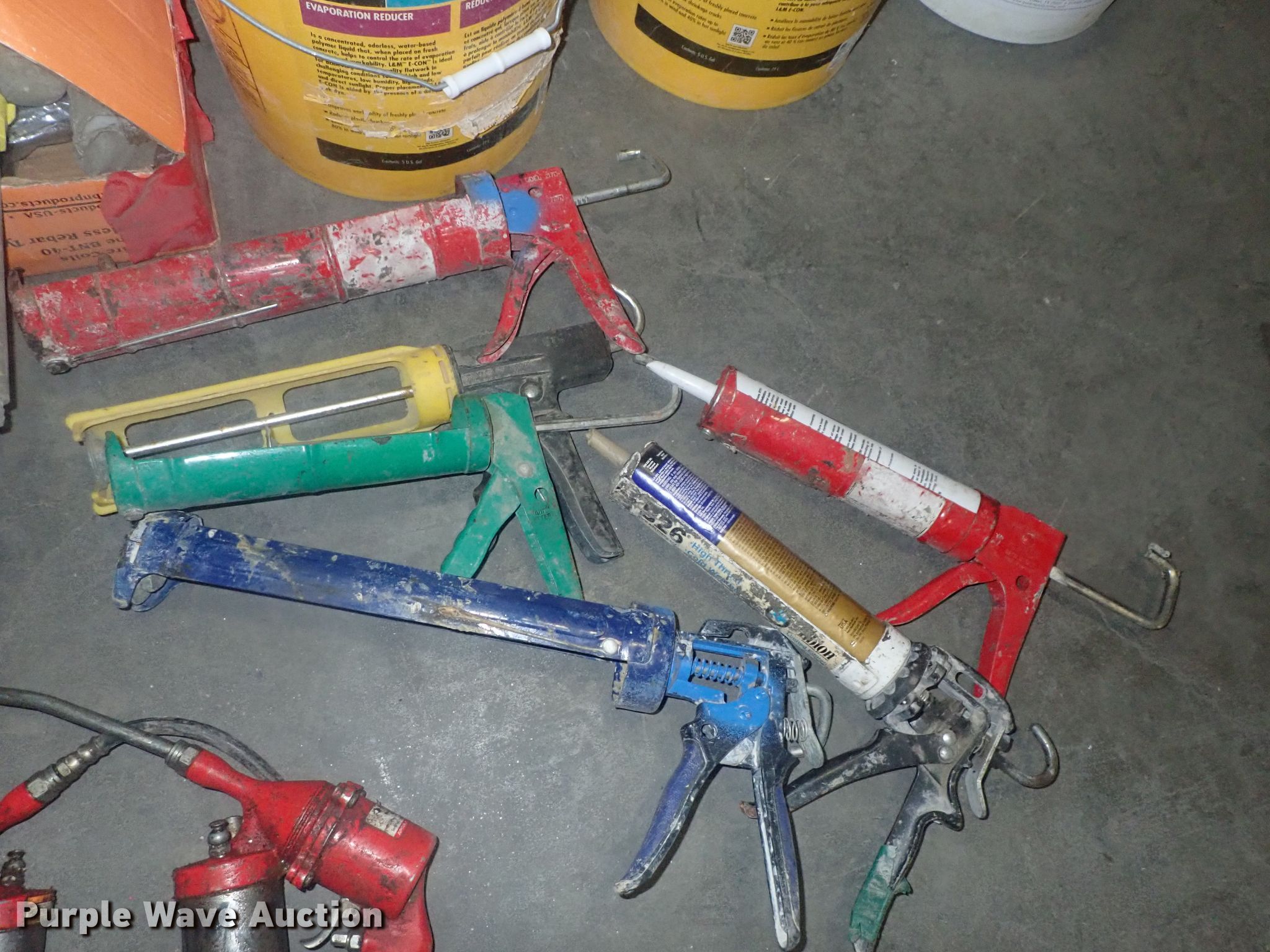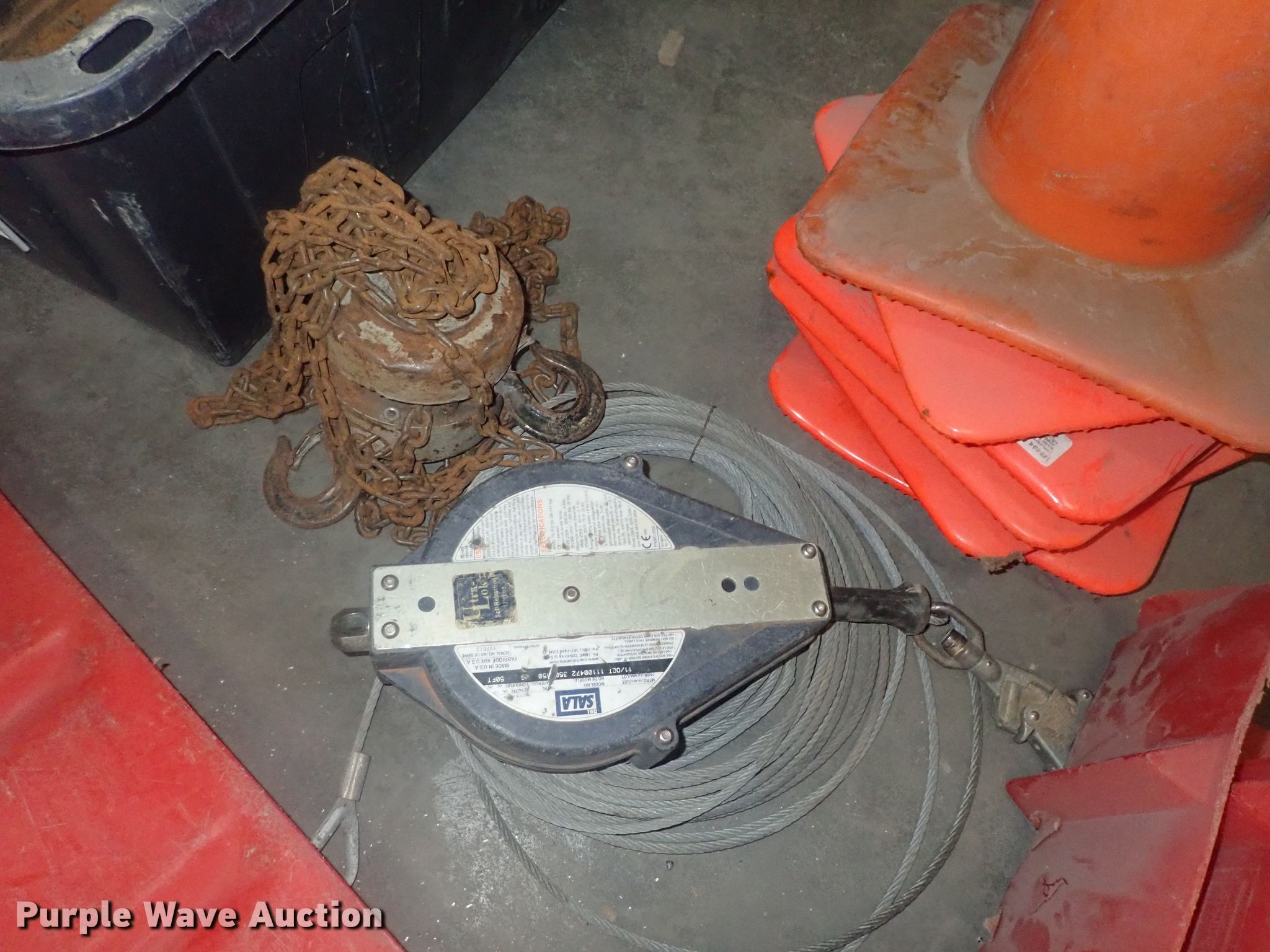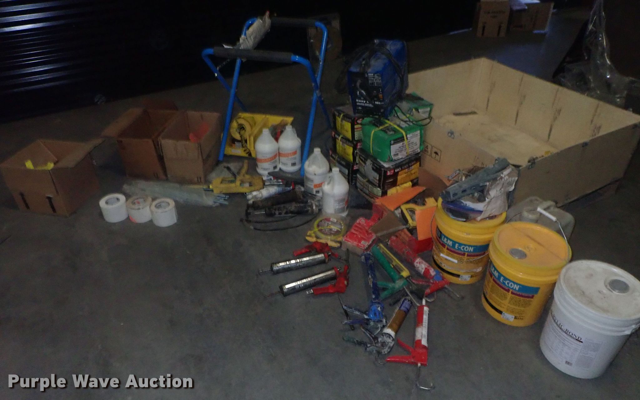 Purple Wave is selling a used Tools in Kansas. This item is a Tools with the following: Safety cones, Loading dock slides, Sala lifeline, Chain hoist, Chain, Sprayers, Cooler, Vacuums, Welding wire, (4) CRL vacuum cups, Hand tools, Air hose, Power cords, Power tools, Pocket formers, Grease guns, Glue guns, CHC Crete, Blades, MIG welder, Duplex nails, Acrylic bond, L&M E-Con and more