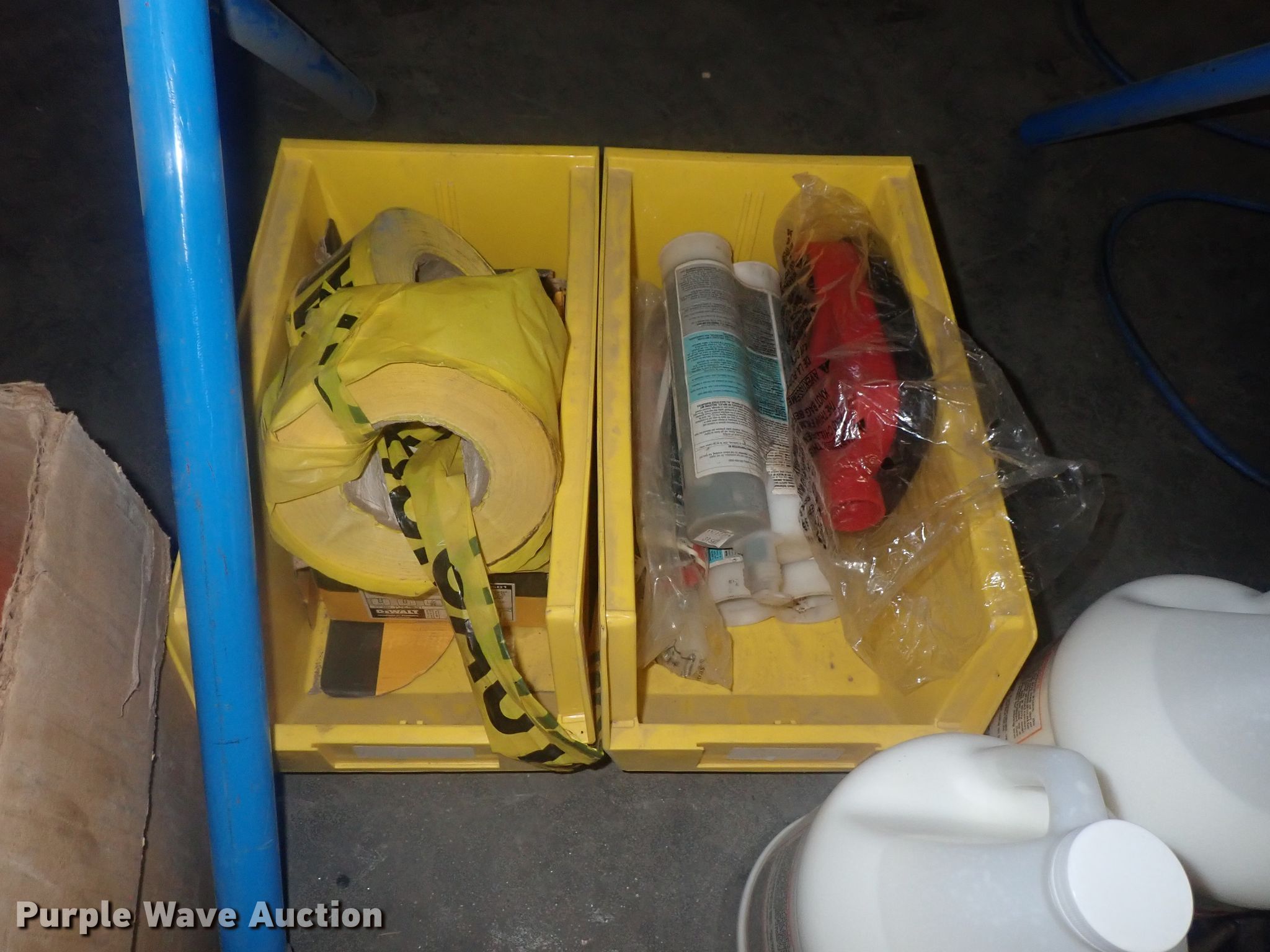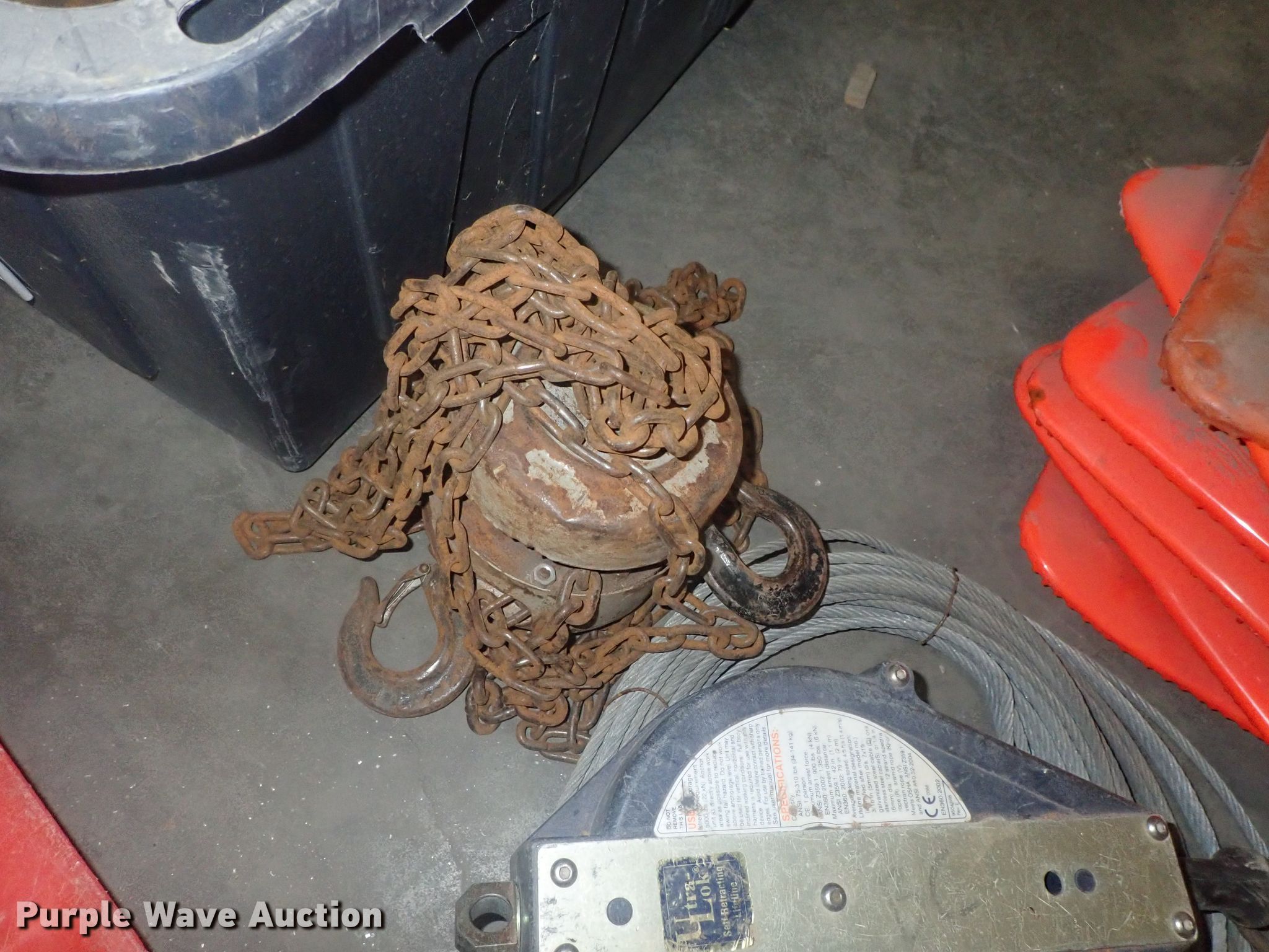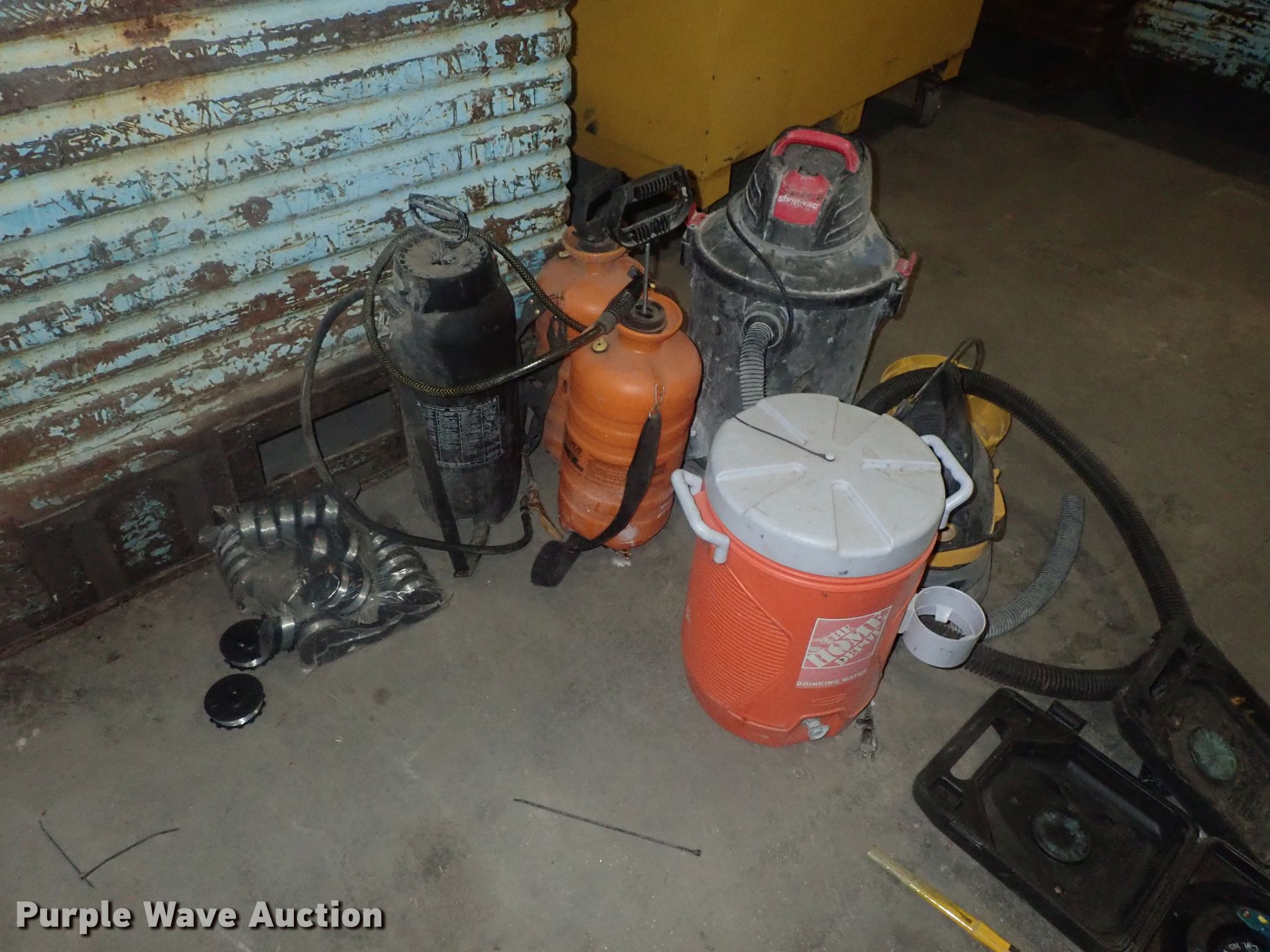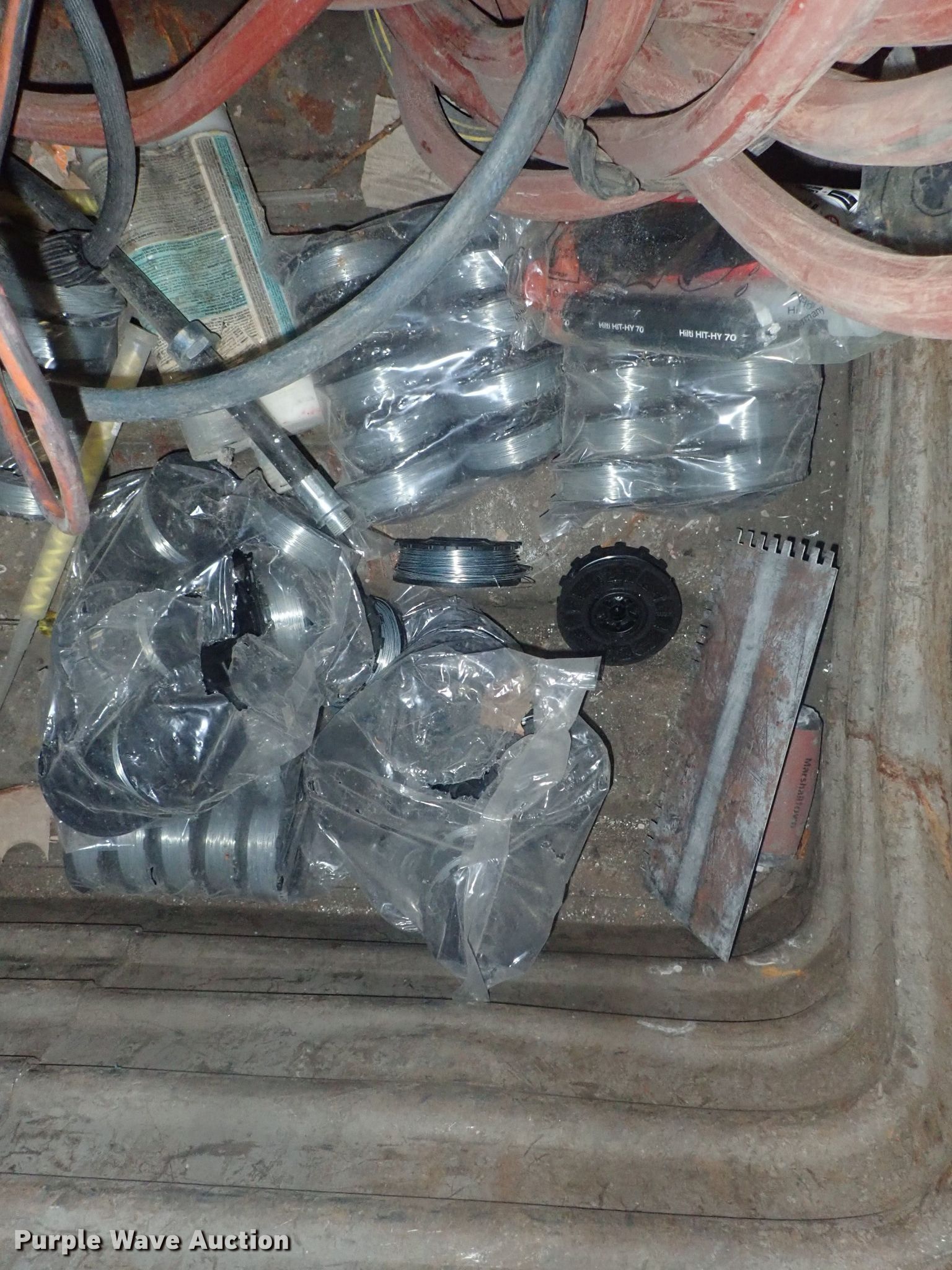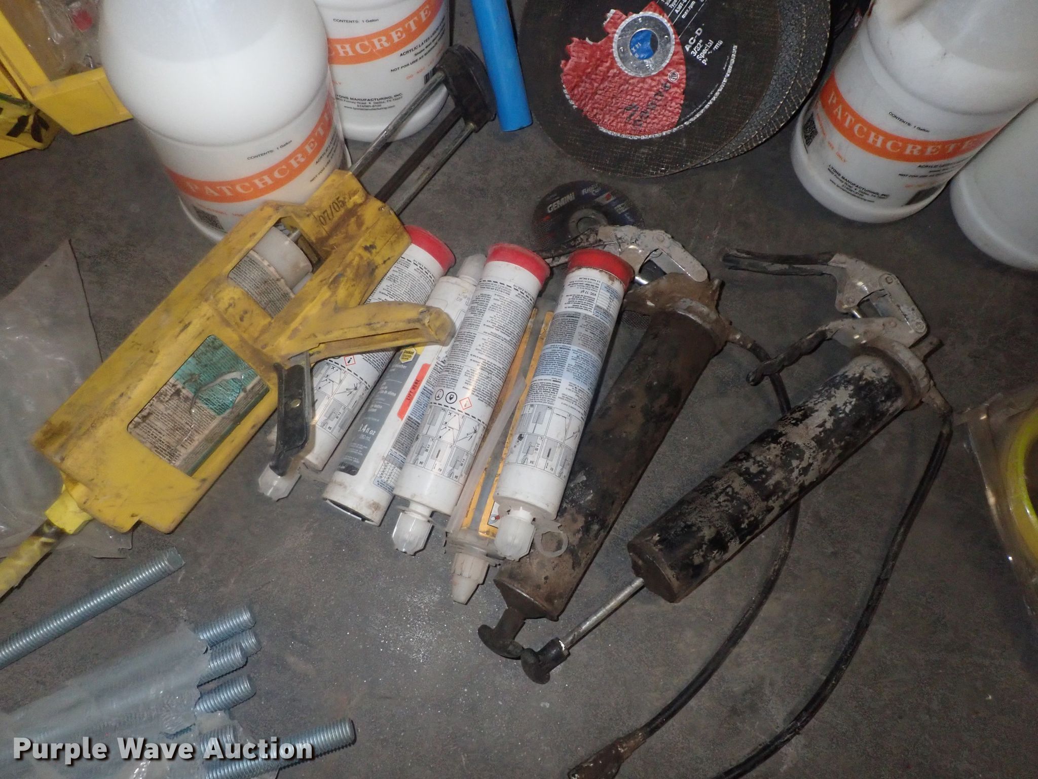 Purple Wave is selling a used Tools in Kansas. This item is a Tools with the following: Safety cones, Loading dock slides, Sala lifeline, Chain hoist, Chain, Sprayers, Cooler, Vacuums, Welding wire, (4) CRL vacuum cups, Hand tools, Air hose, Power cords, Power tools, Pocket formers, Grease guns, Glue guns, CHC Crete, Blades, MIG welder, Duplex nails, Acrylic bond, L&M E-Con and more