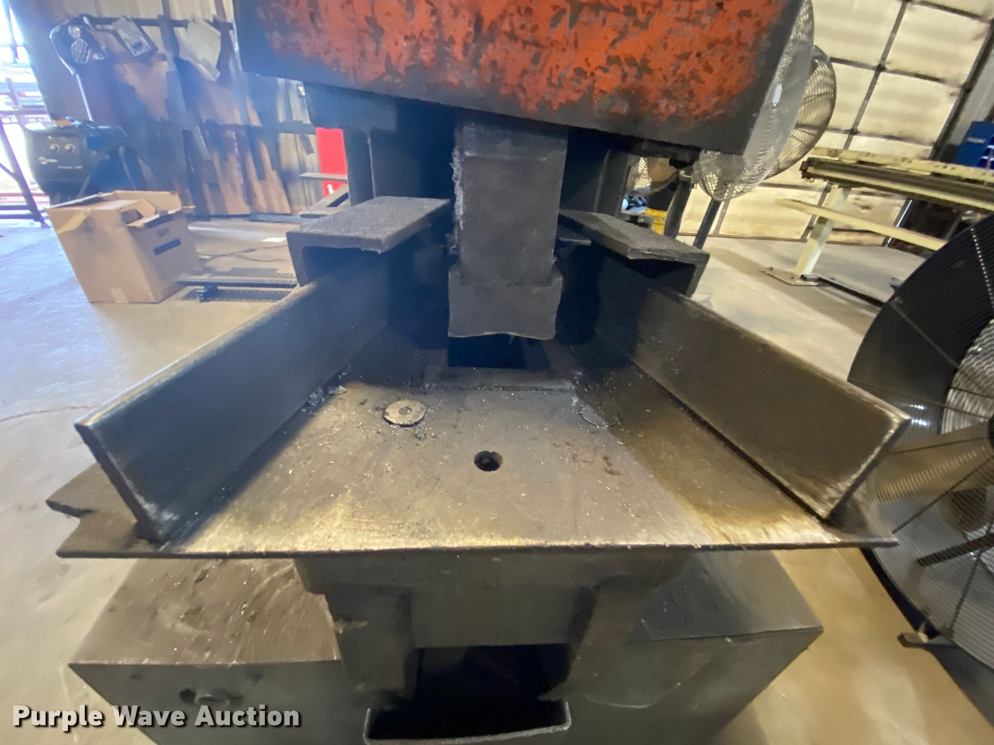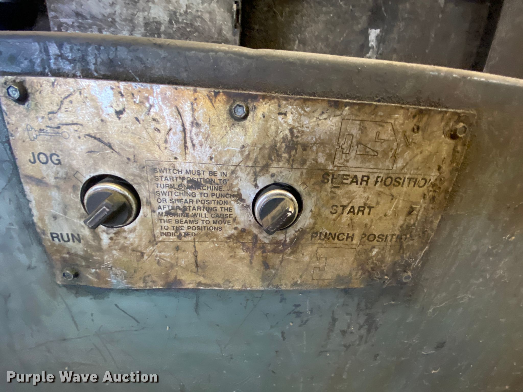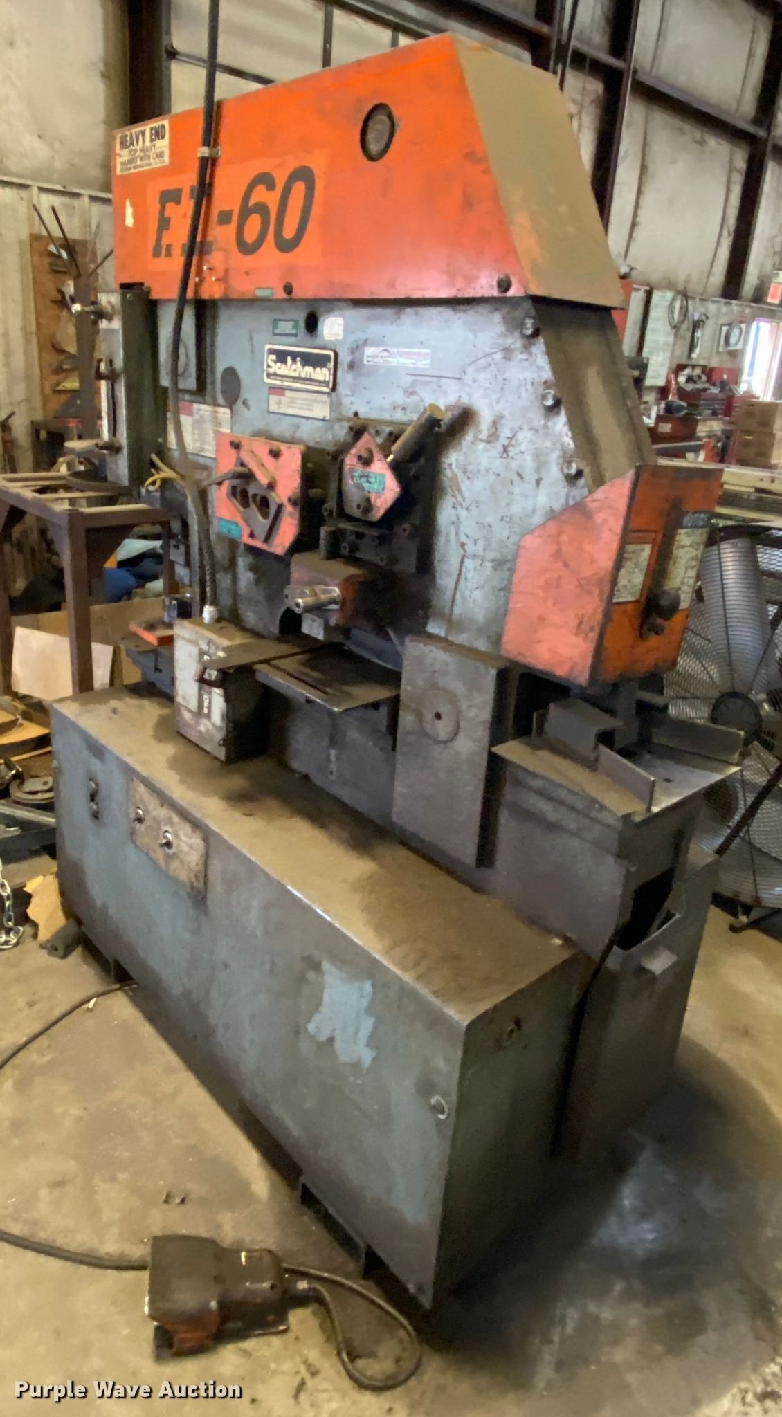 Purple Wave is selling a used Machine Shop Tools and Equip. in Missouri. This item is a Scotchman FI-60 iron worker with the following: 60 ton punching capacity, Punch dies, Punch round holes, Square tube cutter, 1 1/4" diameter max capacity, Round tube cutter, 1 1/4" diameter max capacity, Flat blade for shearing, 14" max cutting width, 3/4" max thickness capacity, Bender dies, 4 x 4 x 1/2" angle iron capacity, Notcher and crop