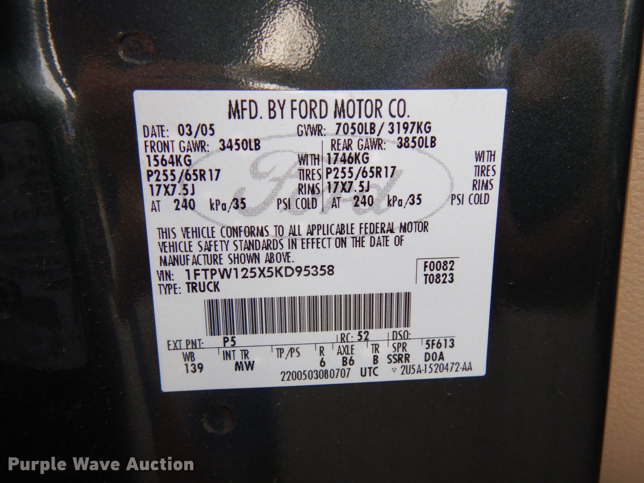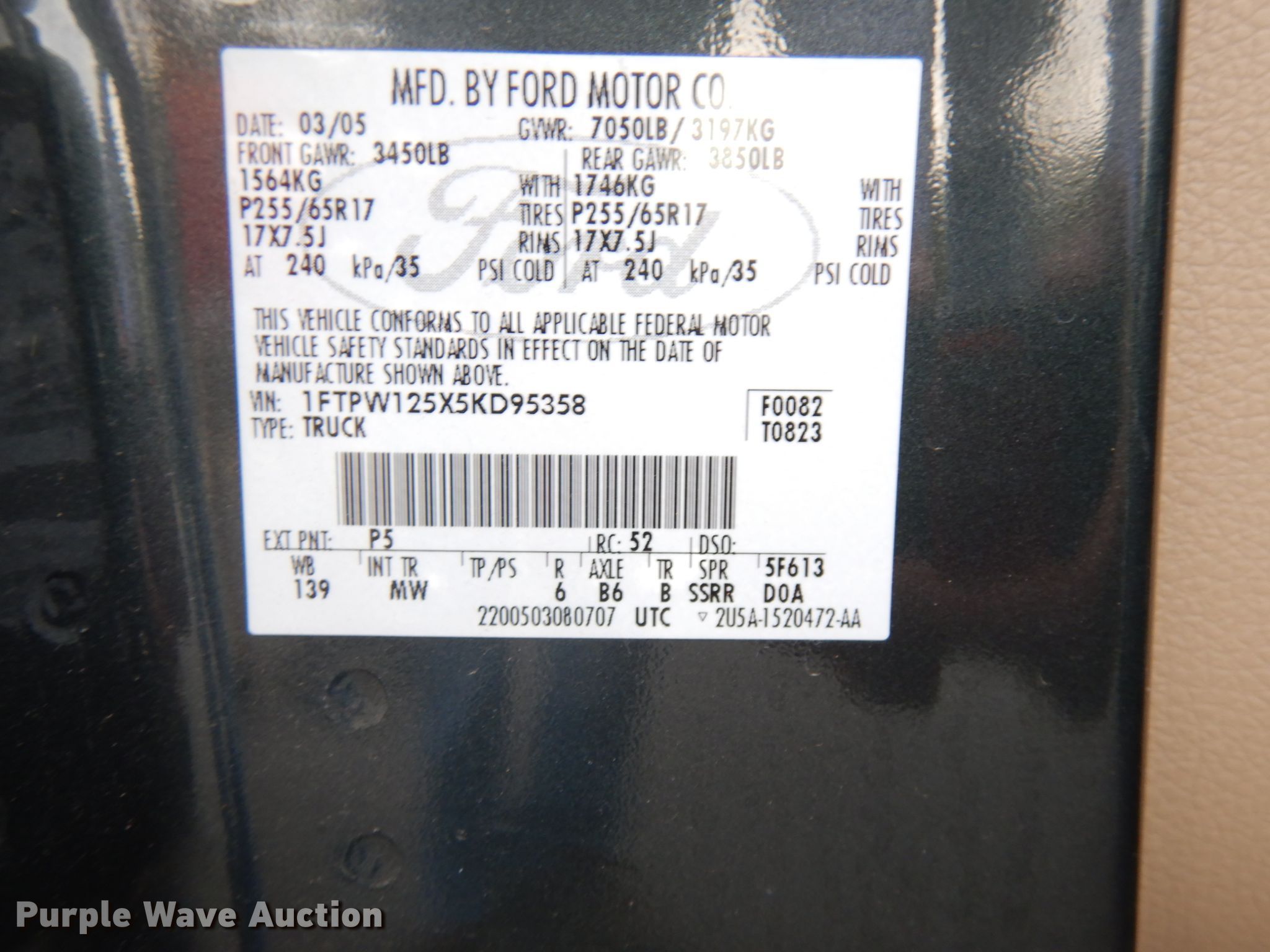 2005 Ford F150 SuperCrew cab pickup truck. 74,943 miles on odometer. Engine Displacement: 5.4L V8 SOHC 16V , Cylinders: 8, Fuel type: Gas. Transmission Automatic. Interior AC, Heat, Power windows, Power locks, Cruise control. Tires Size: 255/65R17. Missouri title. 1FTPW125X5KD95358. 212 SE Crestwood St. Lee's Summit, MO 64063