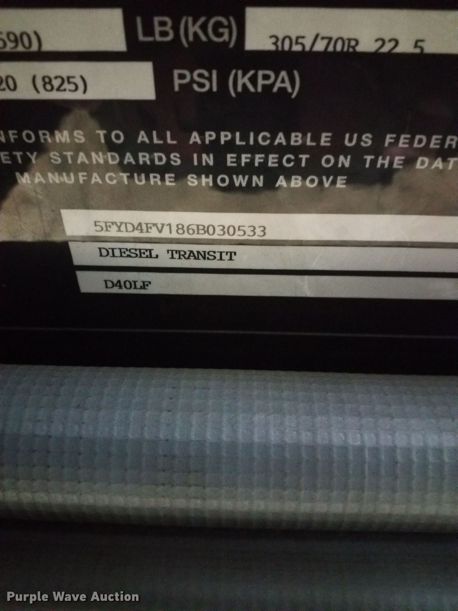 2006 New Flyer D40LF shuttle bus. 275,470 miles on odometer. Engine Cummins, Displacement: 8.3L, Cylinders: 6, Fuel type: Diesel. Transmission Automatic. Chassis Axles: Single, Suspension: Air, Brakes: Air, GVWR: 14,780 lbs. Interior AC, Heat, Electric passenger sliding door, Passengers: 38, Seats Adult seats: 38, Wheelchair lift. Tires Size: 305/70R22.5. Notes Non-operational ramp. Minnesota title. Seller is a Minnesota licensed motor vehicle dealer. The buyer may be required to pay sales tax and/or registration fees to the dealer prior to taking possession. Title will be assigned and distributed by the dealer. Please contact the seller for distribution questions. 5FYD4FV186B030533. Hutchinson, MN 55350