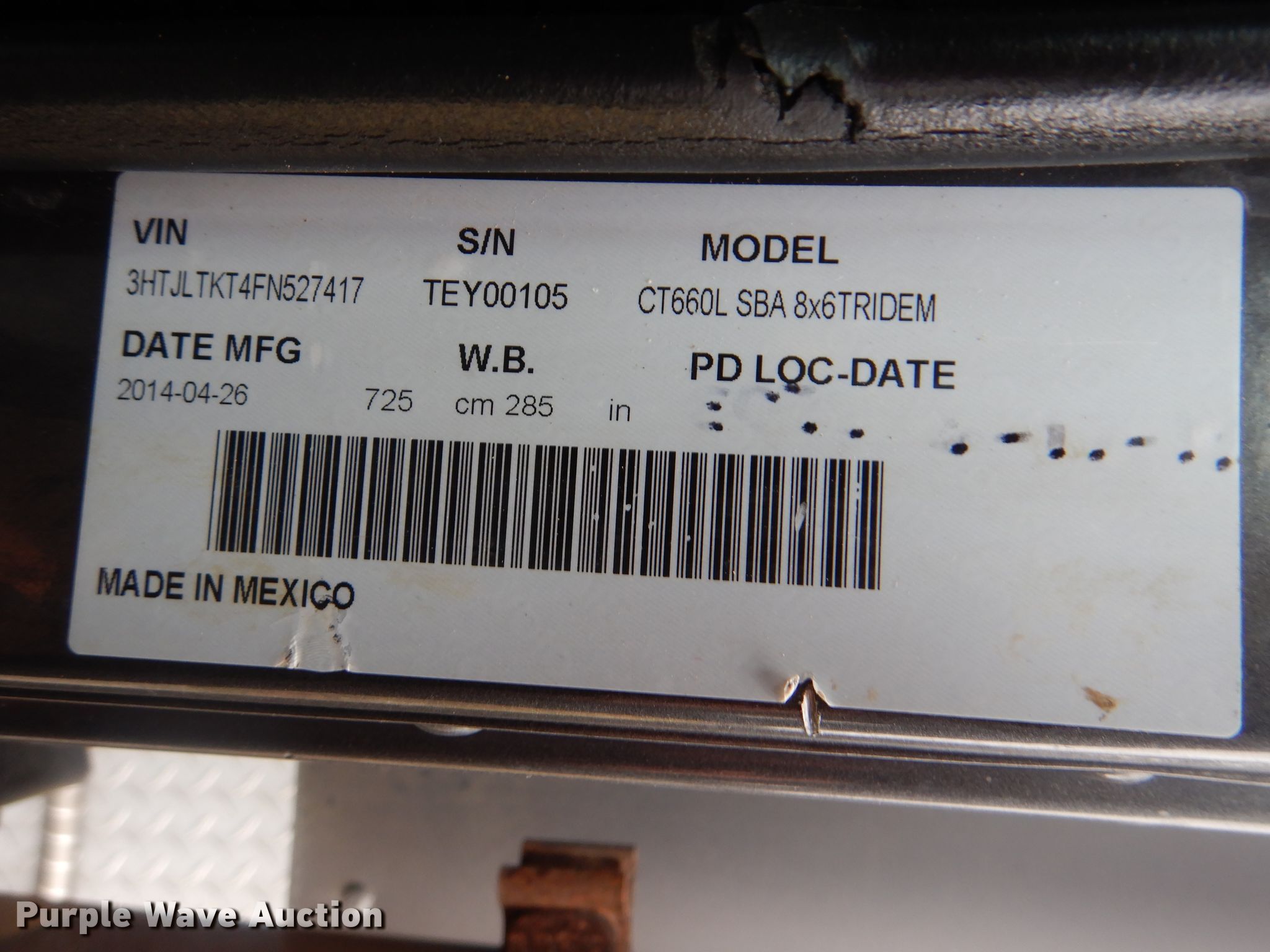 2015 Caterpillar CT660 vacuum truck. 75,297 miles on odometer. Engine Caterpillar C13, Displacement: 13.0L, Cylinders: 6, Fuel type: Diesel, HP: 475. Transmission Automatic. Chassis Axles: Triple, Differential lock: Inter-axle, Suspension: Spring, Brakes: Air, PTO, GVWR: 72,998 lbs, Wheelbase: 285". Interior AC, Heat, Heated mirrors, Cruise control. Operational Bed/ tank Kaiser Premium CV200, Capacity: 13.5 cu.yd., Water pump Caterpillar 3560, PSI: 3000, GPM: 20, Vacuum pump Robuschi RB-DV-145, CFM: 6600, Water heater Epps Products 3007HVPREM, PSI: 3,500, BTU: 700,000, Robuschi blower SCFM: 6,250, 48" power sweep, Hose reel Diameter: 8", Length: 32', Telescopic boom Diameter: 8".. Tires Size: 425/65R22.5. Notes Check engine light on. Oklahoma title. Distribution of ownership documentation may be delayed up to 30 days from verification of funds. 3HTJLTKT4FN527417. 15601 N. 145th E. Ave. Collinsville, OK 74021