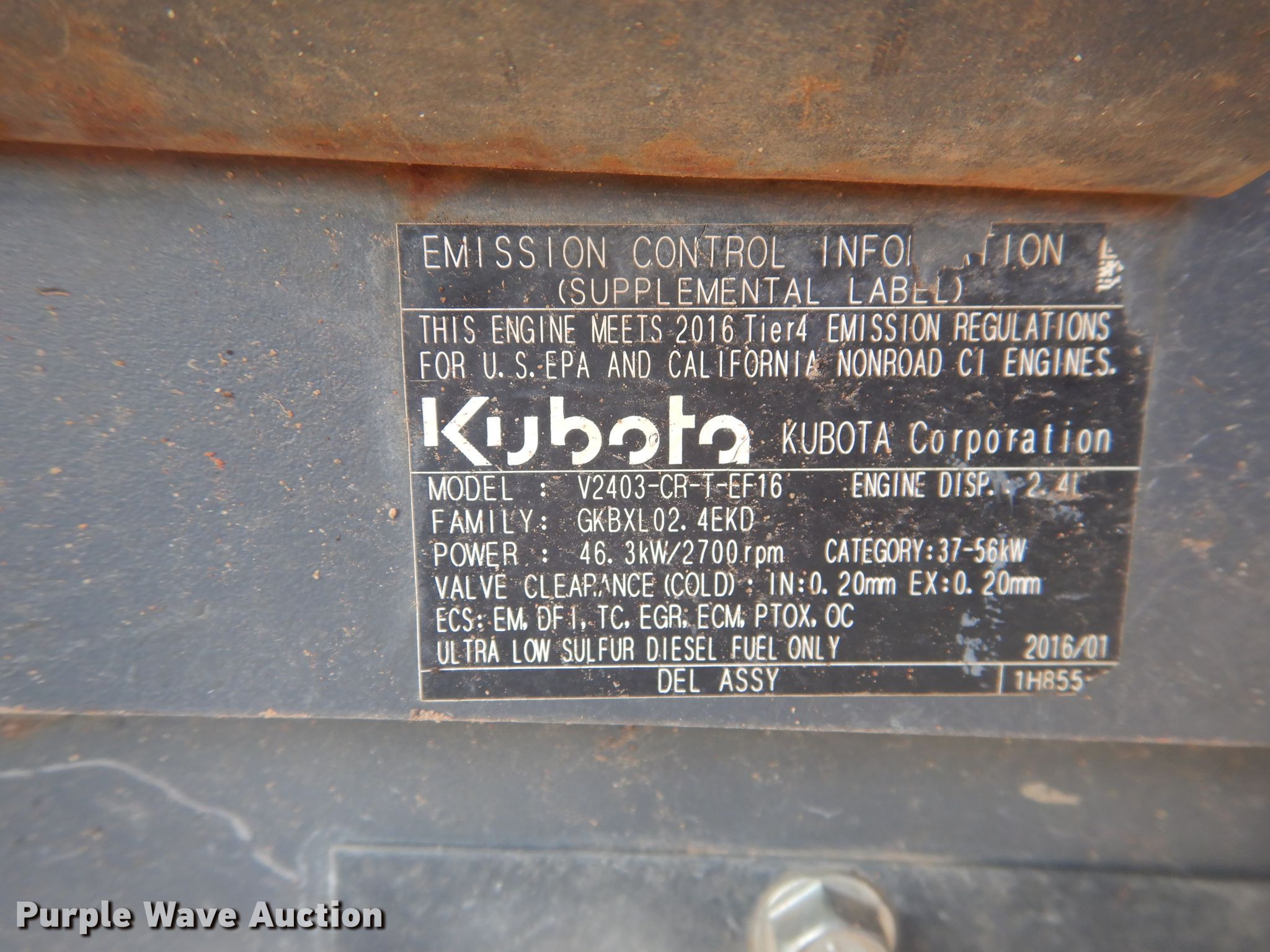 2018 Kubota M62 backhoe. 709 hours on meter, Serial: 50145. Engine Kubota V2403-CR-T-EF16, Displacement: 2.4L, Cylinders: 4, Fuel type: Diesel, kW: 46.3. Transmission Hydrostatic, Speeds: 3. Chassis Four wheel drive, Differential lock. Operators station Backhoe controls: Wobble stick / two stick. Operational Loader Quick coupler: Manual, Bucket Kubota TL34217, Width: 83", Cutting edge: Bolt-on, Backhoe bucket Kubota , Width: 18", Cutting edge: Weld-on Teeth: 4, Thumb. Tires Front: 10-16.5 NHS, Rear: 17.5L-24, Brand: Titan. Notes Emissions warranty expires 9/13/2023 or 3,000 hours. Great Plains Kubota - Open inspection Dec. 12 and Dec. 15. 2548 Melba Lane. Norman, OK 73072