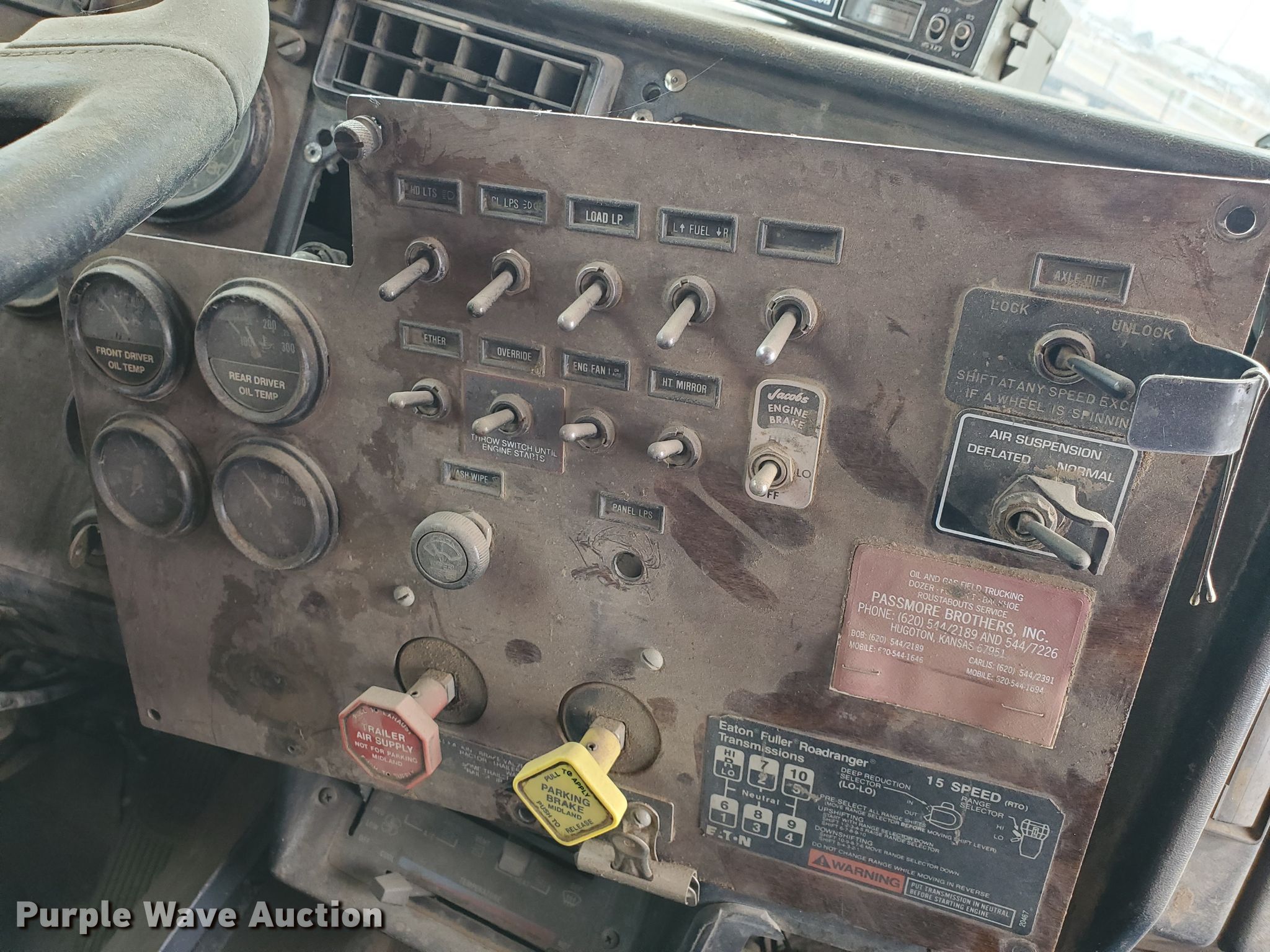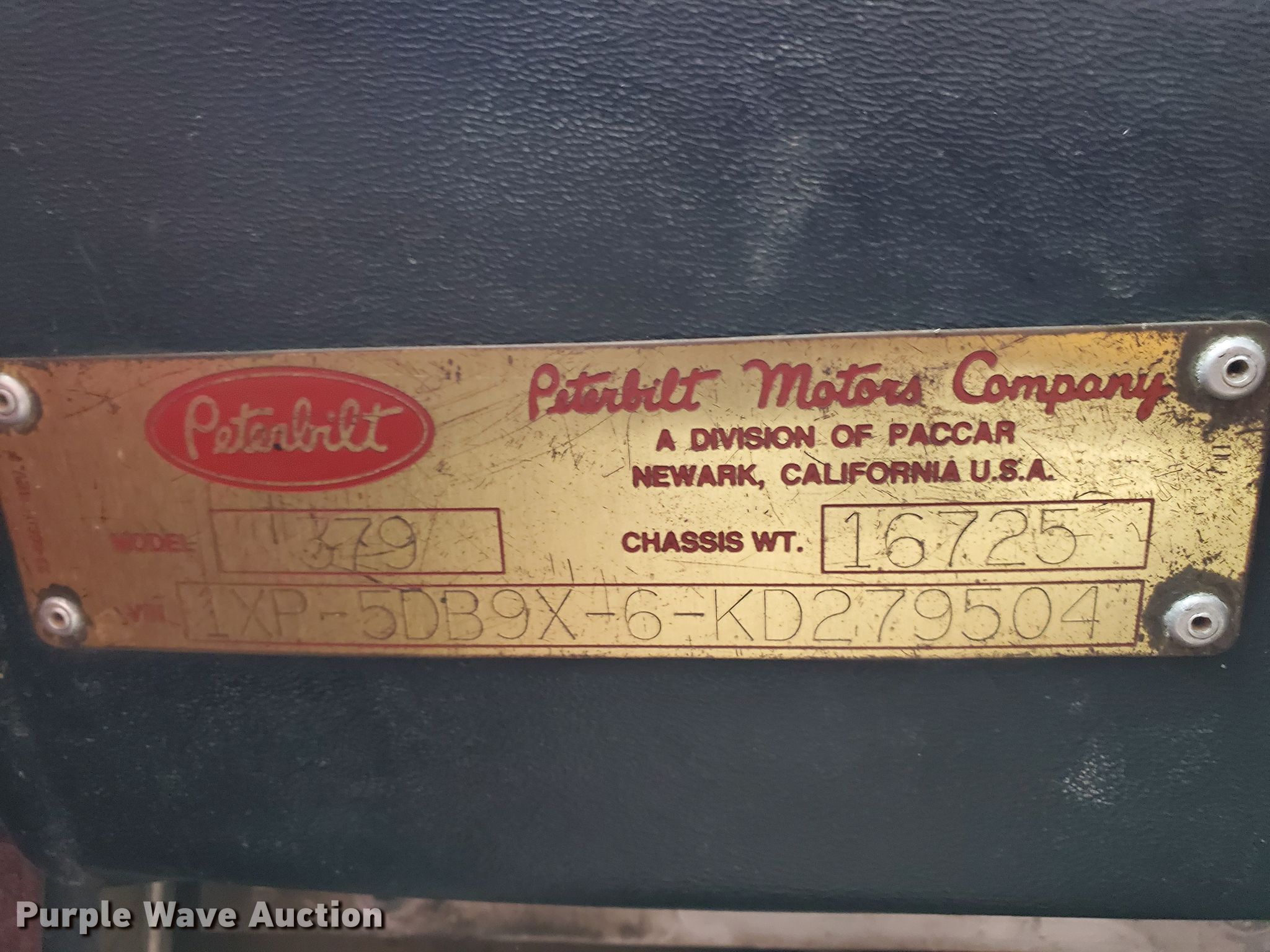 1989 Peterbilt 379 semi truck. 274,675 miles on odometer, Unit #: 61. Engine Caterpillar 3406B, Displacement: 14.6L, Cylinders: 6, Fuel type: Diesel, HP: 425. Transmission Eaton Fuller, Manual, Speed: 15. Chassis Axles: Tandem, Suspension: Air, Brakes: Air. Interior AC, Heat, Dump valves. Operational Fifth wheel type: Air operated, Sliding, Fuel tank: Single. Notes Wrecked Parts missing, Non-operational unit. Kansas title. 1XP5DB9X6KD279504. Passmore Bros., Inc. - Open inspection Dec. 3. 828 E 11th St. Hugoton, KS 67951