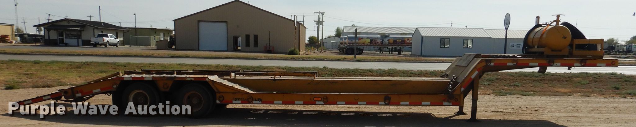 1996 Dynaweld drop deck equipment trailer. 49'L x 8'5"W overall, 9'L top deck, 19'L x 8'5"W steel main deck, 8'L rear deck, 3' tail length, 4'L ramps, Auxiliary fuel tank, Dual leg landing gear, Spring suspension, Air brakes, Tandem axle, Steel wheels, 245/70R17.5 itres, GVWR 85,500 lbs, GAWR 25,000 lbs, Unit# 127. Kansas title. 4U181DFX2T1X33478. Passmore Bros., Inc. - Open inspection Dec. 3. 828 E 11th St. Hugoton, KS 67951