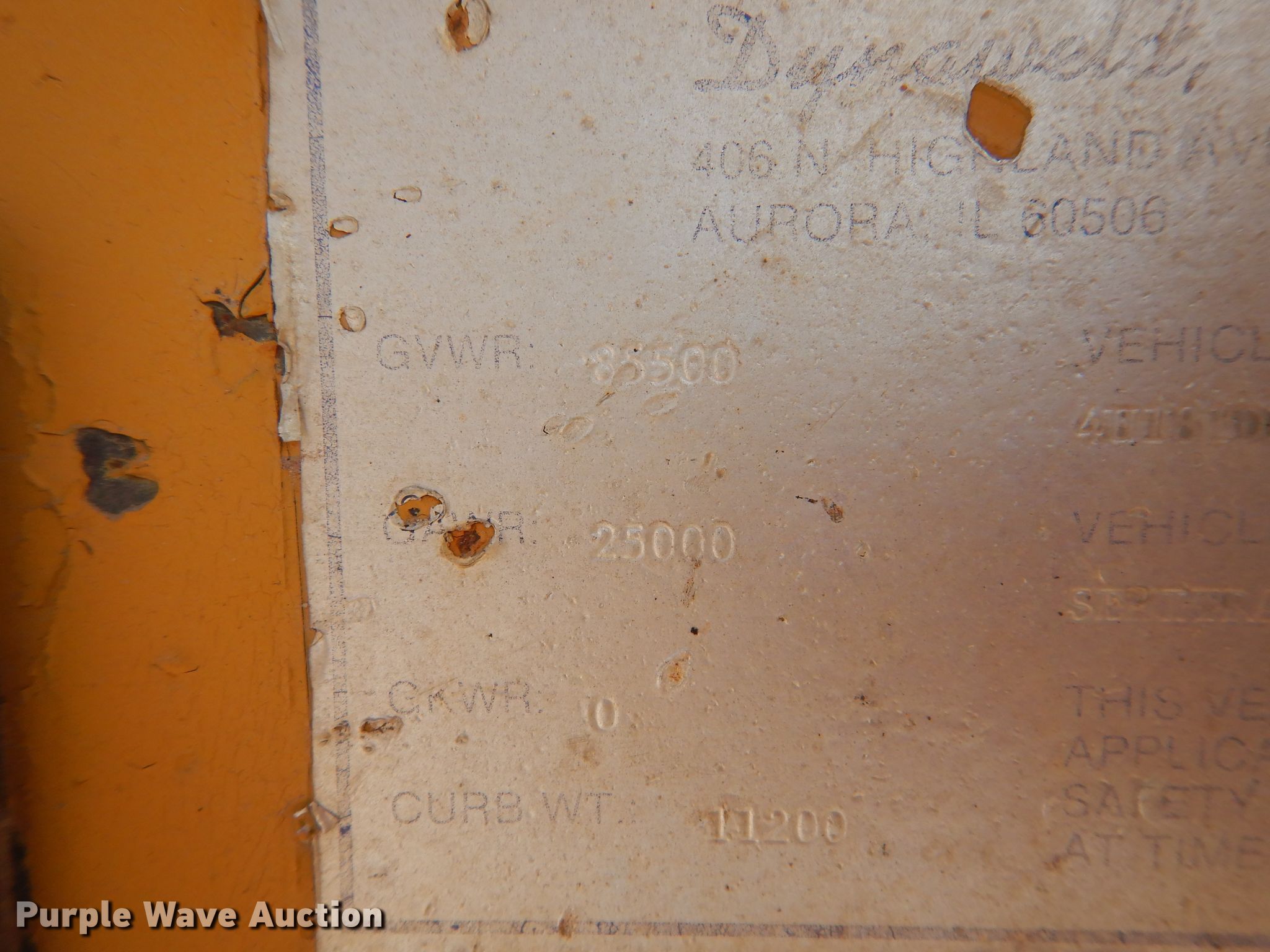 Purple Wave is selling a used Equip. Trailer in Kansas. This item is a 1996 Dynaweld drop deck equipment trailer with the following: 49'L x 8'5"W overall, 9'L top deck, 19'L x 8'5"W steel main deck, 8'L rear deck, 3' tail length, 4'L ramps, Auxiliary fuel tank, Dual leg landing gear, Spring suspension, Air brakes, Tandem axle, Steel wheels, 245/70R17.5 itres, GVWR 85,500 lbs, GAWR 25,000 lbs, Unit# 127