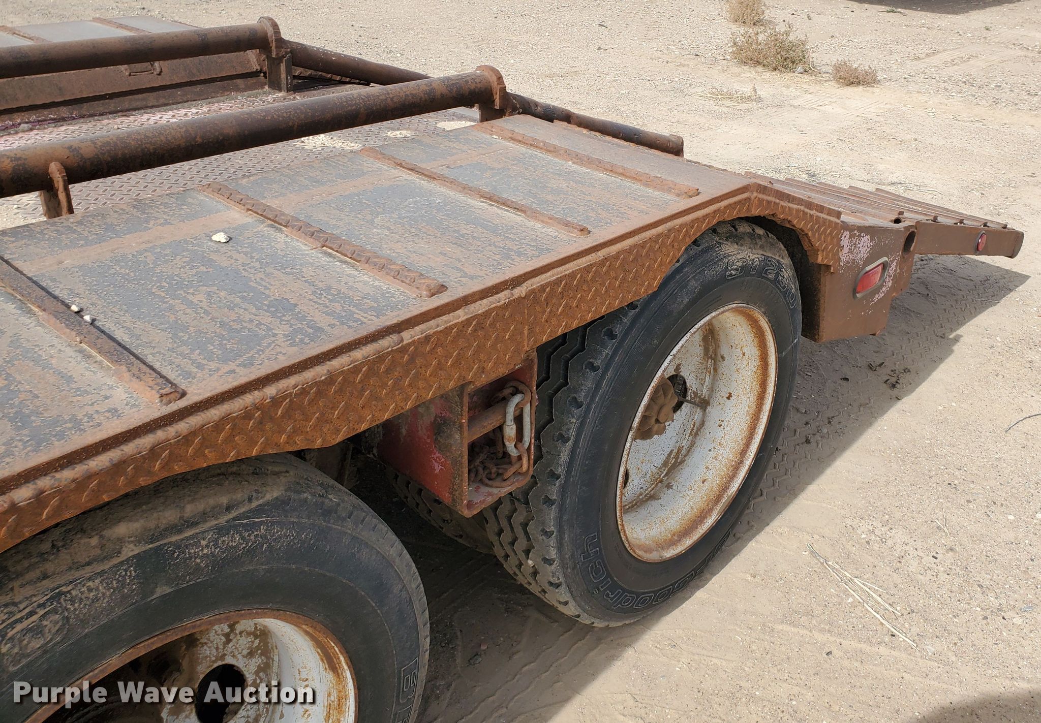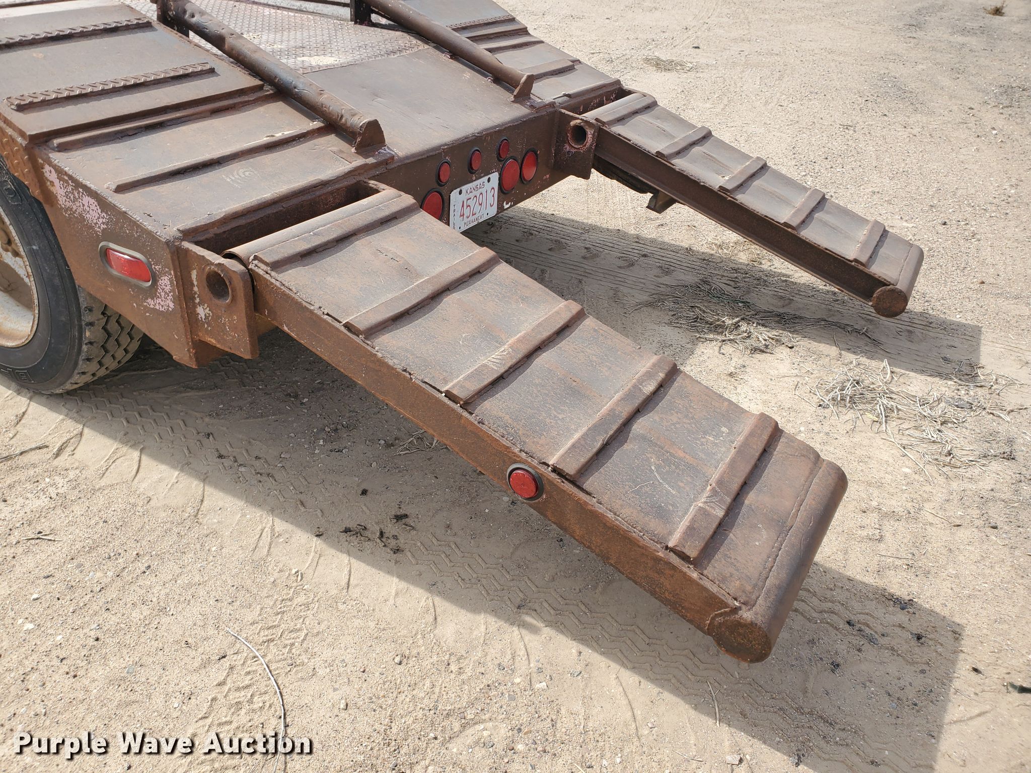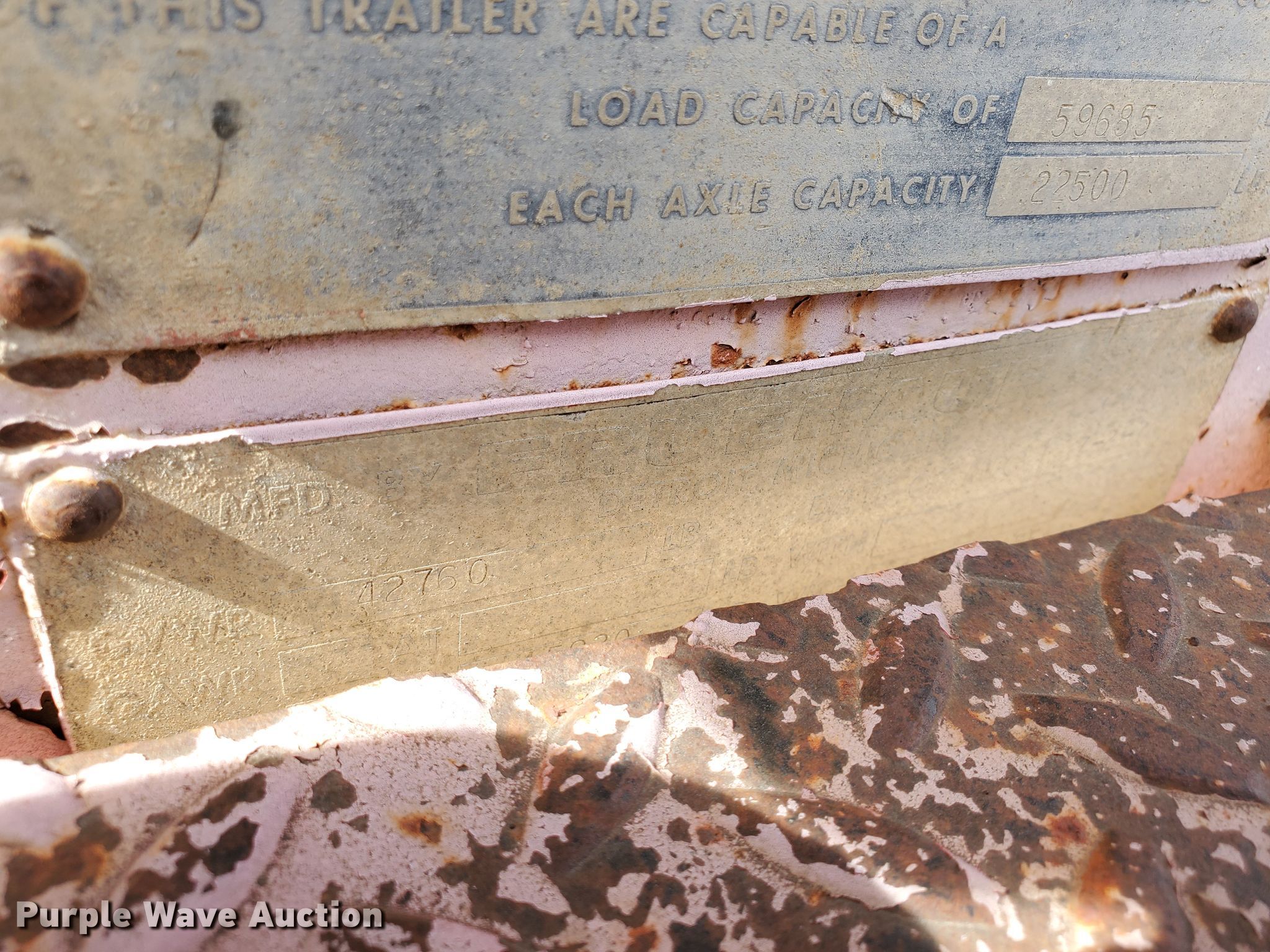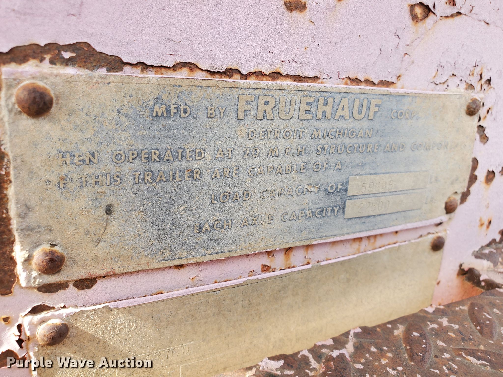 Purple Wave is selling a used Equip. Trailer in Kansas. This item is a 1976 Fruehauf C25L-J2 equipment trailer with the following: 33'L x 96"W overall, 21'L deck, 36" floor height, 4' tail length, 4'L ramps, Steel and wood deck, Dual leg landing gear, Spring suspension, Air brakes, Tandem axle, Steel wheels, 255/70R22.5 tires, GVWR 42,760 lbs, GAWR 15,920 lbs, Unit# 101