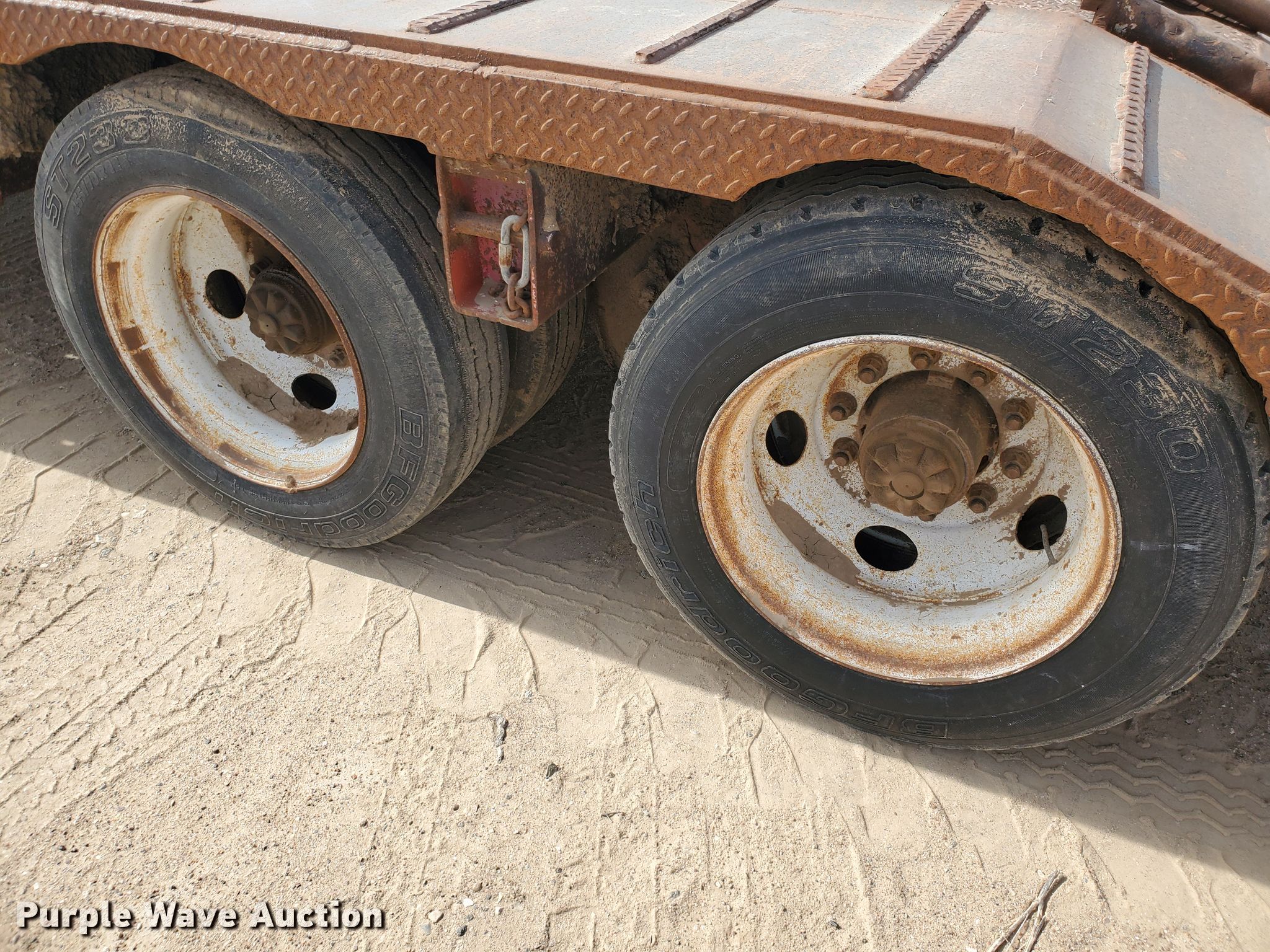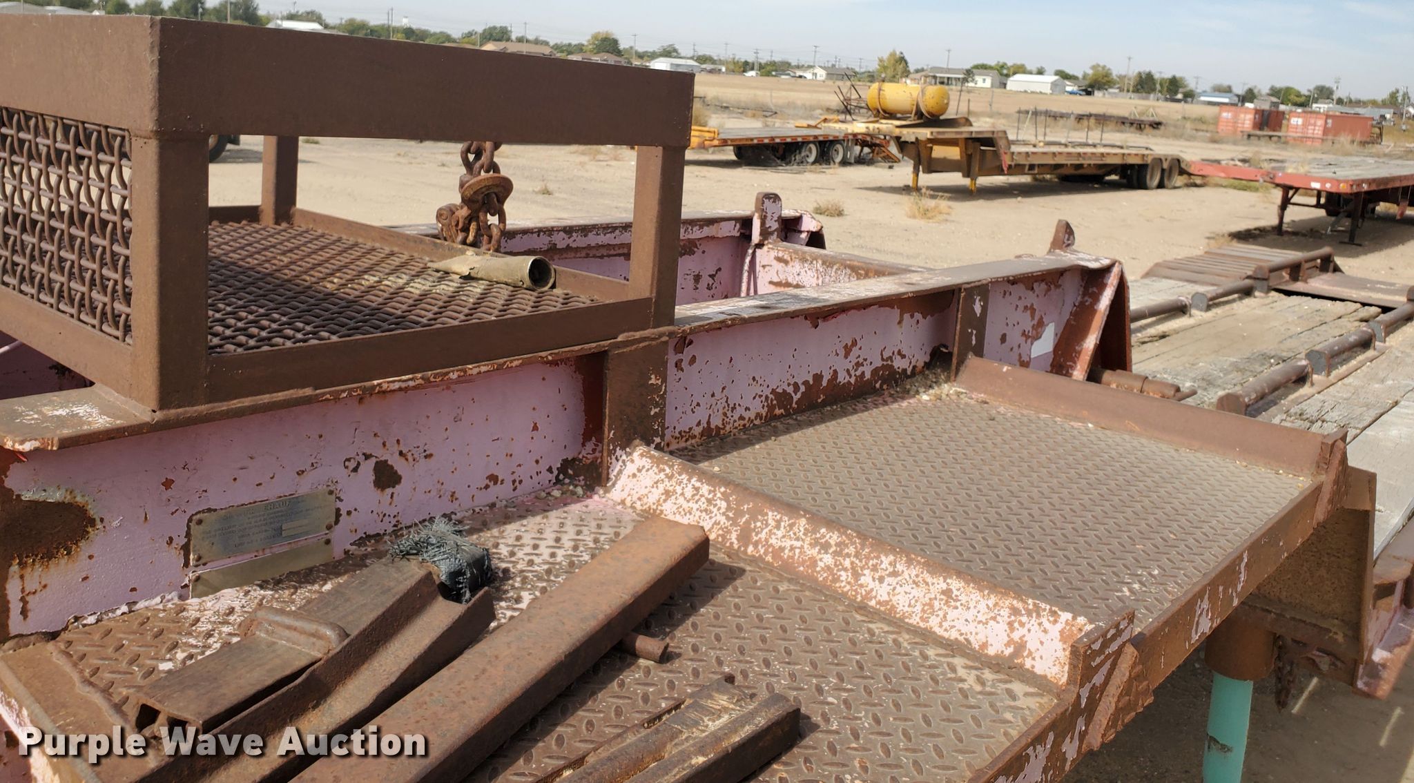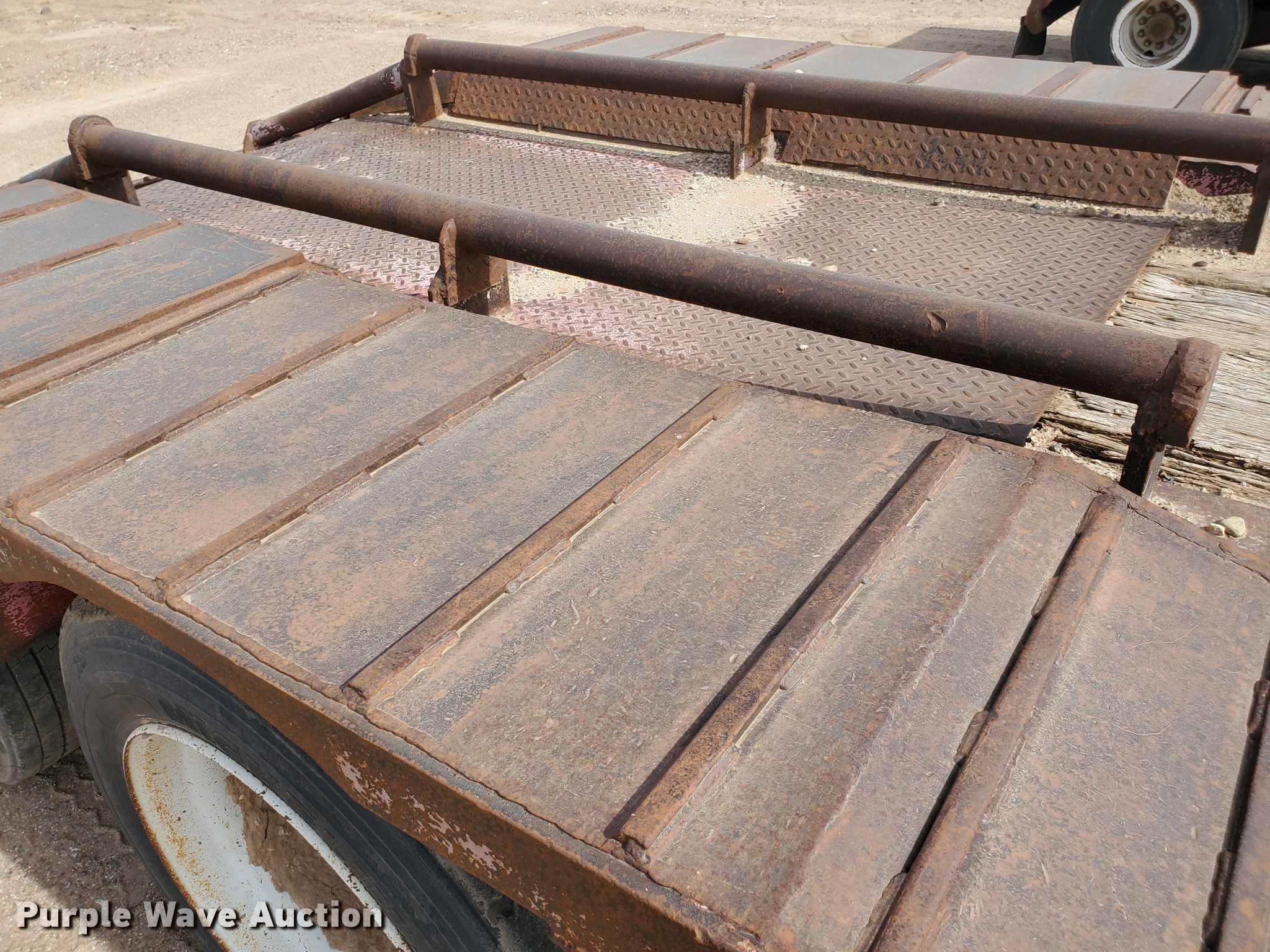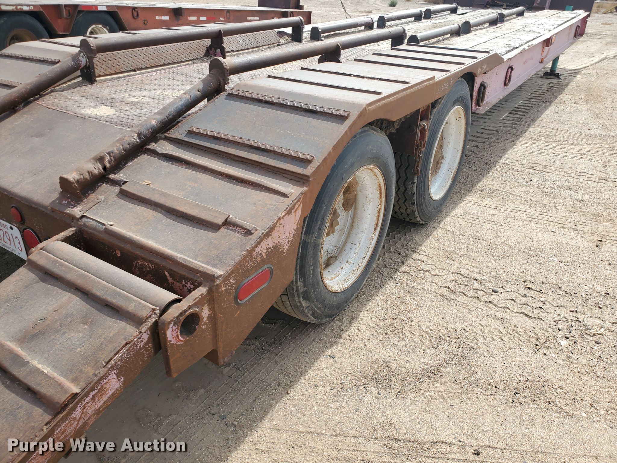 Purple Wave is selling a used Equip. Trailer in Kansas. This item is a 1976 Fruehauf C25L-J2 equipment trailer with the following: 33'L x 96"W overall, 21'L deck, 36" floor height, 4' tail length, 4'L ramps, Steel and wood deck, Dual leg landing gear, Spring suspension, Air brakes, Tandem axle, Steel wheels, 255/70R22.5 tires, GVWR 42,760 lbs, GAWR 15,920 lbs, Unit# 101