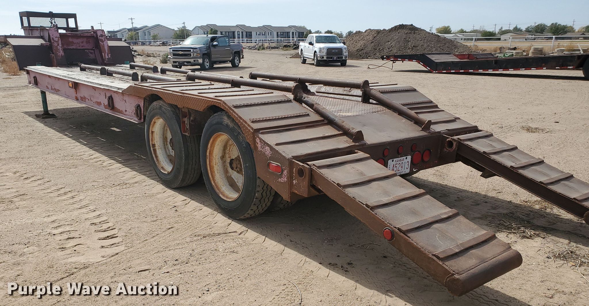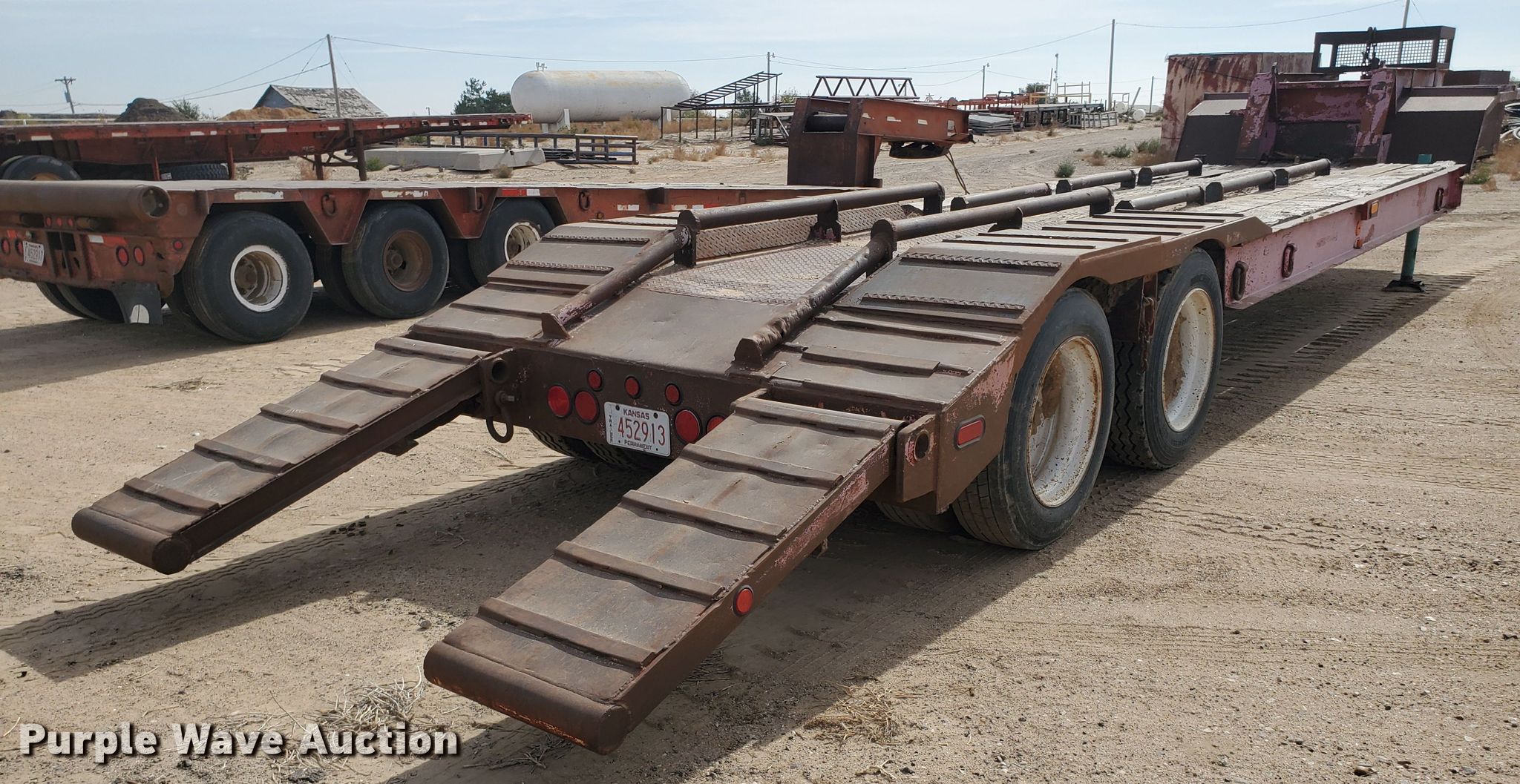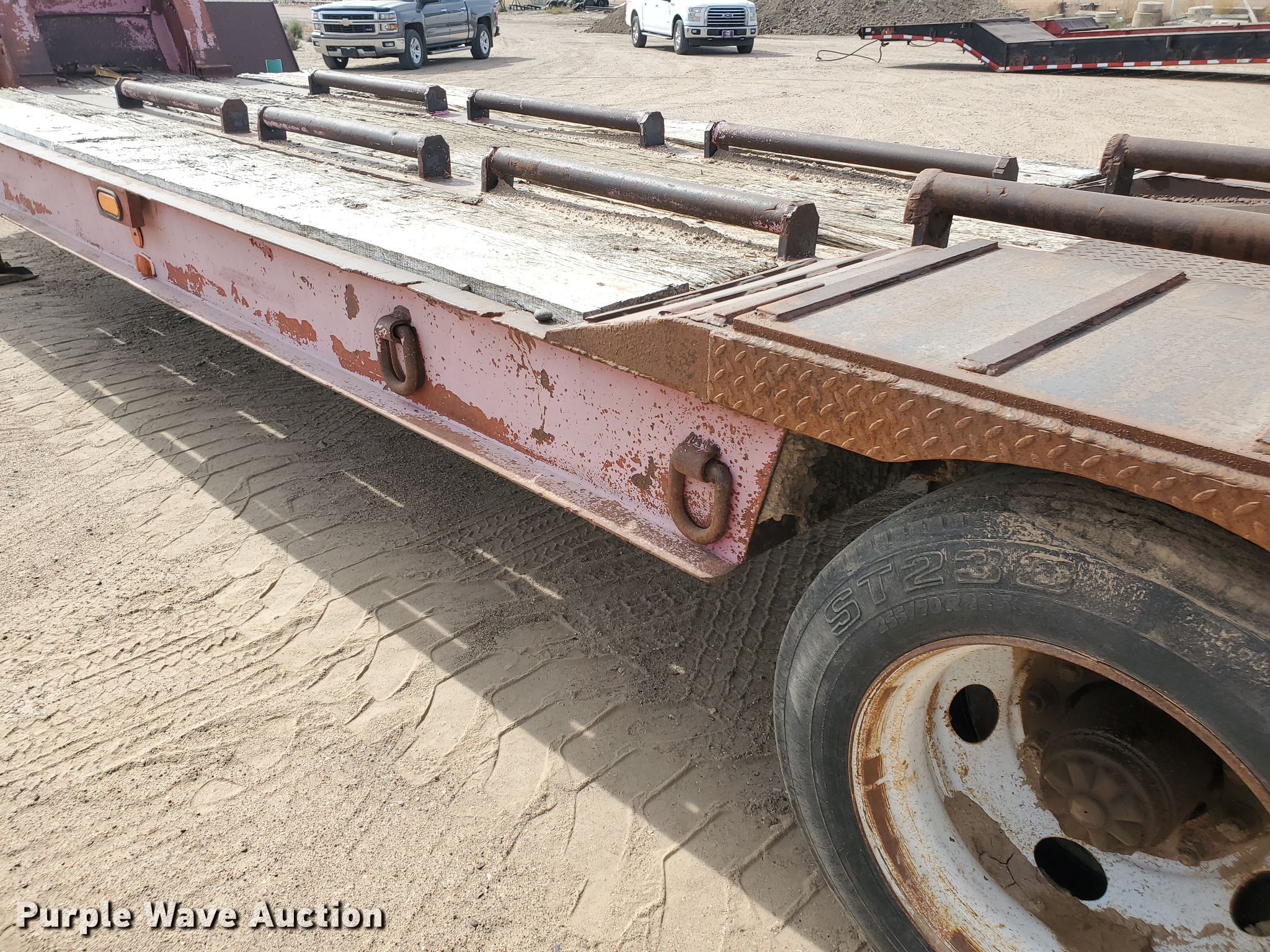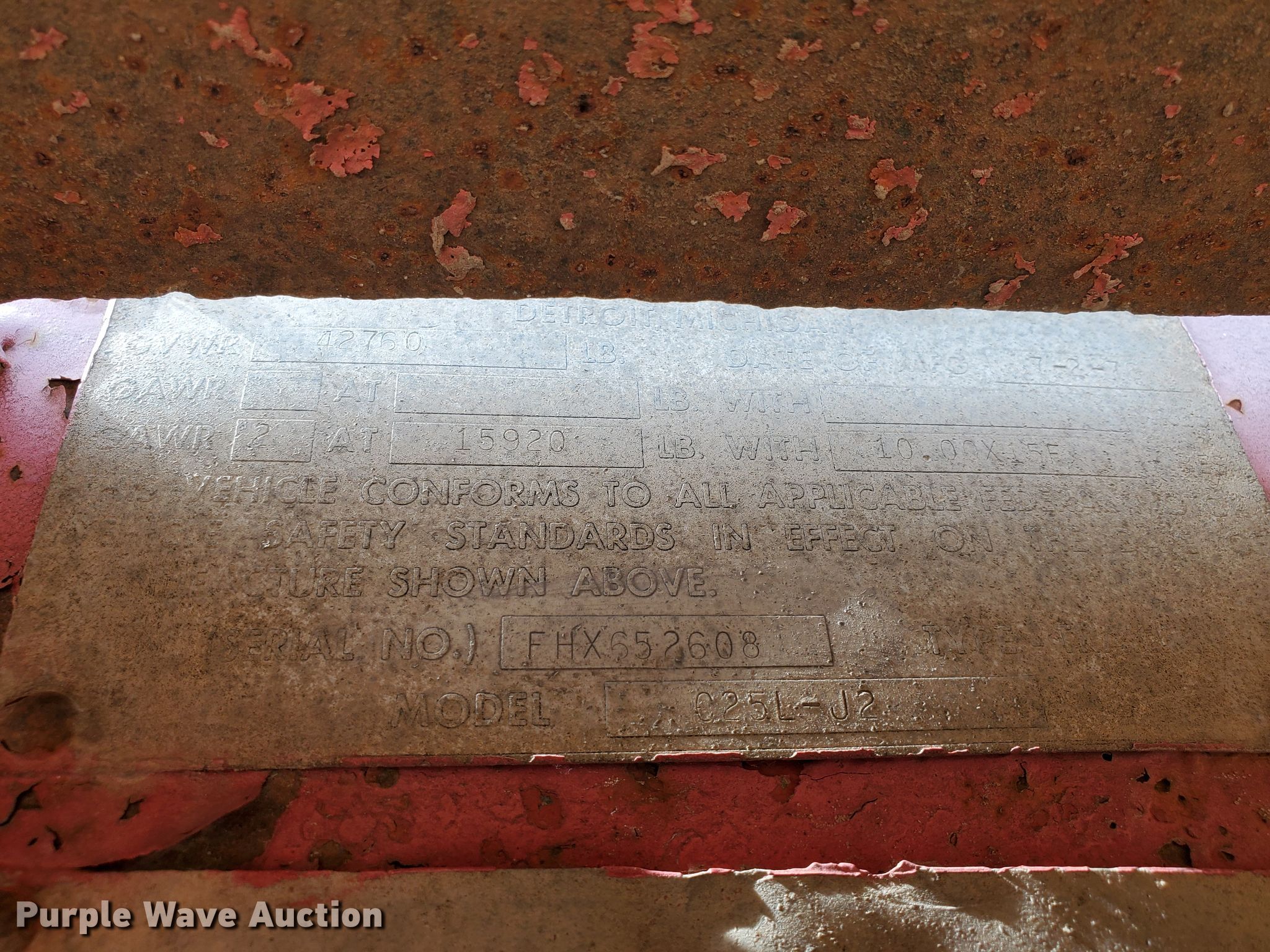 Purple Wave is selling a used Equip. Trailer in Kansas. This item is a 1976 Fruehauf C25L-J2 equipment trailer with the following: 33'L x 96"W overall, 21'L deck, 36" floor height, 4' tail length, 4'L ramps, Steel and wood deck, Dual leg landing gear, Spring suspension, Air brakes, Tandem axle, Steel wheels, 255/70R22.5 tires, GVWR 42,760 lbs, GAWR 15,920 lbs, Unit# 101