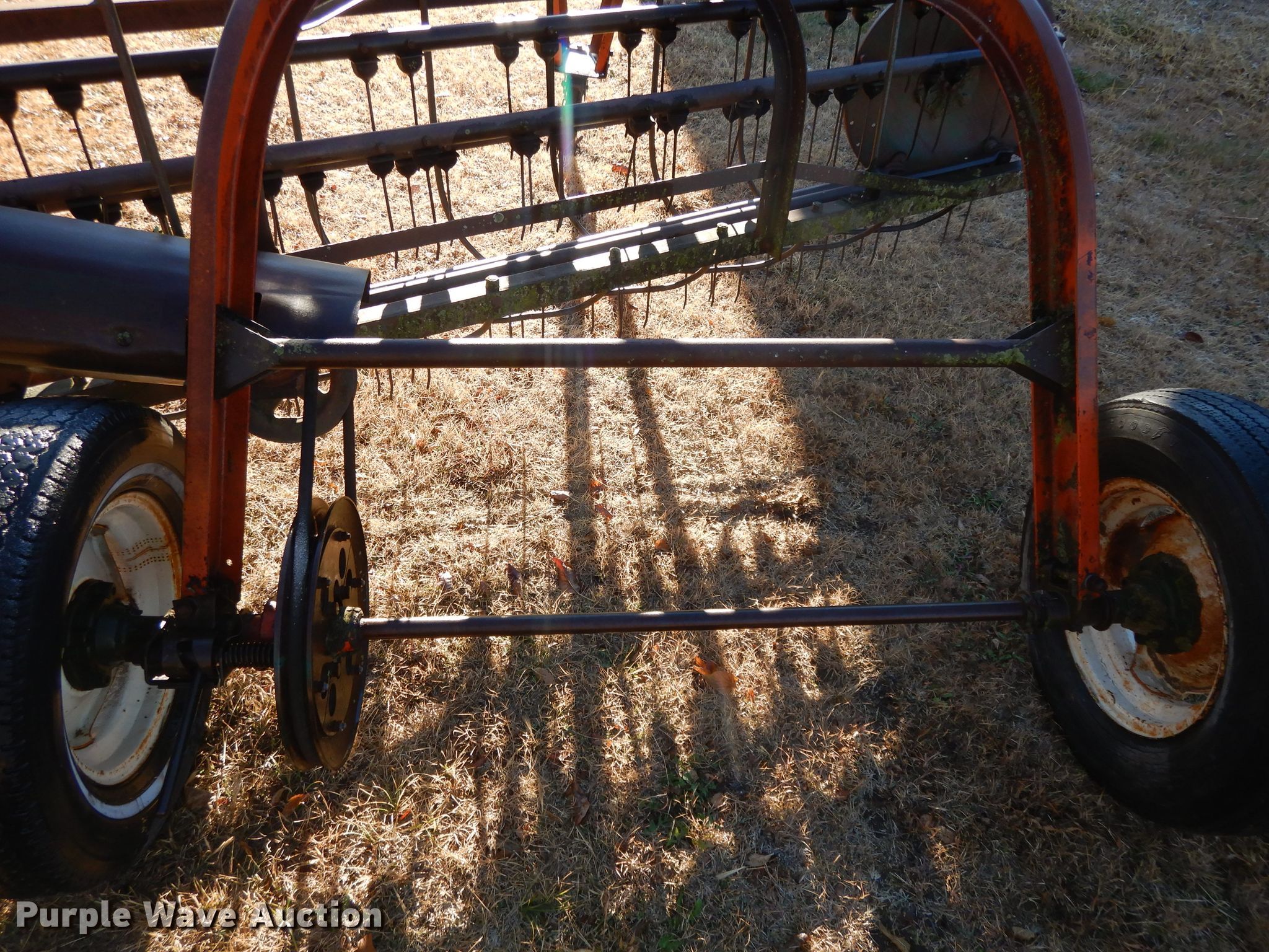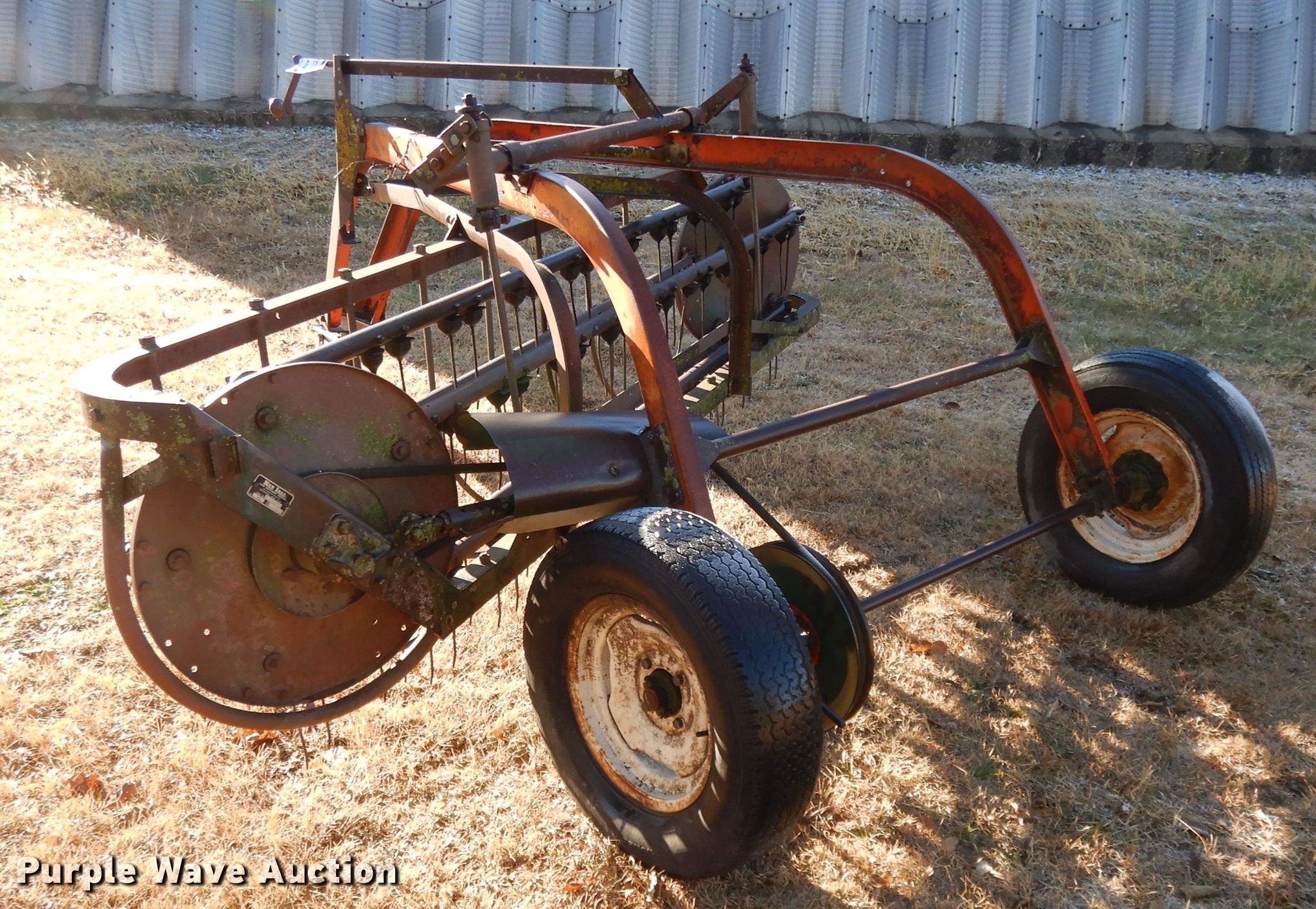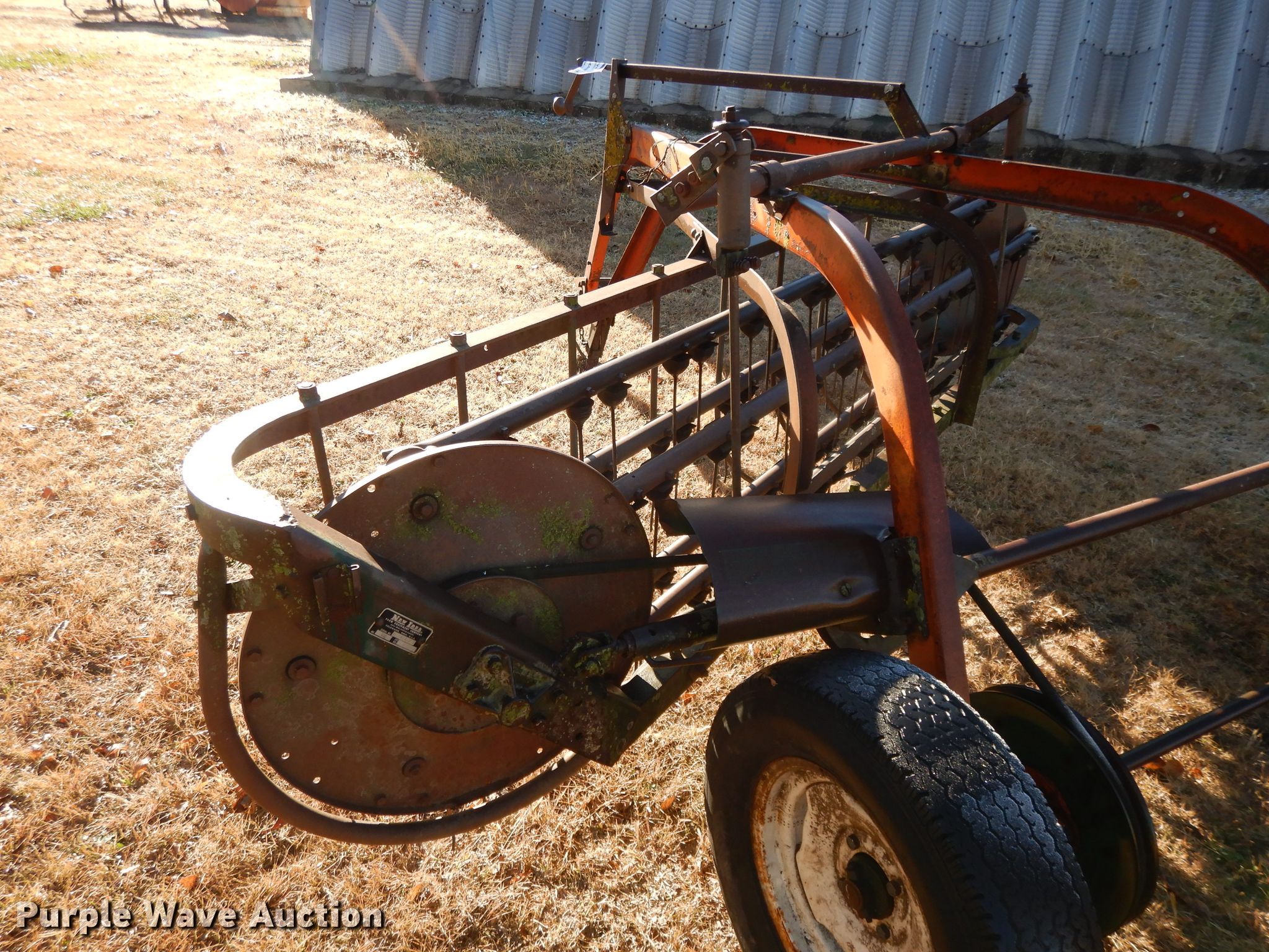 Purple Wave is selling a used Hay Rake in Kansas. This item is a New Idea 402 hay rake with the following: 8'W, Ground driven, 78-15 tires, Serial 141313