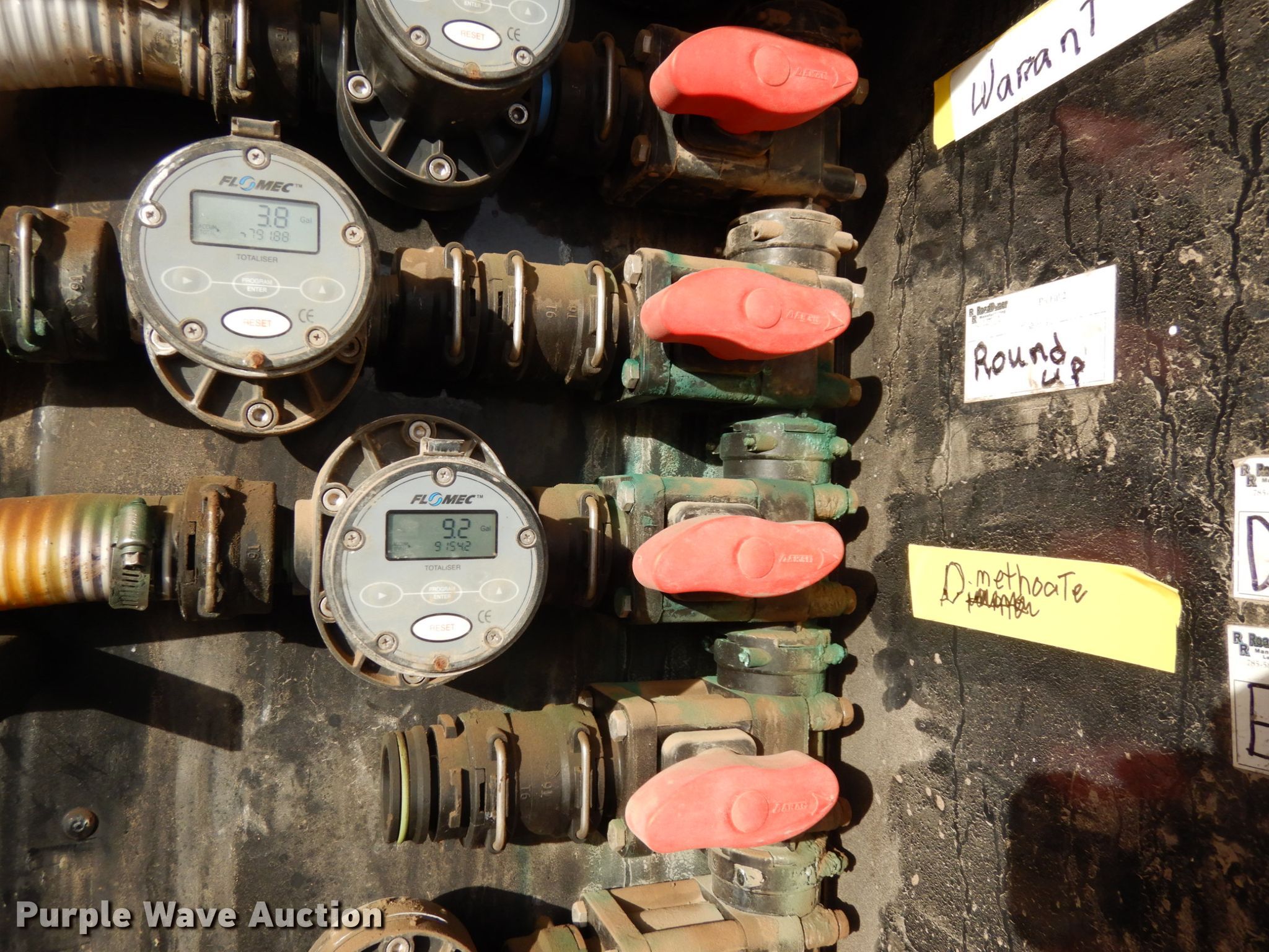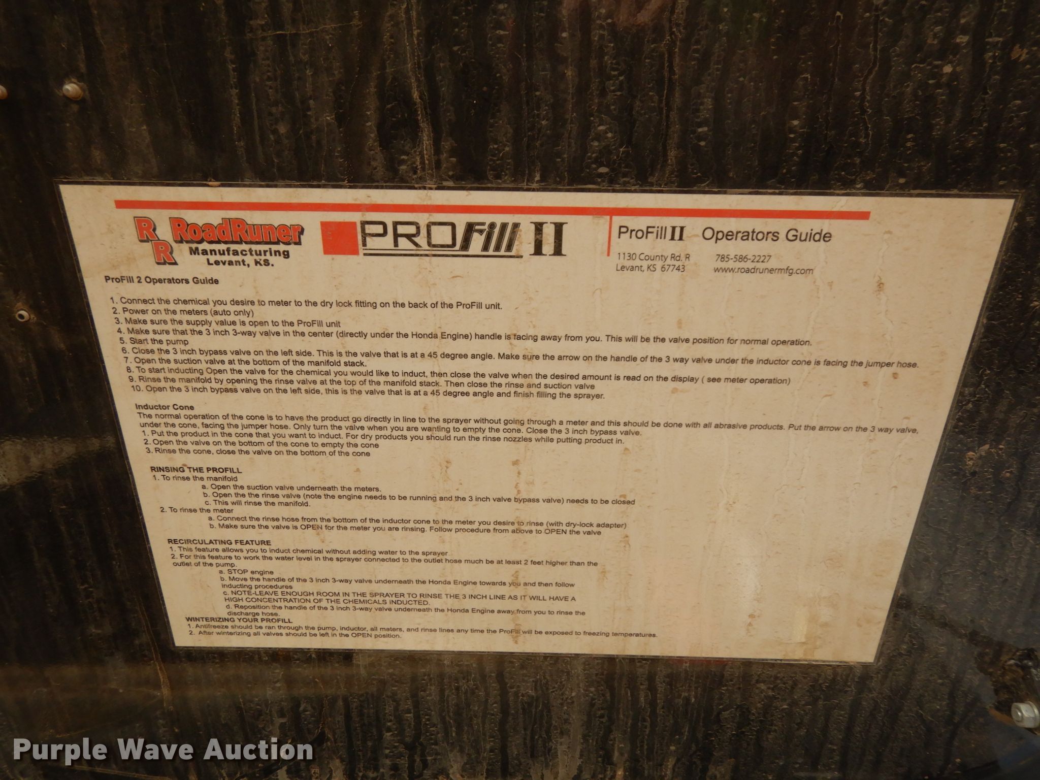 2018 Road Runner 4000 drop deck sprayer trailer. 53'L overall, 12'L top deck, 14.5'L x 130"W main deck Aluminum deck, Fold down sides, ProFill II station, Honda GX390 gas engine Electric start, Pump, 30 gallon inductor cone poly tank, Bypass, suction, and rinse valves, Digital meters, Additional hose, 26'L rear deck 142"W sprayer transfer section, 16"W outriggers, 22"W spring mounted ramps, 3,200 gallon poly fill tank, Dual leg landing gear, Air suspension, Air brakes, Triple axle, Steel wheels, 255/70R22.5 tires, GVWR 80,000 lbs, GAWR 20,000 lbs. Nebraska title. 1R9SD5334JL427905. Diamond J Ag LLC. 112 Grant Street. Aurora, NE 68818