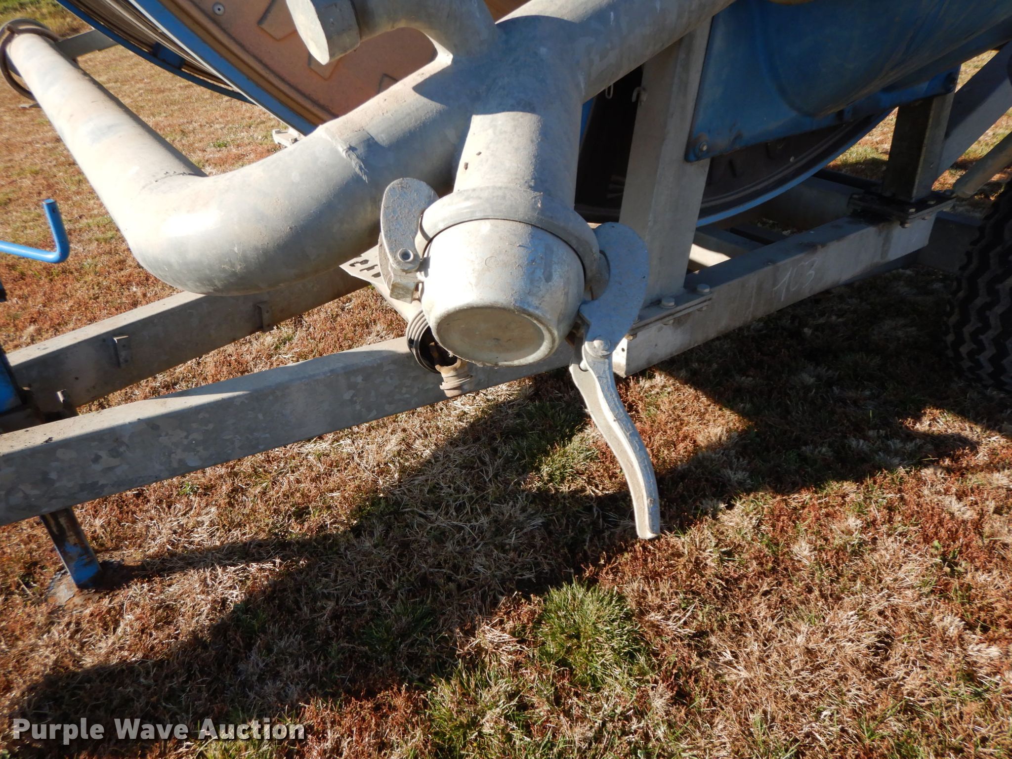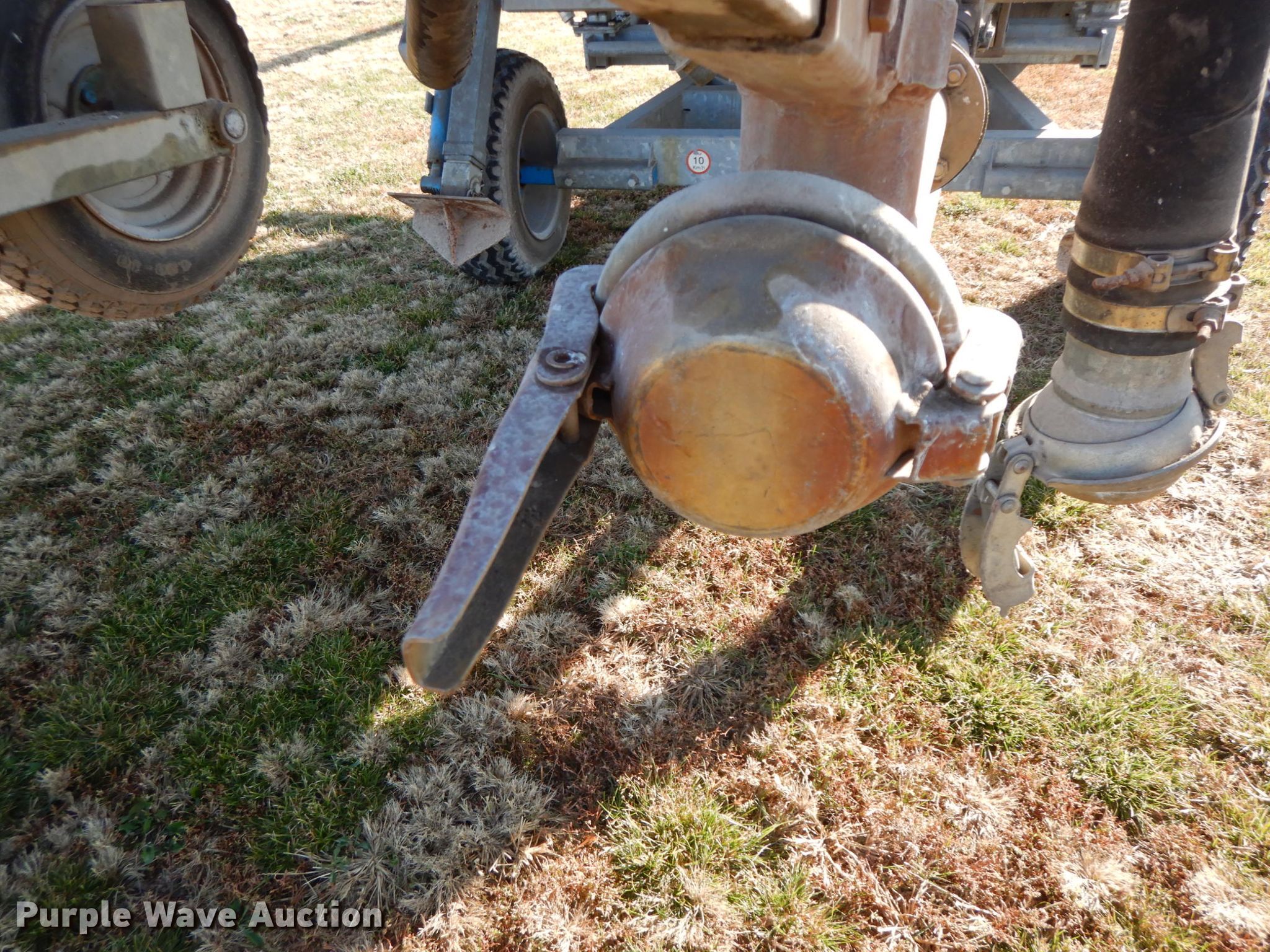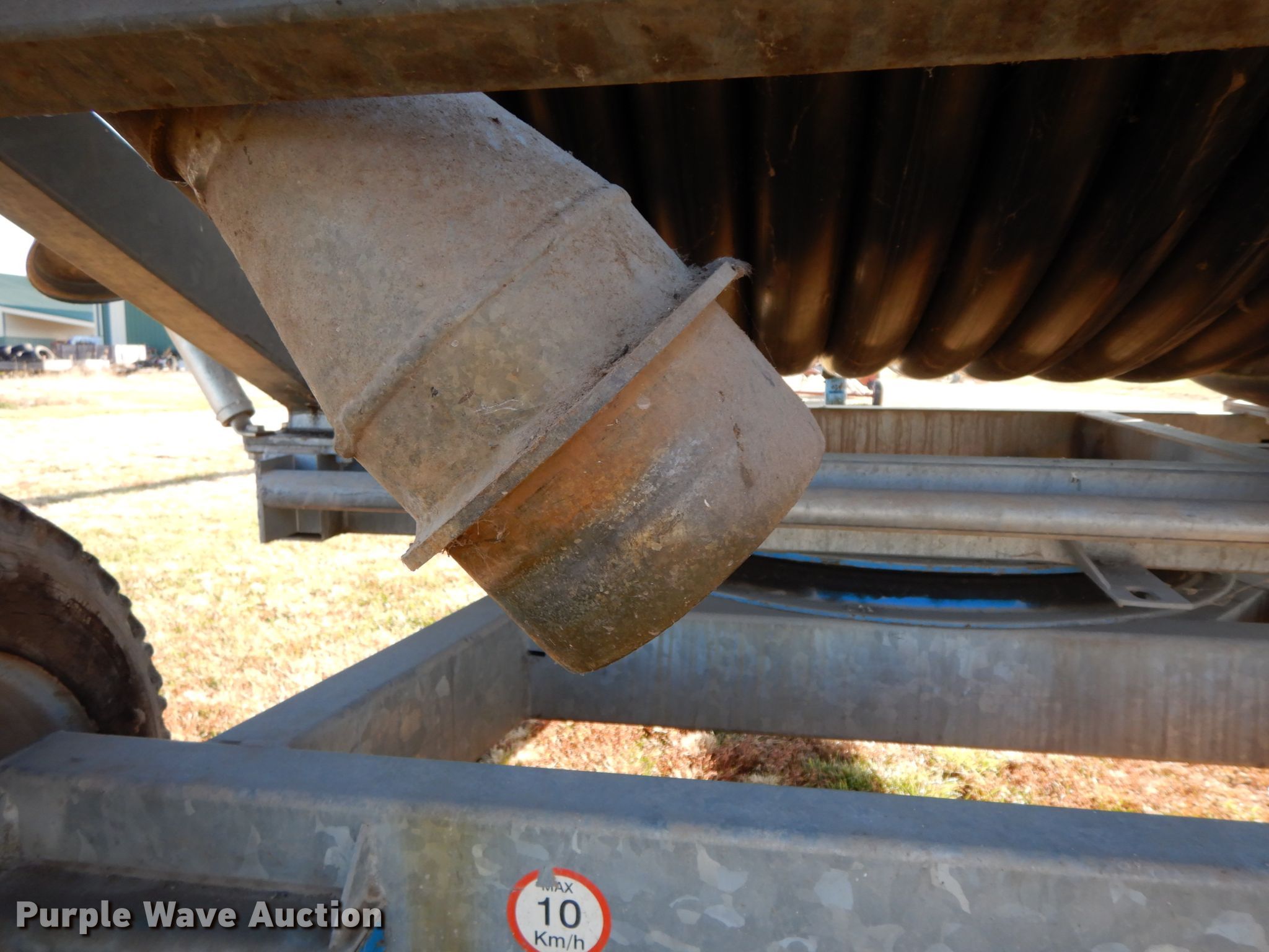 1999 Ocmis hose reel. Type: MOR4, 4" hose, Traveling gun, 540 PTO, 4.50-10 gun gauge wheels, 10.0/75-15.3 tires, 2,590 kg weight when empty, 4,880 kg weight when full, Serial E990121. 1101 W Broadway St. Brunswick, MO 65236