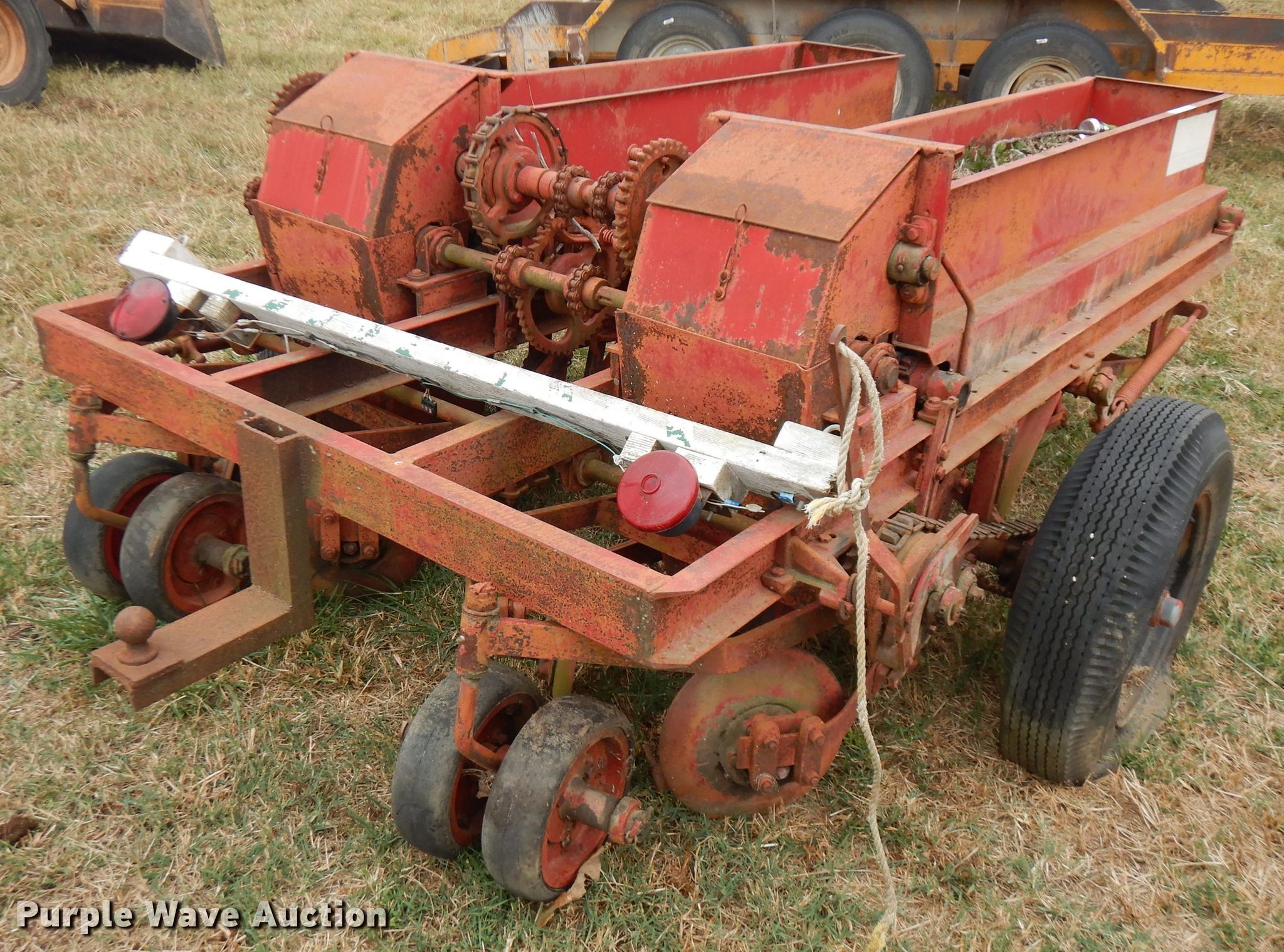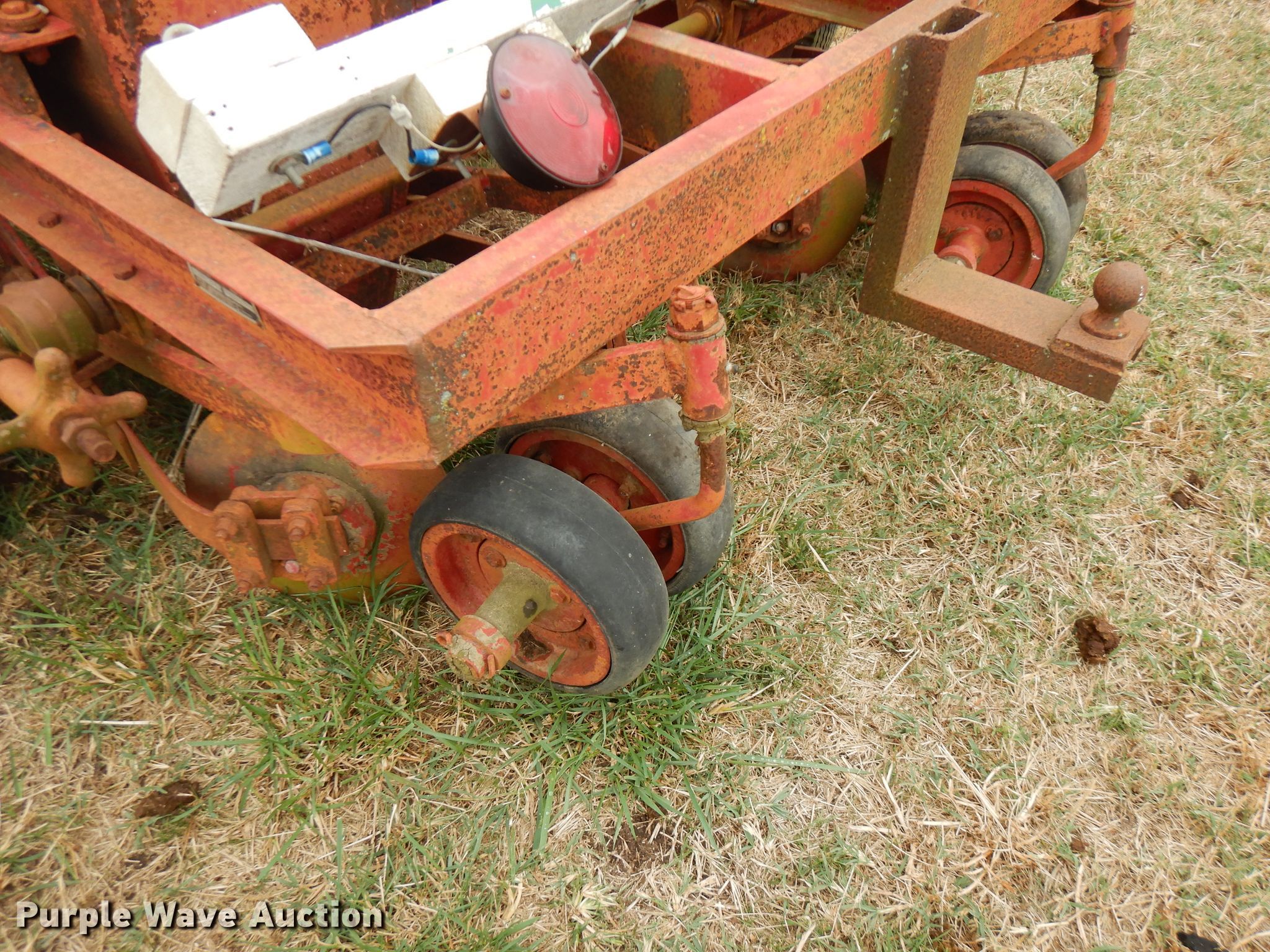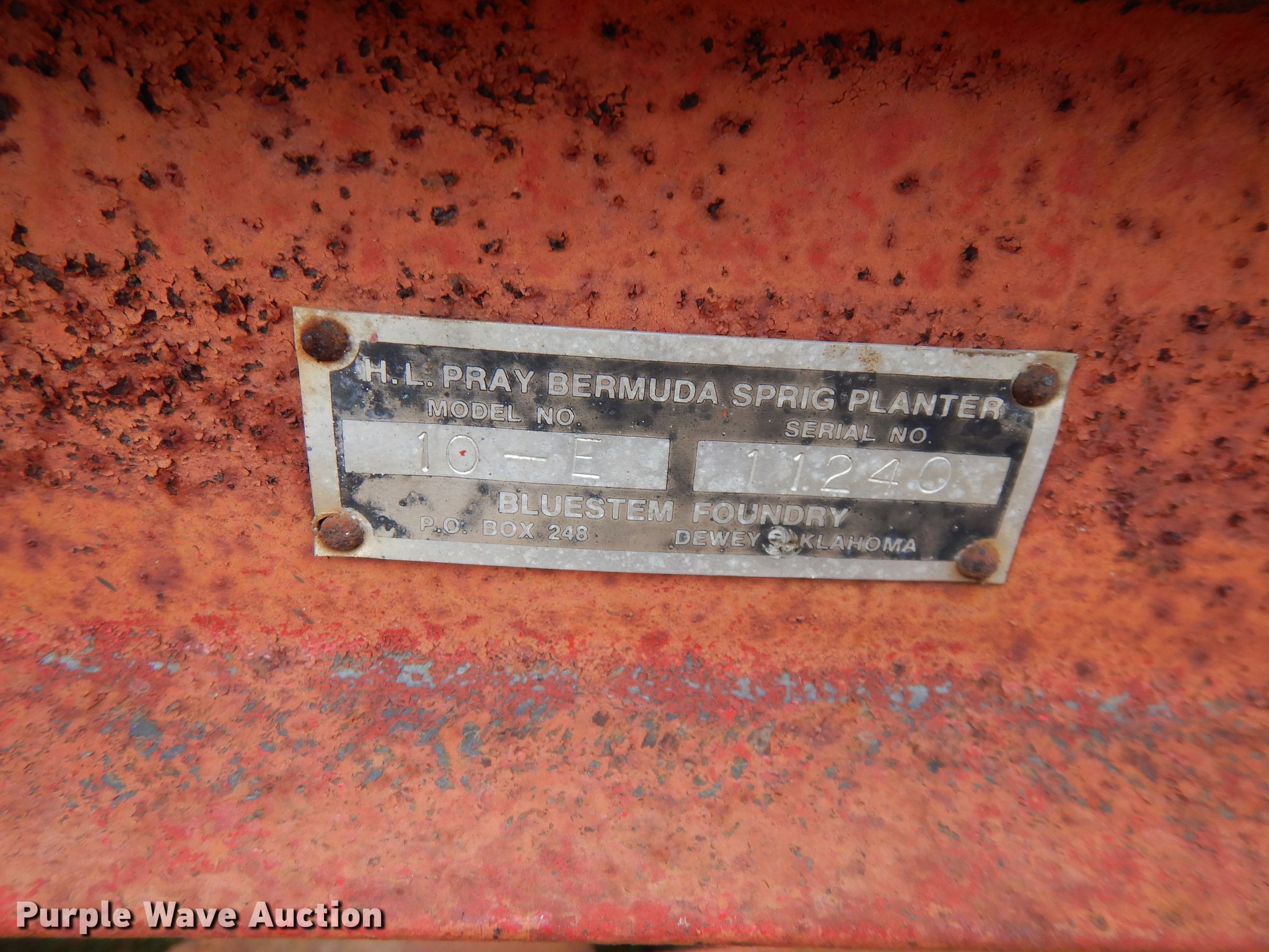 Purple Wave is selling a used Planter in Oklahoma. This item is a HL Pray 10-E bermuda spring planter with the following: Four row units, 24" row spacing, Individual seed hoppers, Ground meter drive, Spring down pressure, Single disk openers, Double rubber closing system, 2" ball hitch, Single leg landing gear, (2) 6.70-10 transport tires, Serial 11240
