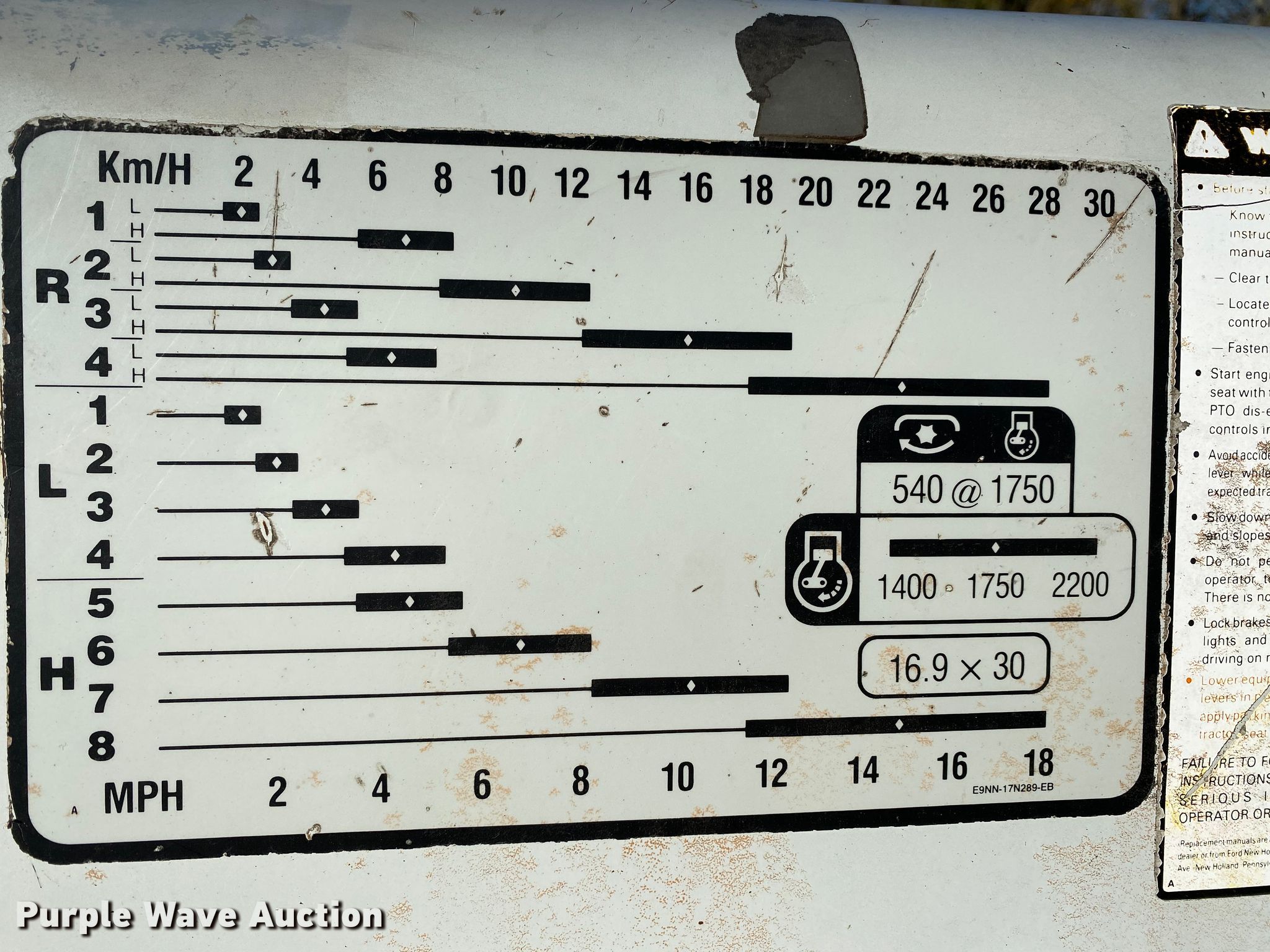 1994 Ford 4630 tractor. 1,934 hours on meter, Serial: BD61399. Engine Ford 436648-3M04, Cylinders: 4, Fuel type: Diesel. Transmission Synchro shuttle shift, 8F - 8R. Operational PTO: 540, Three point, Hydraulic remote sets Rear: 2. Tires Front: 7.50-16, Rear: 16.9-30, Wheelbase: 89". 8252 E Panama Rd. Nevada, MO 64772