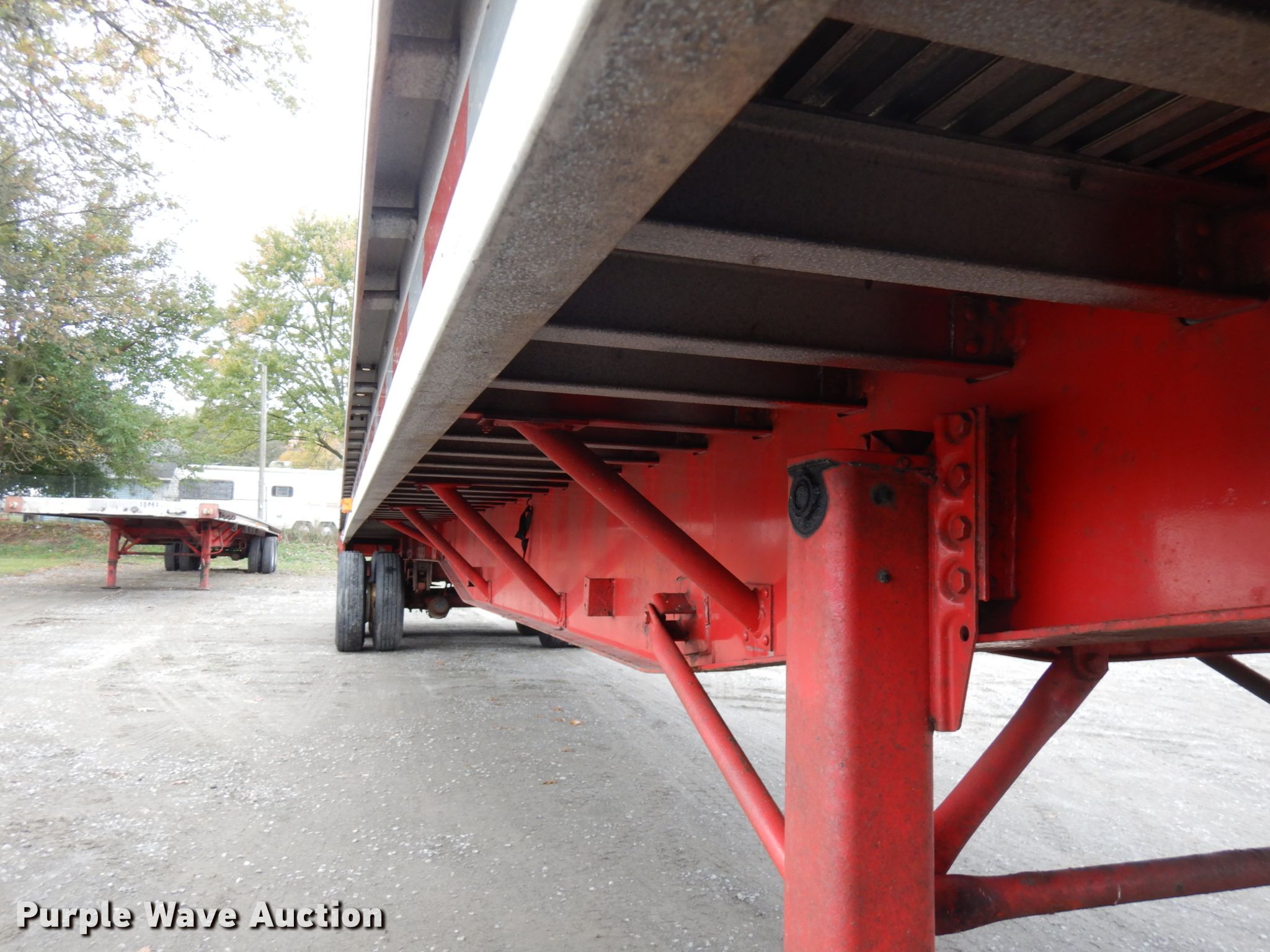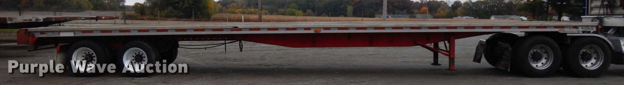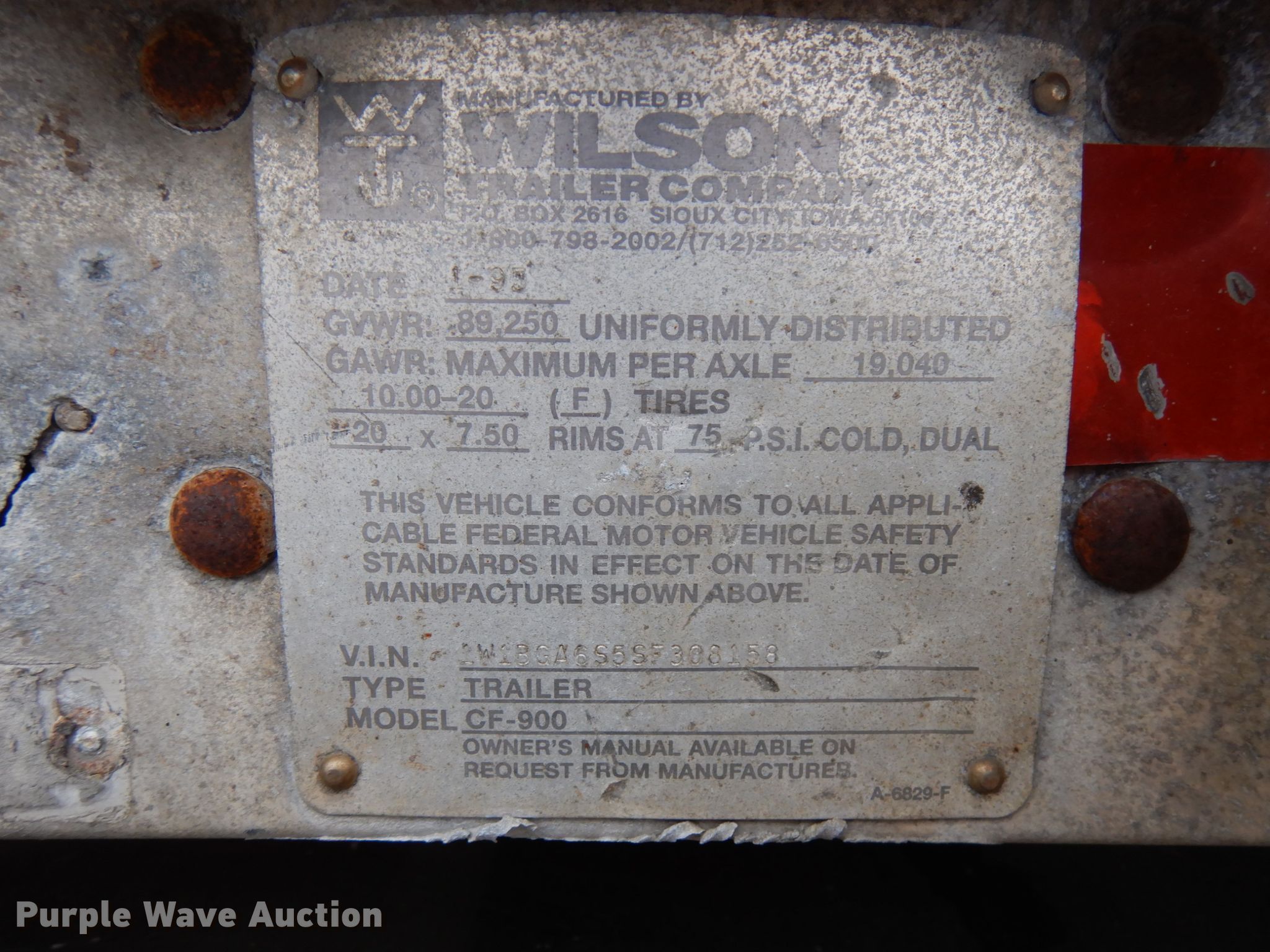 Purple Wave is selling a used Flat or Drop Deck Trailer in Indiana. This item is a 1995 Wilson CF-900 flatbed trailer with the following: 48'L x 102"W, Aluminum deck, Dual leg landing gear, Spring suspension, Air brakes, Sliding tandem axle, Steel wheels, 255/70R22.5 tires, GVWR 89,250 lbs, GAWR 19,040 lbs