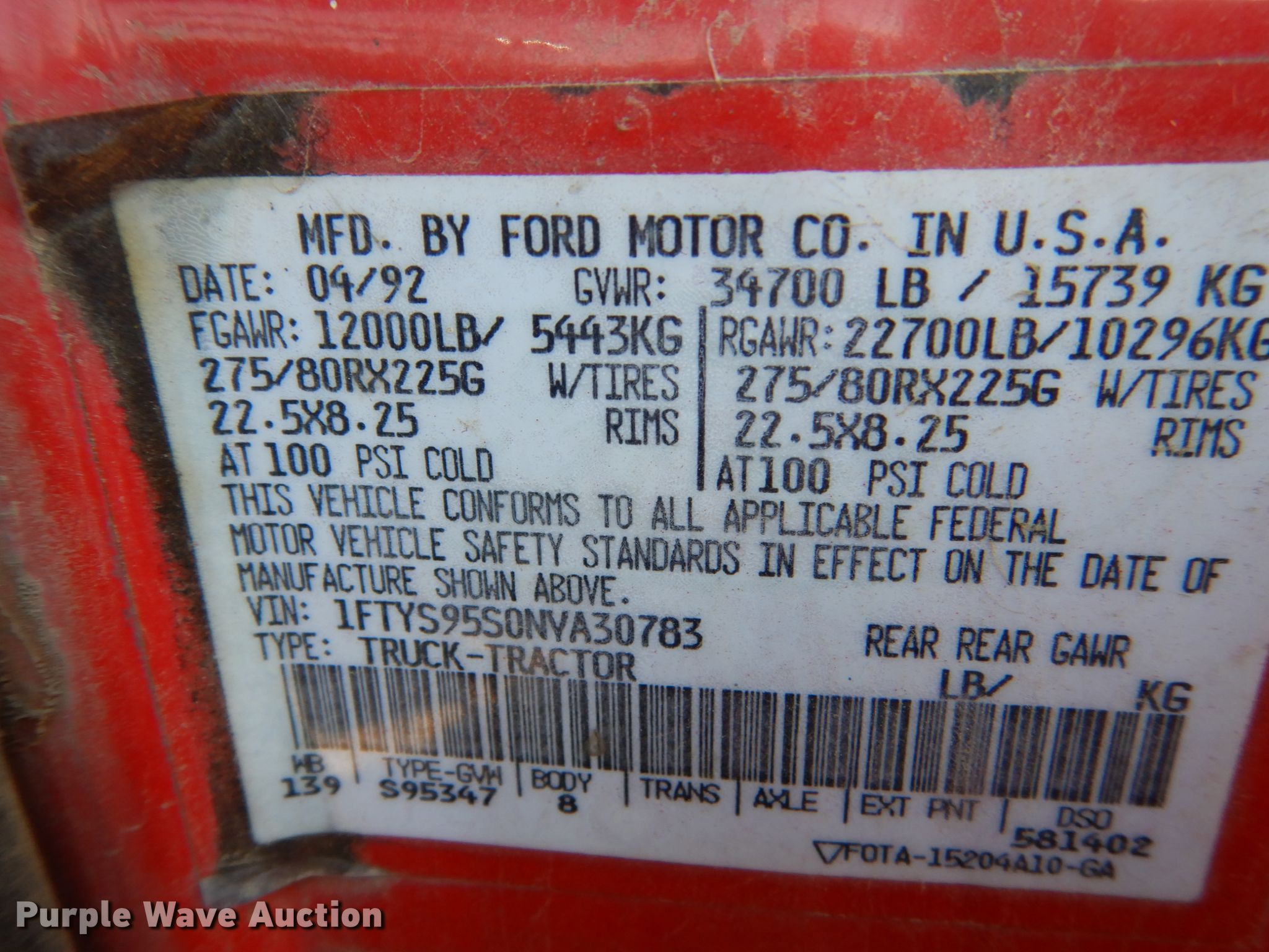 1992 Ford Aeromax L9000 semi truck. 507,147 miles on odometer. Engine Caterpillar 3176, Serial: 7LG09582, Displacement: 10.0L, Cylinders: 6, Fuel type: Diesel. Transmission Manual, Speed: 7. Chassis Axles: Single, Suspension: Air, Brakes: Air. Interior Heat. Operational Deck plate: Steel, Fifth wheel type: Fixed, Fuel tank: Single. Tires Size: 295/75R22.5. Nebraska title. 1FTYS95S0NVA30783. Krusemark Construction & Excavation. 86835 591 Ave. Waterbury, NE 68785