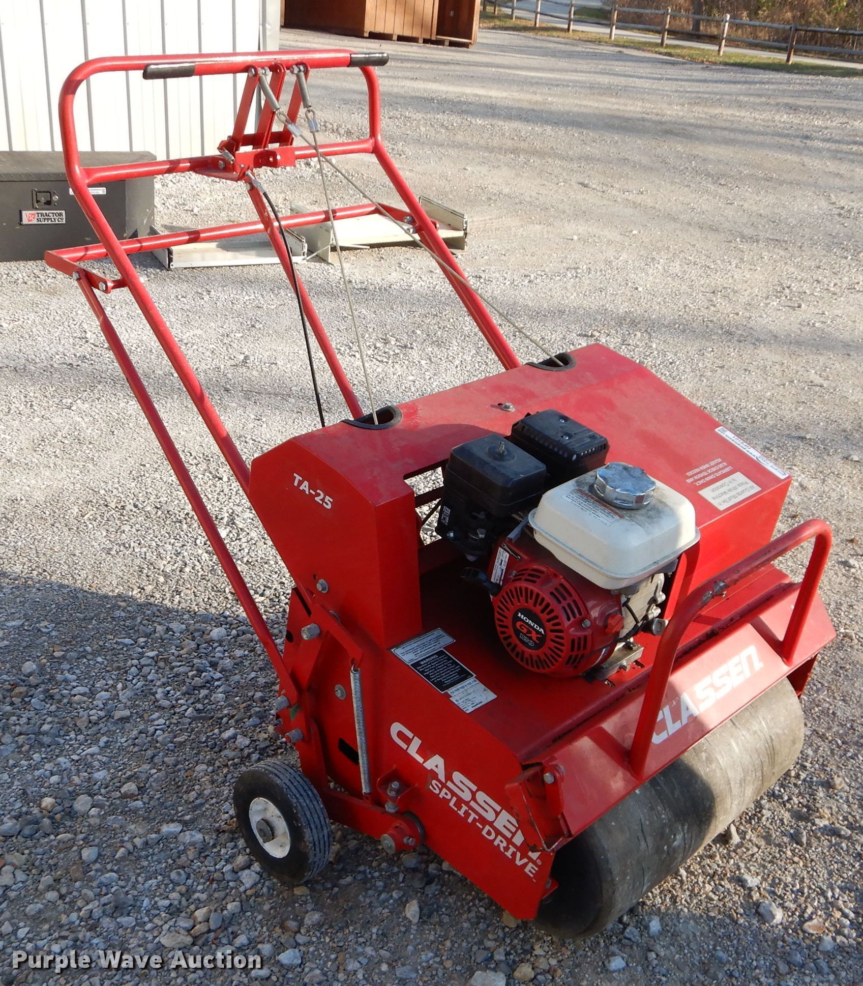 Purple Wave is selling a used Lawn and Garden in Kansas. This item is a Classen TA-25 lawn aerator with the following: 24"W, Honda GX120 gas engine