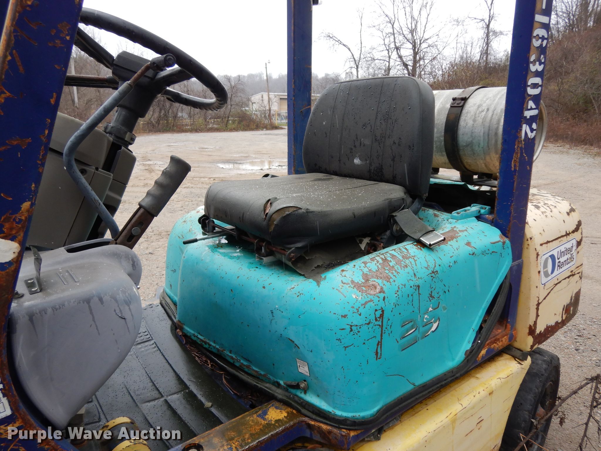 Komatsu FG25T-12 forklift. Serial: 514549A. Engine Nissan, Cylinders: 4, Fuel type: Dual fuel LP bottle: Included. Transmission Powershift, 1F - 1R. Operators station OROPS. Operational Maximum lift capacity: 3,730 lbs, Maximum lift height: 144", Mast stages: 3, Side shift, Mast tilt, Fork length: 48". Tires Front: 7.00-12, Rear: 6.00-9, Solid. Notes Non-operational unit. ROC Service. 1 Rainey Rd. Eighty Four, PA 15330