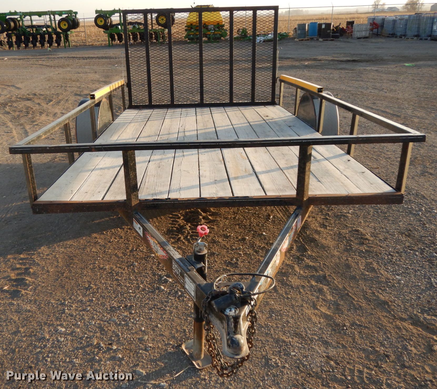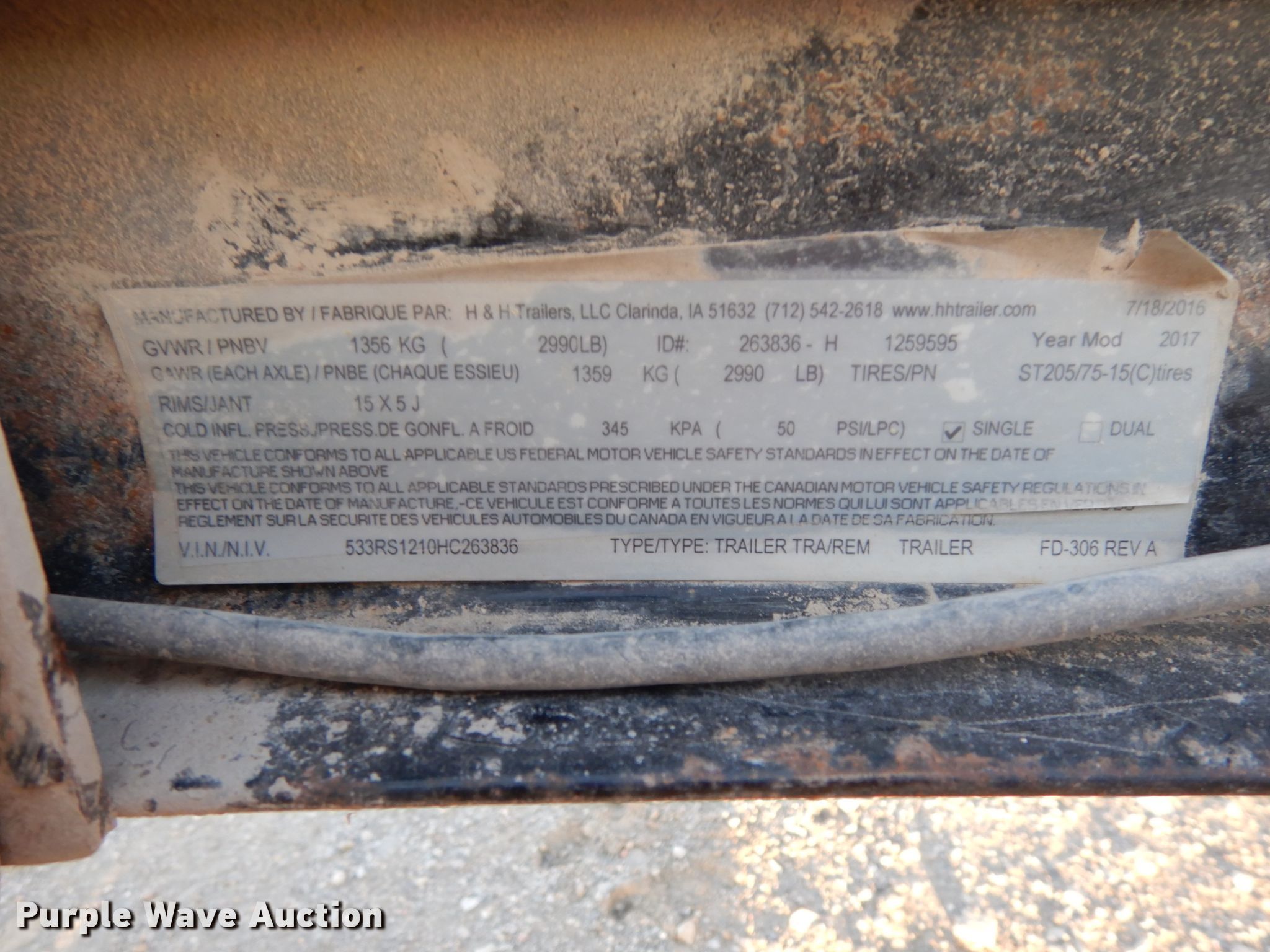 Purple Wave is selling a used Car or Utility Trailer in Iowa. This item is a 2017 H&H 7X12 utility trailer with the following: 12'L x 82"W deck, 13.5" side height, 4'L x 80"W end gate ramp, Gorilla lift attachment, Wood deck, 2" ball hitch, Single leg landing gear, Spring suspension, Steel wheels, ST205/75R15 tires, GVWR 2,990 lbs, Ramp assist cable broken