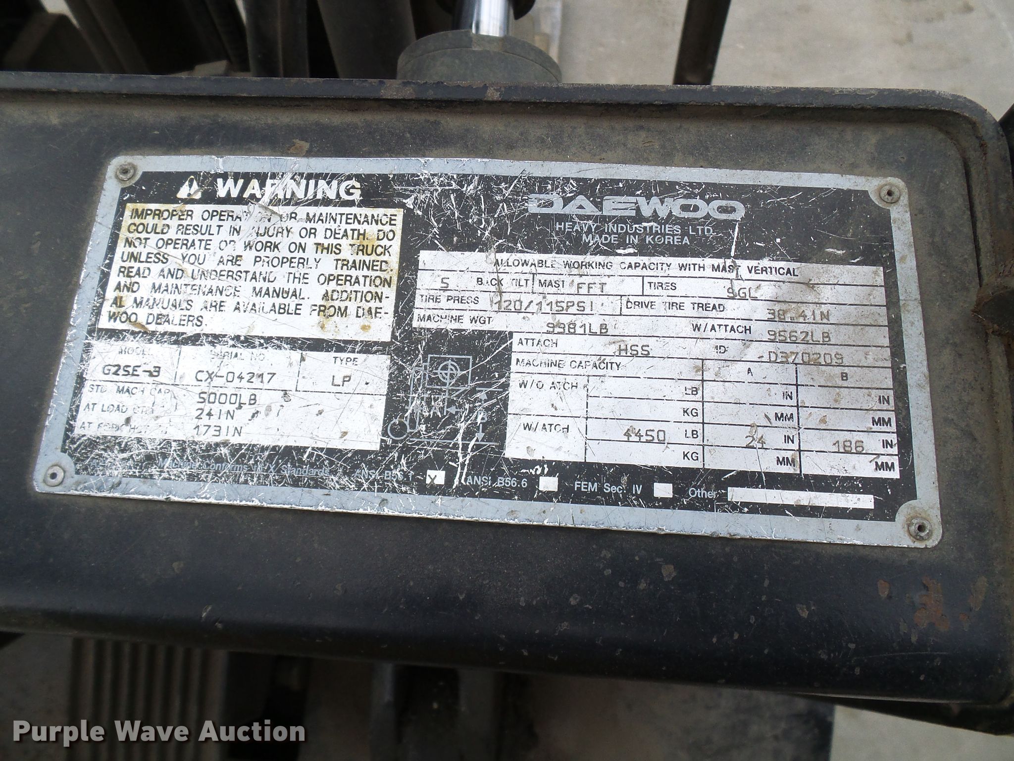 Purple Wave is selling a used Warehouse Forklift in Missouri. This item is a Daewoo G25SE forklift with the following: 5,783 hours on meter, Serial: CX04217