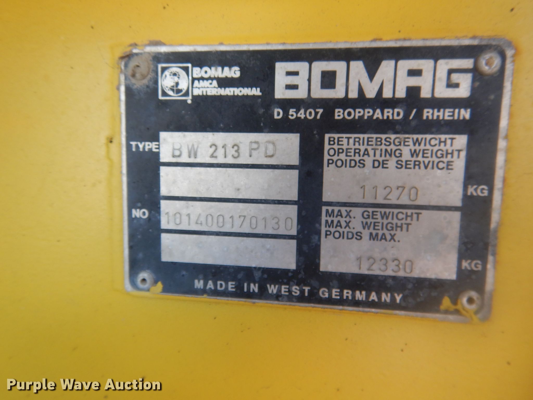 Purple Wave is selling a used Single Drum Roller Compactor in Nebraska. This item is a 1987 Bomag BW213PD vibratory single drum roller with the following: 6,727 hours on meter, Serial: 101400170130