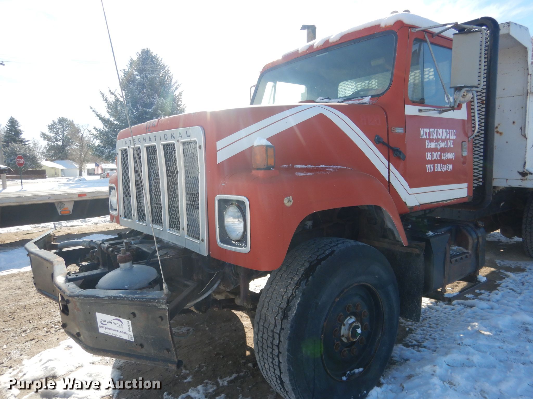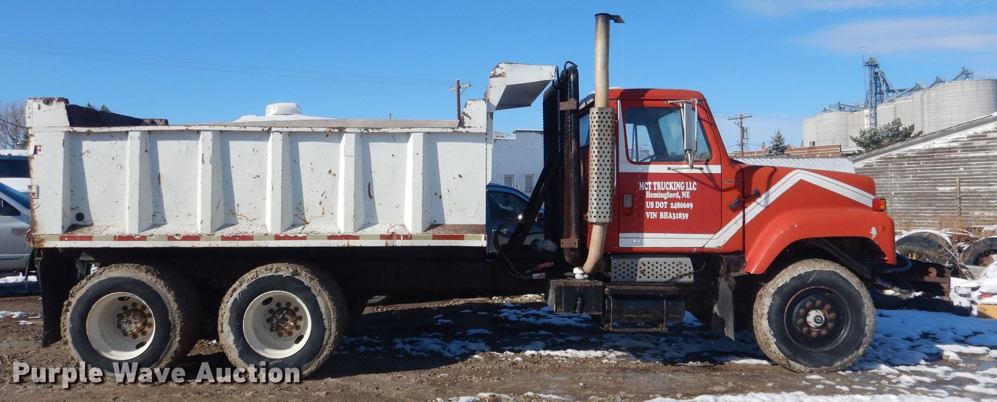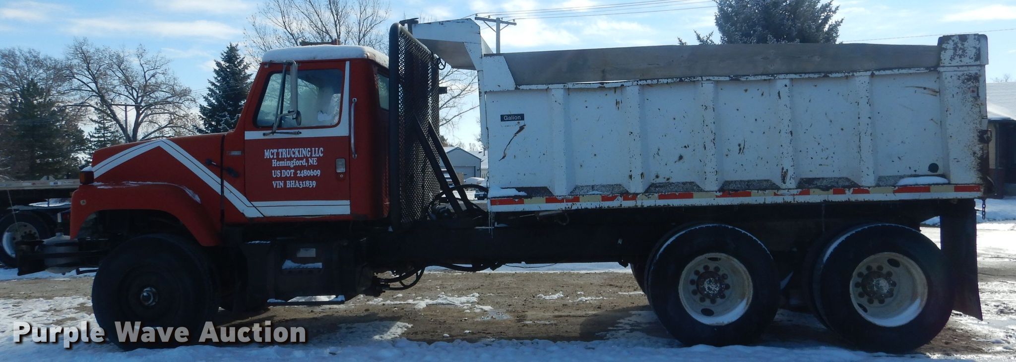 1981 International F2574 dump truck. 136,435 miles on odometer, Engine hours: 8,848. Engine Cummins Power Tourqe 240, Displacement: 9.0L, Cylinders: 6, Fuel type: Diesel. Transmission Eaton Fuller 7 LL, Manual, Speed: 9. Chassis Double frame, Axles: Tandem, Suspension: Spring, Brakes: Air, PTO, Wheelbase: 192". Operational Dump bed Galion, 13' L x 96" W, Side height: 43", Side board height: 12", Bed type: Steel, Ram: Single , End gate: Air operated. Tires Front: 285/65R22.5, Rear: 11R22.5, Brand: Firestone. Notes Side board missing. Nebraska title. Title has a lien that will be released following the close of the auction. Title distribution may be delayed up to 30 days from verification of funds. 1HTCF2574BHA31839. MCT Trucking LLC. Hemingford, NE 69348