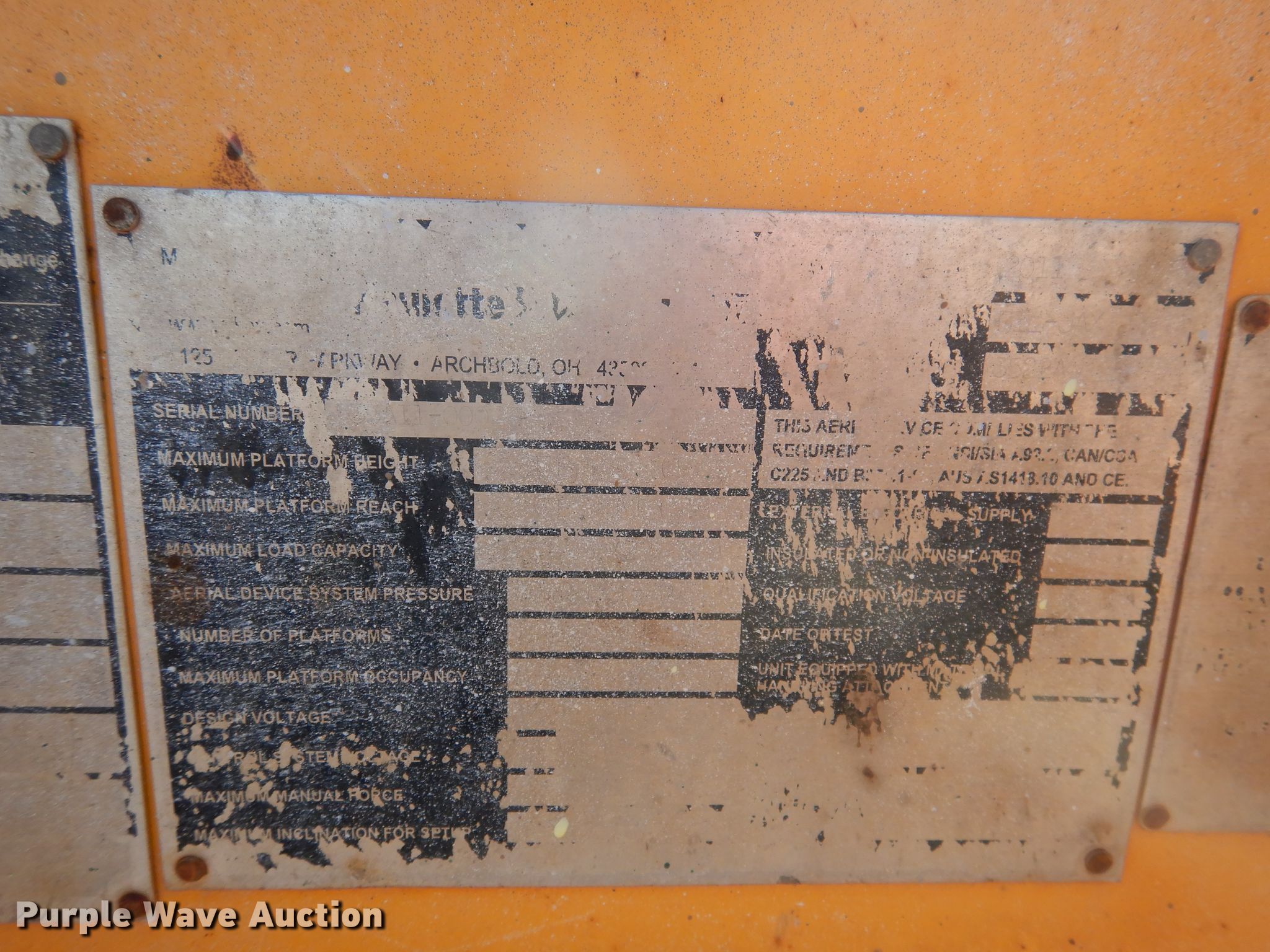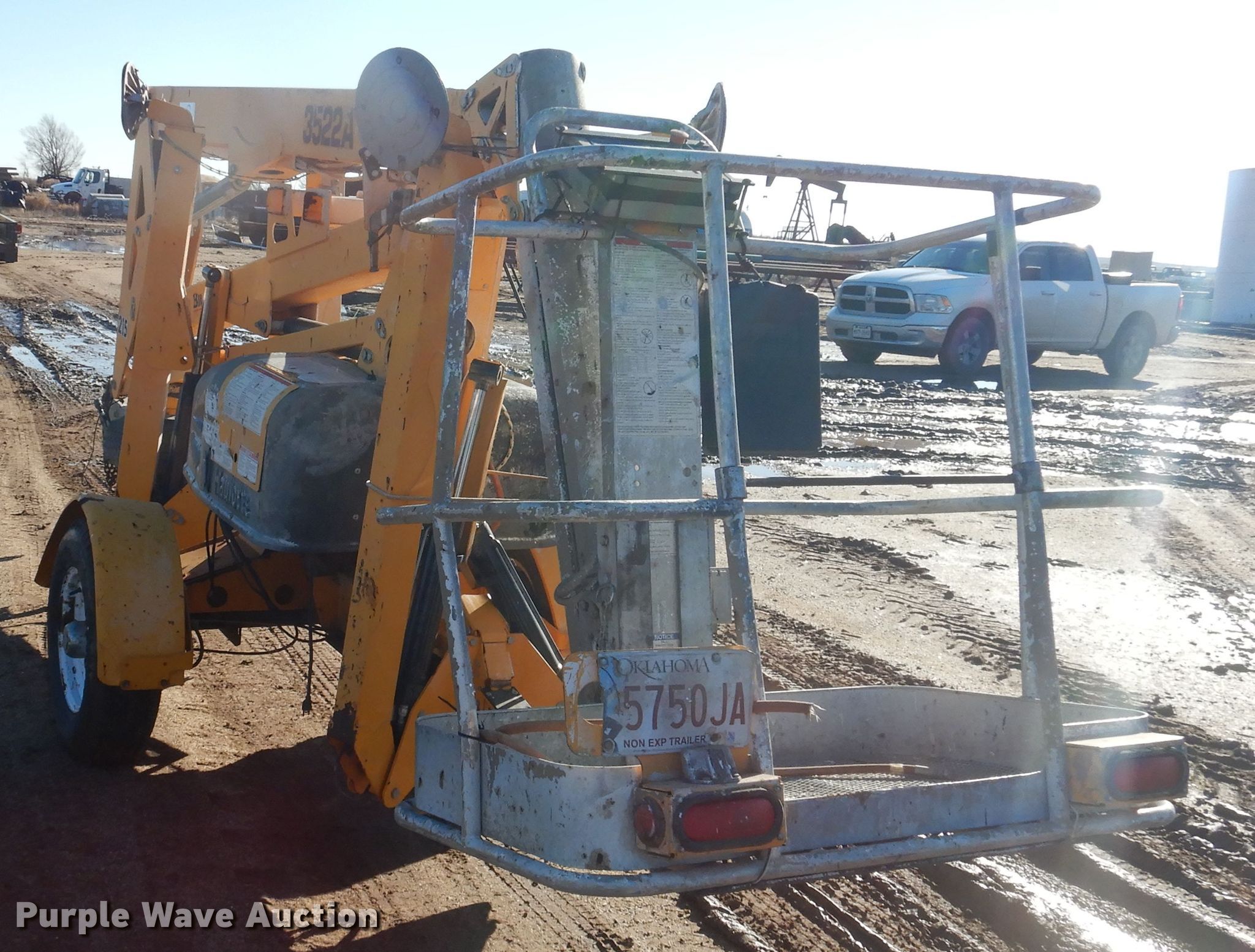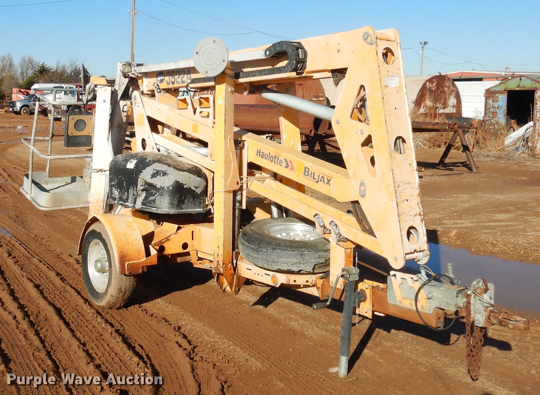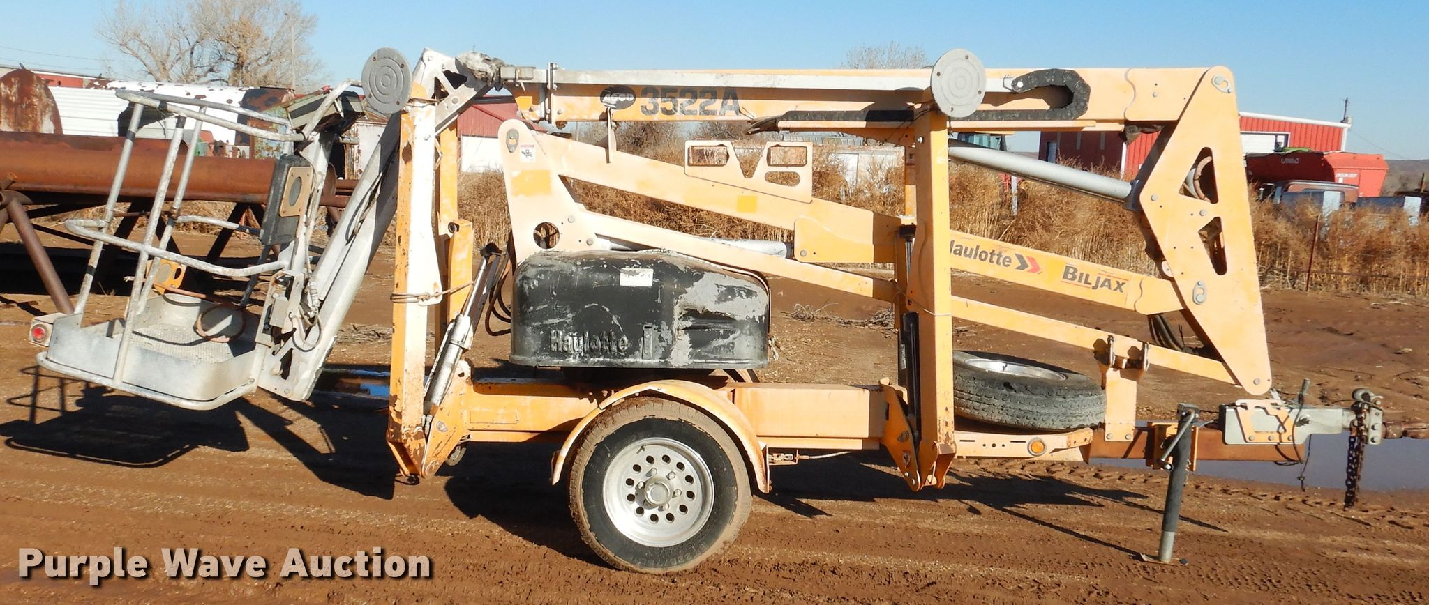 2011 Haulotte Biljax 3522A boom lift. Serial: 35A11-00023. Electric Motor. Operational Tow behind, Maximum lift capacity: 500 lbs, Maximum reach length: 41' 9", Maximum lift height: 35' 9", Hydraulic outriggers, Hydraulic extendable jib, Hydraulic leveling, Platform: 49" L x 28" W, Controls: Platform, Platform rotation: Hydraulic. Tires Tire size: 225/75D15. Notes Non-operational unit. Oklahoma title. Title distribution may be delayed up to 14 days from verification of funds. 5CUAG1610BA000026. Ramon & Bennett Roustabout. 9 East Rural Airport Rd.. Beaver, OK 73932