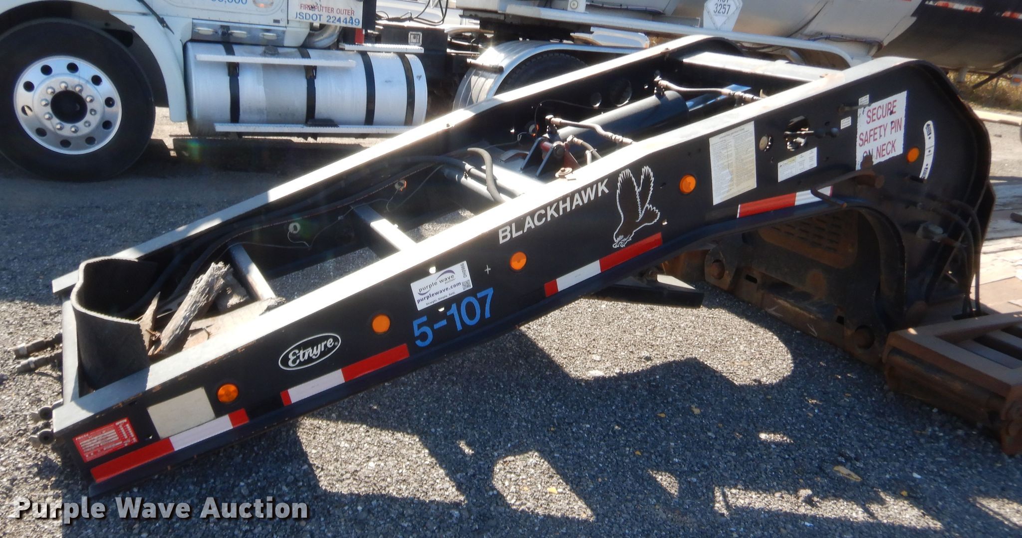 Purple Wave is selling a used Equip. Trailer in Oklahoma. This item is a 2002 Etnyre Blackhawk lowboy equipment trailer with the following: 58'L x 108"W overall, 47'L x 102"W steel and wood main deck, 12" swing-out outriggers, Detachable neck, Manual hydraulic controls, Air suspension, Air brakes, Triple axle, Steel wheels, 255/70R22.5 tires, GVWR 133,530 lbs, GAWR 20,280 lbs, Unit# 5-107
