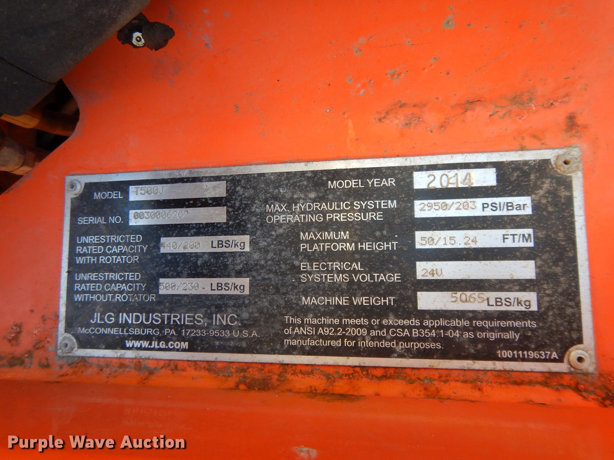 Purple Wave is selling a used Boom Lift in Kansas. This item is a 2014 JLG T500J boom lift with the following: 293 hours on meter, Serial: 0030006262