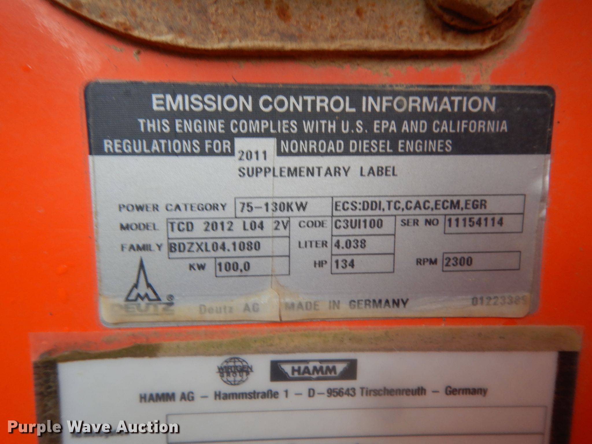2012 Hamm 3412P vibratory single drum roller compactor. 4,674 hours on meter, Serial: H1802546. Engine Duetz TCD2012L042V, Displacement: 4.038L, Cylinders: 4, Fuel type: Diesel. Transmission Hydrostatic. Operators station EROPS AC, Heat. Operational Drum: Padfoot, Vibratory system: Single, Front drum Width: 72", Diameter: 62", Rear drum, Drum scrapers: Front. Tires Size: 23.1-26. ROC Service. 1 Rainey Rd. Eighty Four, PA 15330