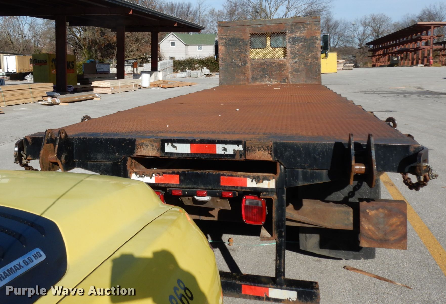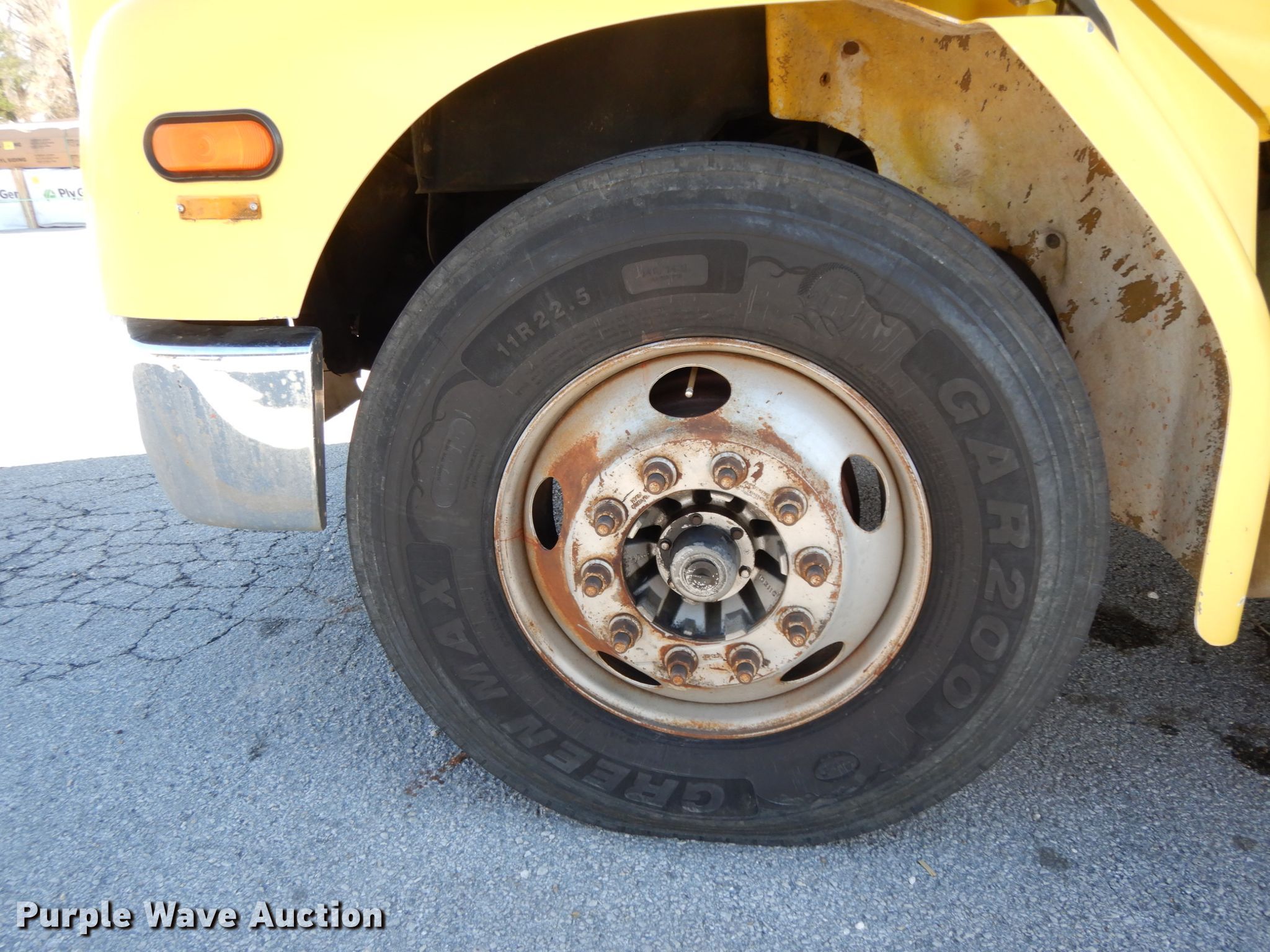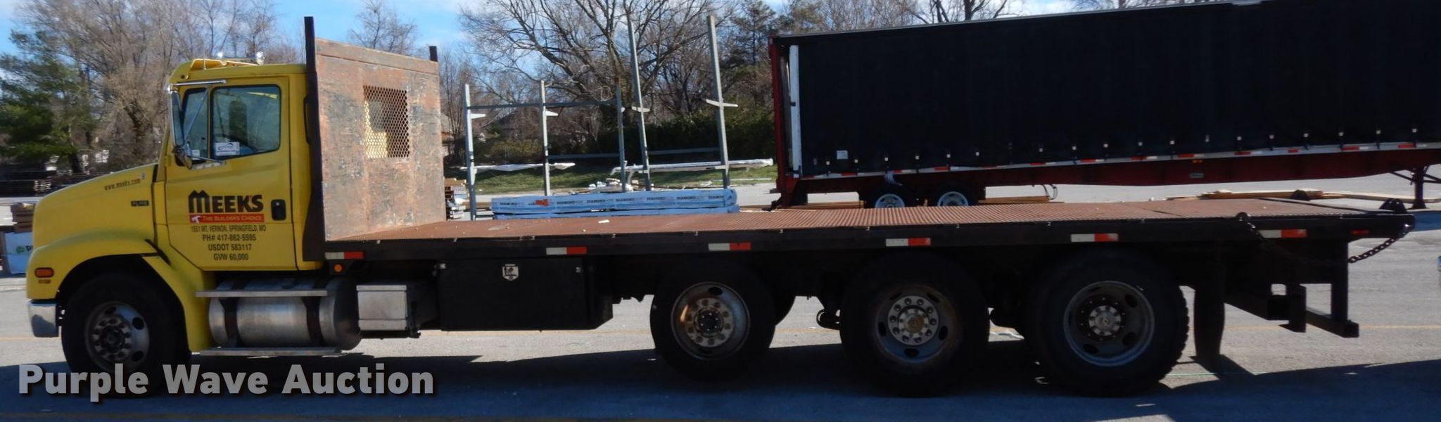 1999 Freightliner FL112 flatbed truck. 151,393 miles on odometer. Engine Caterpillar C10, Displacement: 10.3L, Cylinders: 6, Fuel type: Diesel. Transmission Rockwell, Manual, Speed: 10. Chassis Axles: Triple, Pusher axle, Suspension: Air, Brakes: Air, GVWR: 52,000 lbs, Wheelbase: 275". Interior AC, Heat, Cruise control. Operational Flatbed Length: 25', Width: 96". Tires Size: 11R22.5, Pusher axle: 255/70R22.5. Notes Dash warning indicator: Check engine. Missouri title. 1FUYTEDB9XHB93288. 1551 W Mt Vernon St. Springfield, MO 65802