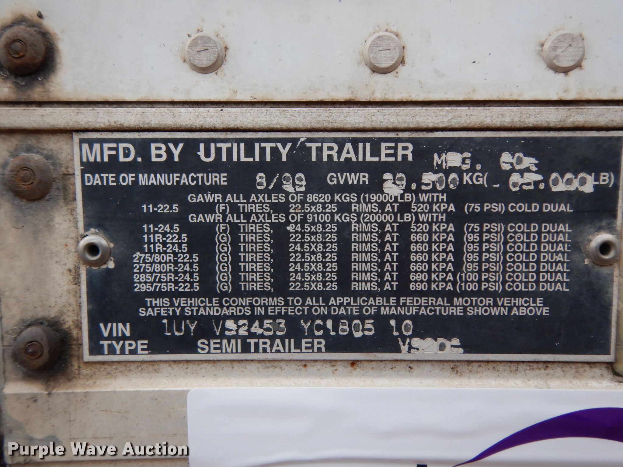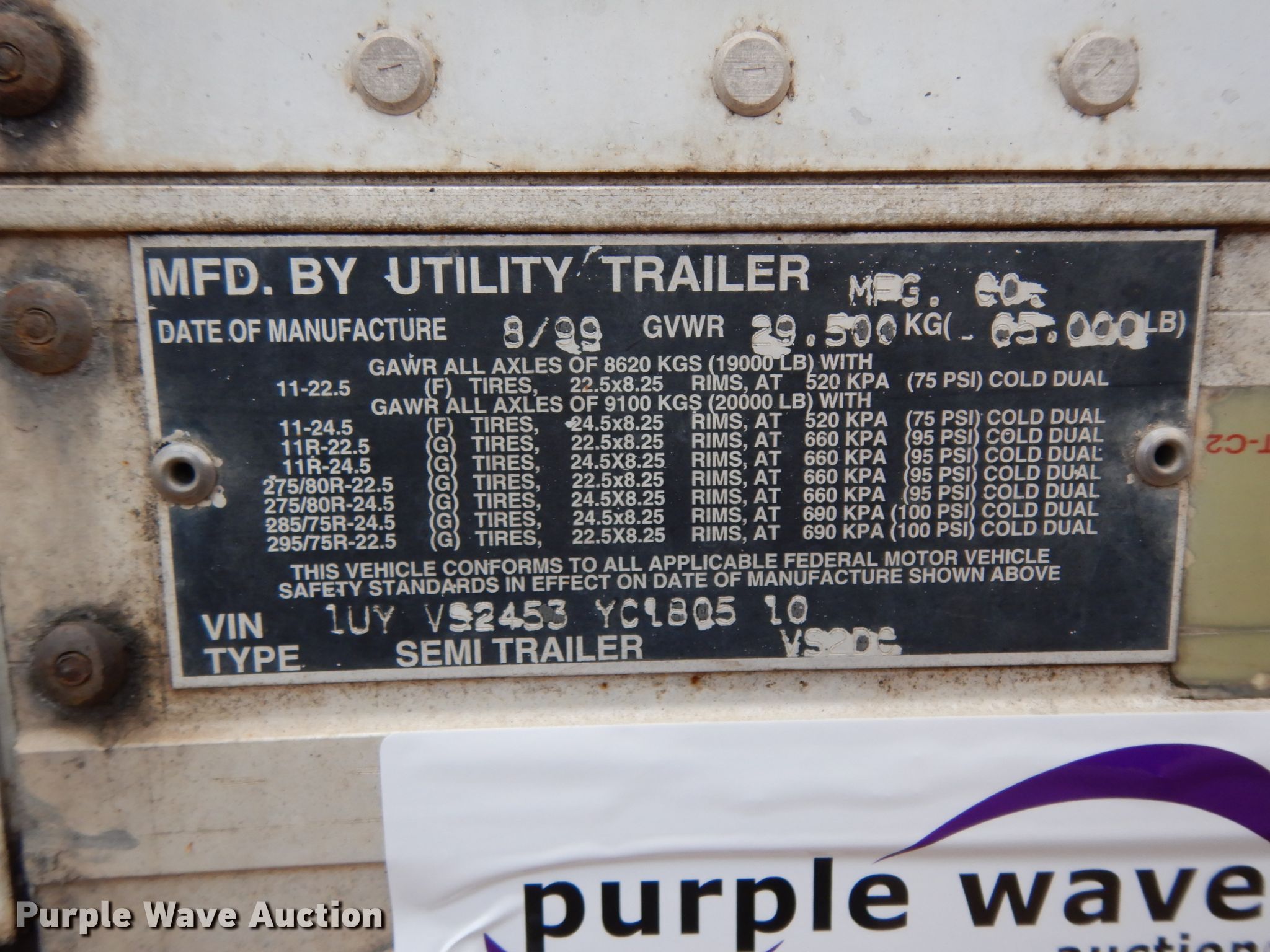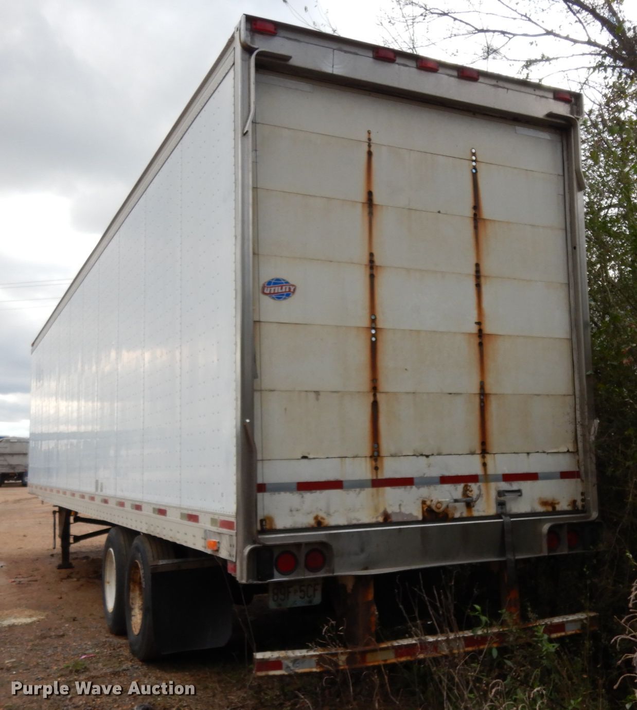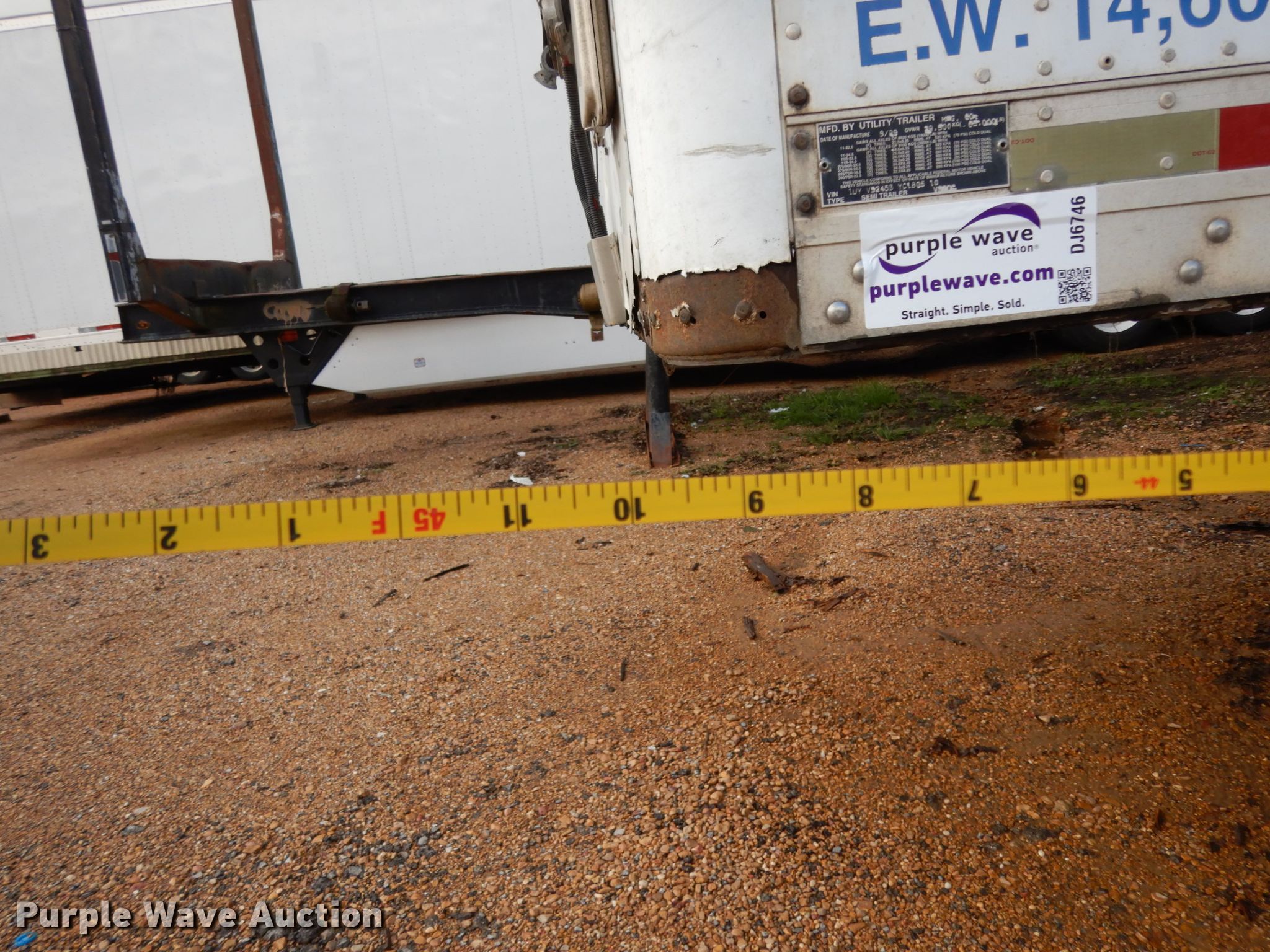 Purple Wave is selling a used Dry Van Trailer in Mississippi. This item is a 2000 Utility dry van trailer with the following: 45'L x 8'W overall, Wood deck, E-track rail system, Dual leg landing gear, Air suspension, Air brakes, Tandem axle, Steel wheels, 11R22.5 tires, GVWR 65,000 lbs, GAWR 20,000 lbs, Possible rear axle damage, Tires and wheels missing