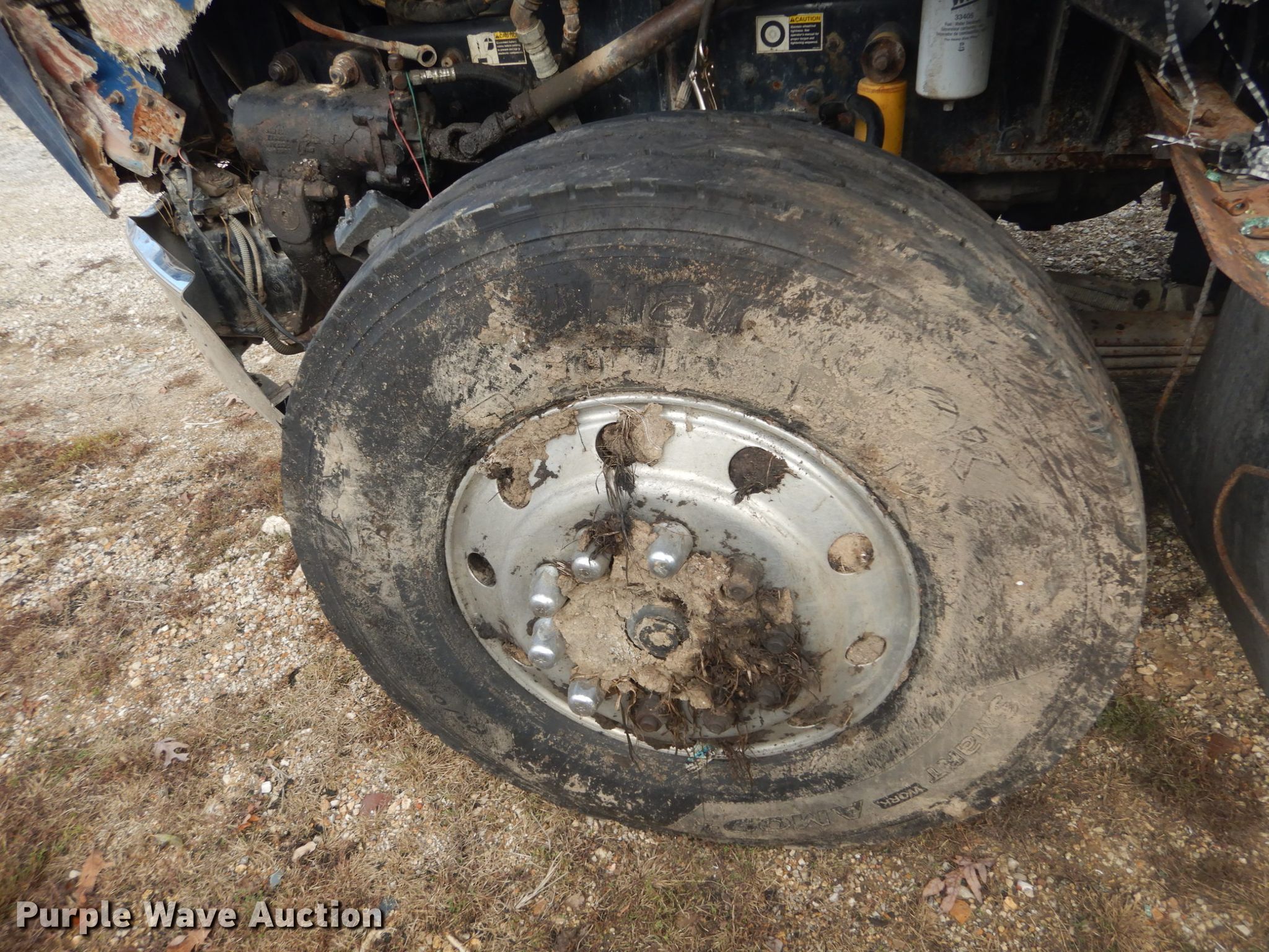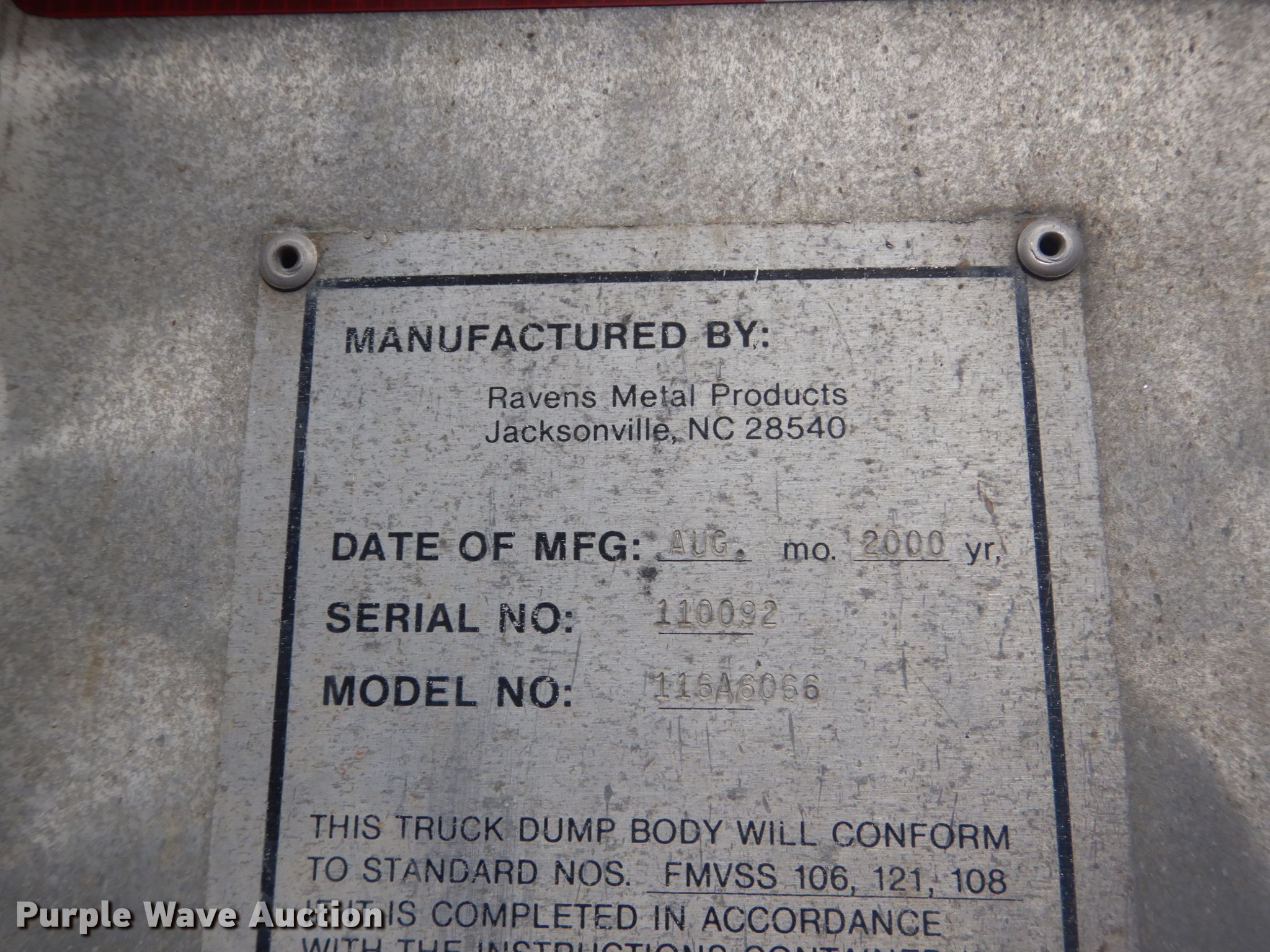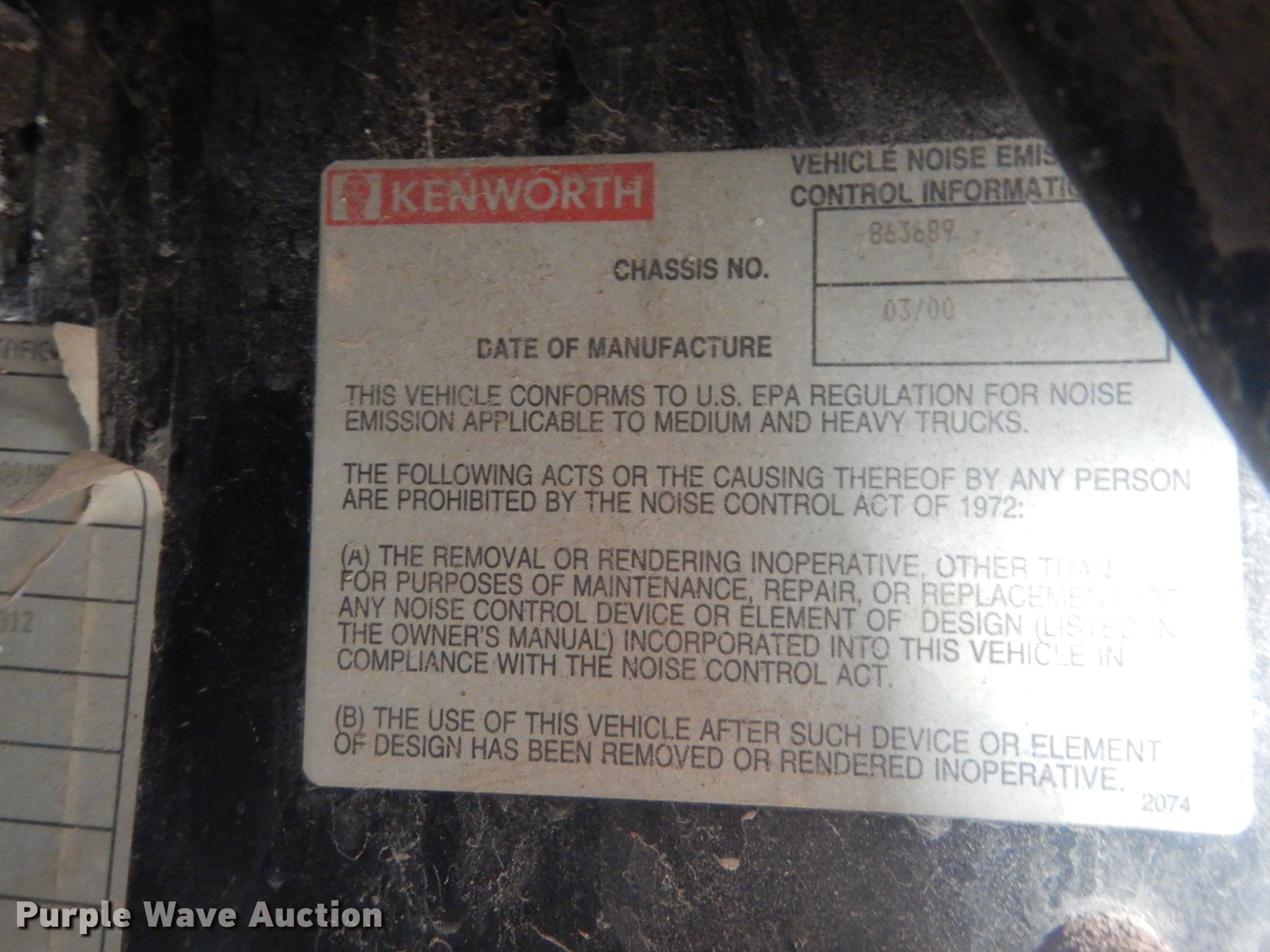 2000 Kenworth T800 dump truck. 323,084 miles on odometer. Engine Caterpillar C10, Displacement: 10.3L, Cylinders: 6, Fuel type: Diesel, HP: 335. Transmission Eaton Fuller RT1014908LL, Manual. Chassis Axles: Triple, Tag axle, Differential lock: Inter-axle, Suspension: Walking beam, Brakes: Air, PTO, GVWR: 54,600 lbs FAWR: 14,600 lbs, IAWR: 20,000 lbs, RAWR: 20,000 lbs, Lift axle GAWR: 13,000 lbs, Wheelbase: 210". Interior AC, Heat, Heated mirrors, Cruise control. Operational Dump bed Ravens 116A6066, 15' L x 96" W, Side height: 60", Bed type: Aluminum, Ram: Single , End gate: Air operated. Tires Front: 315/80R22.5, Rear: 11R22.5. Notes Windshield chipped or cracked, Non-operational unit. Missouri title. 1NKDLT9X8YJ863689. Beaufort, MO 63013