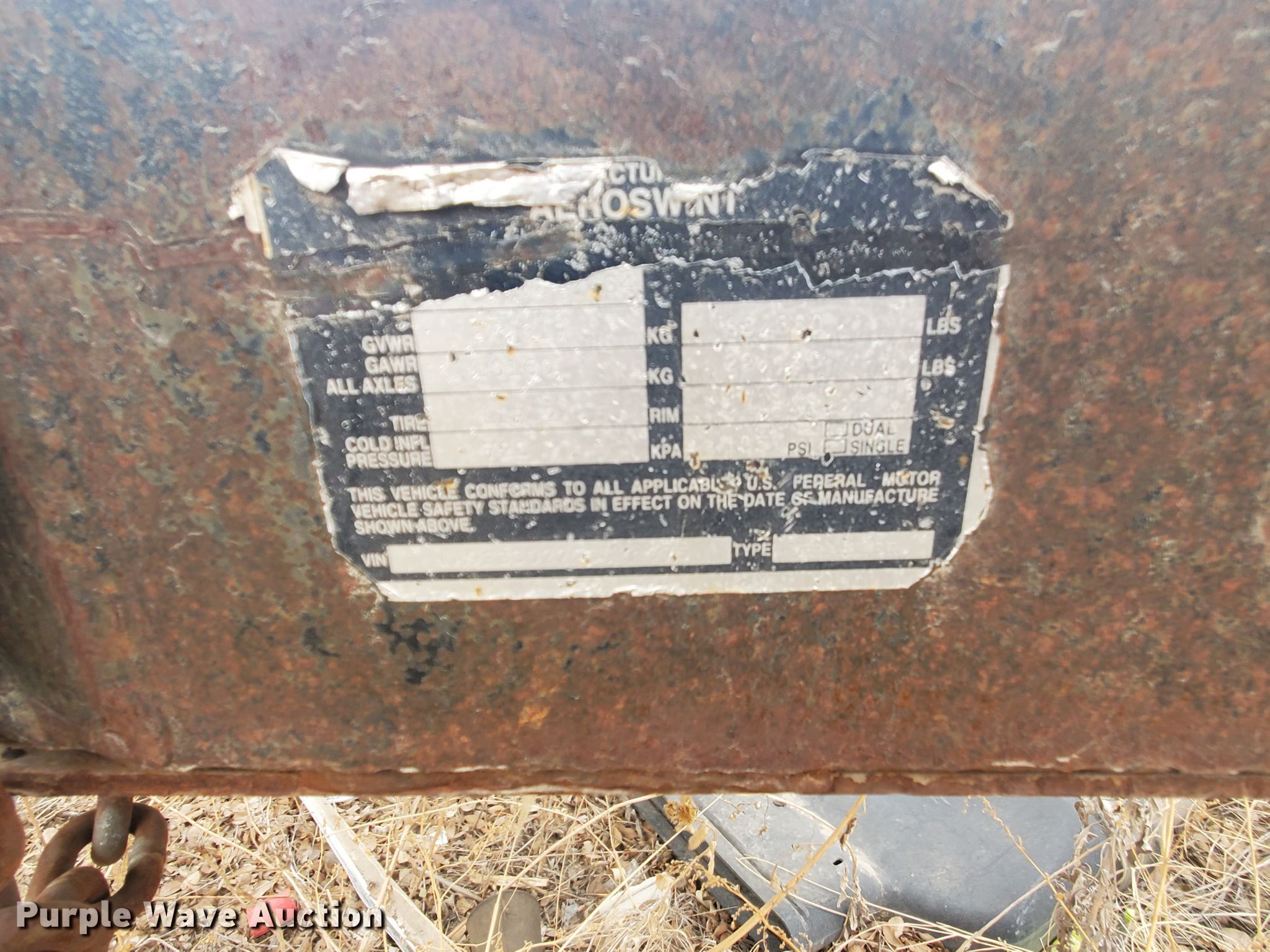 Purple Wave is selling a used Grain or Commodity Trailer in Kansas. This item is a 2005 Aeroswint silage trailer with the following: 30'L x 99"W overall, 65" side height, Steel construction, Dual leg two speed landing gear, Spring suspension, Air brakes, Aluminum wheels, 11R24.5 tires, GVWR 83,380 lbs, GAWR 22,400 lbs, Unit wrecked, Frame twisted, Bed removed from frame, Non-operational unit