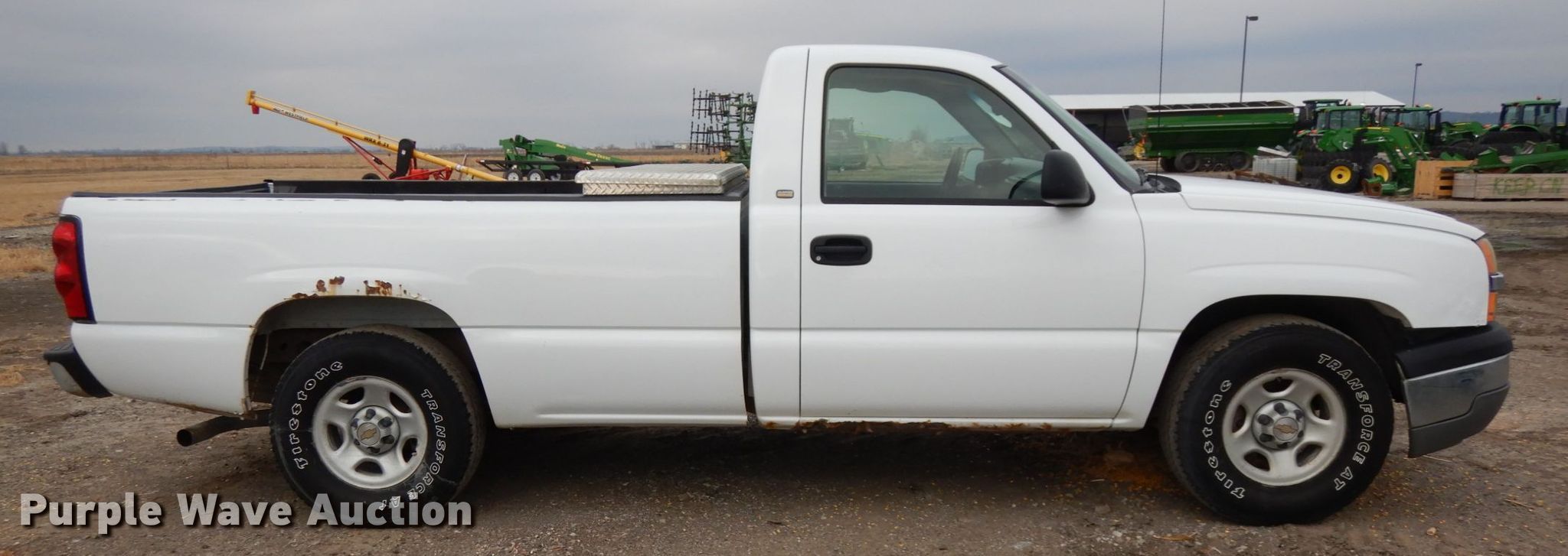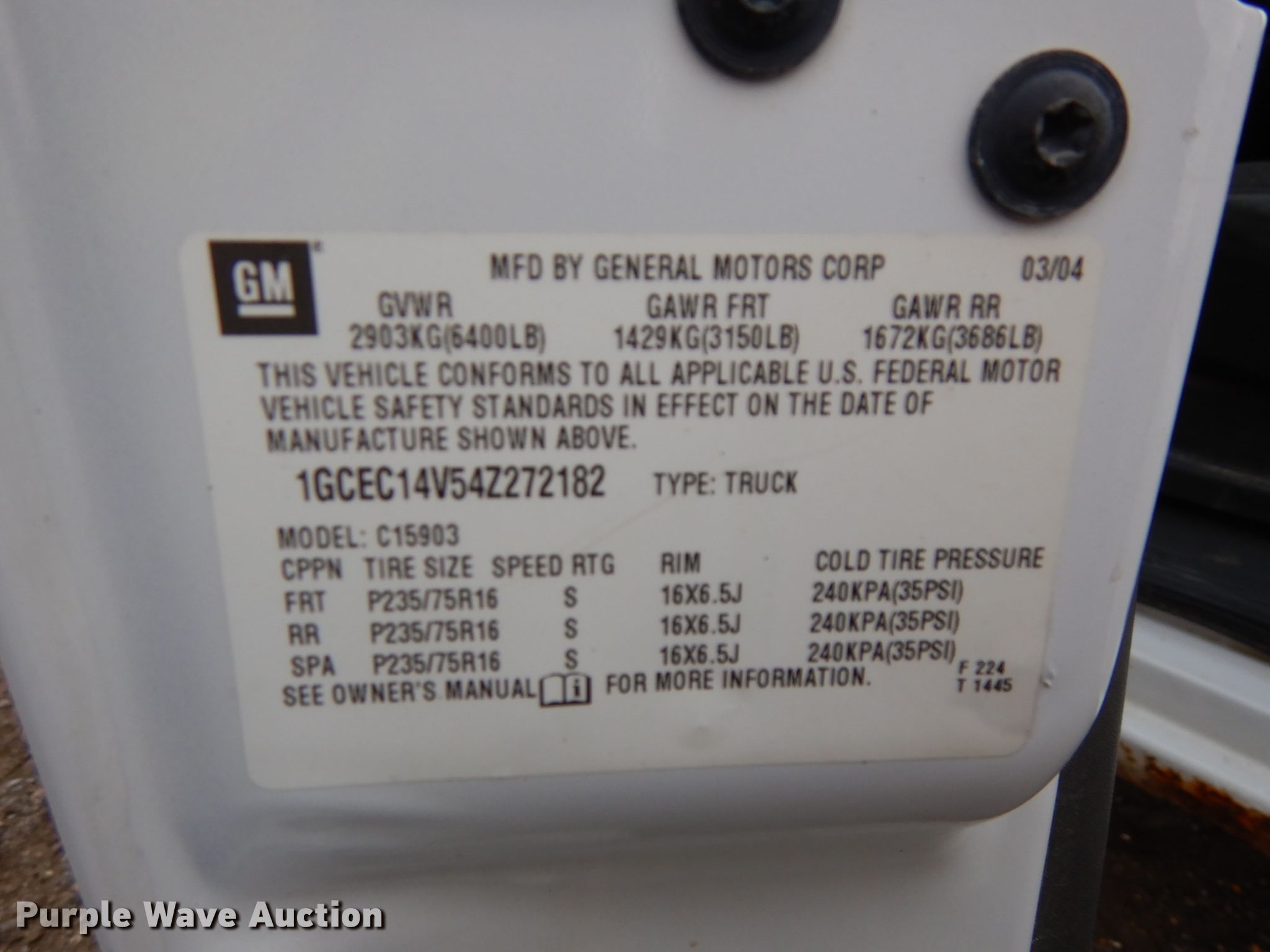 2004 Chevrolet Silverado 1500 pickup truck. 178,404 miles on odometer. Engine Displacement: 4.8L V8 OHV 16V, Cylinders: 8, Fuel type: Gas. Transmission Automatic. Interior AC, Heat. Tires Size: LT265/75R16. Notes Operator manual. Iowa title. 1GCEC14V54Z272182. AgriVision Equipment Group. 58668 190th St. Pacific Junction, IA 51561