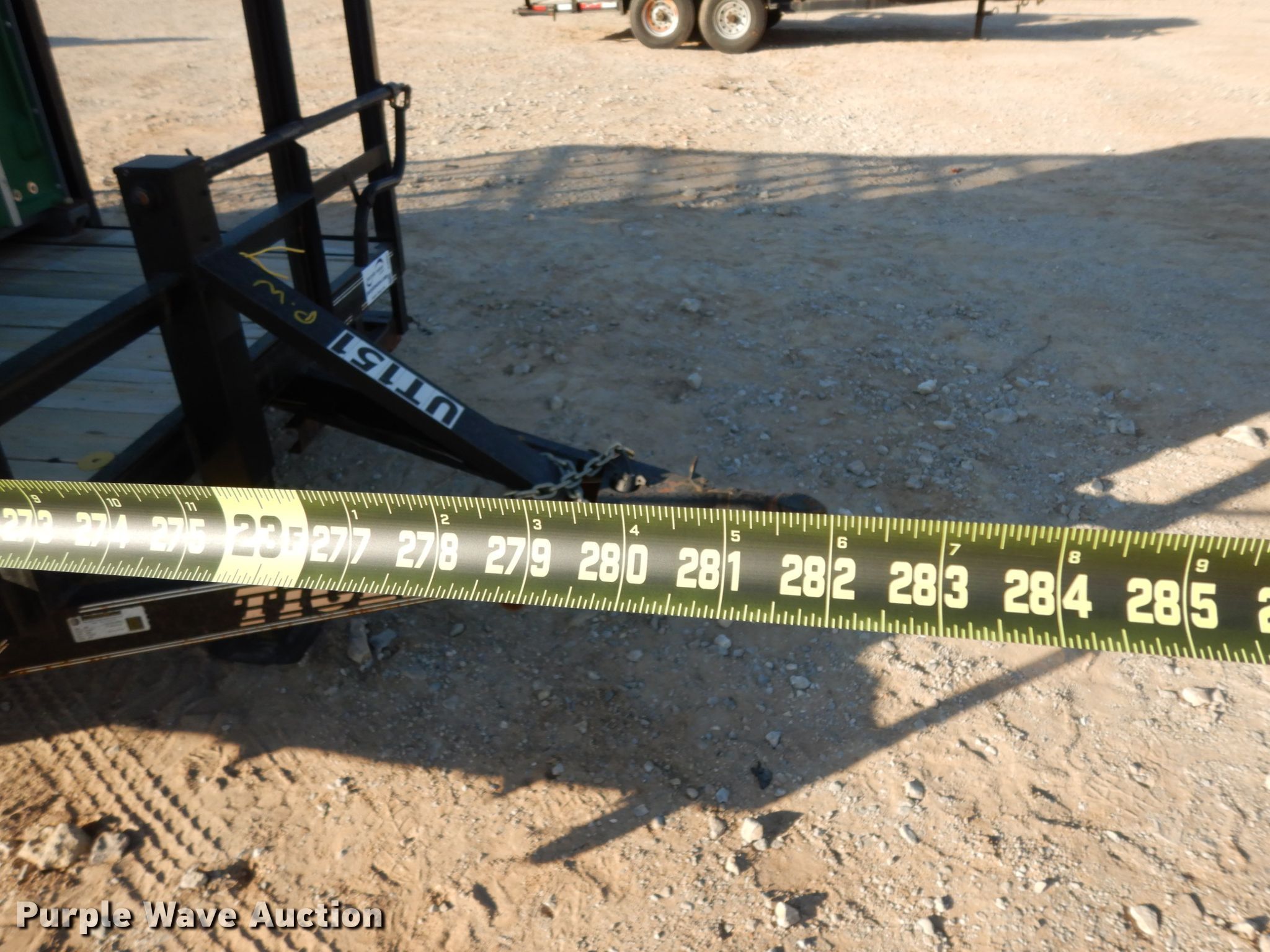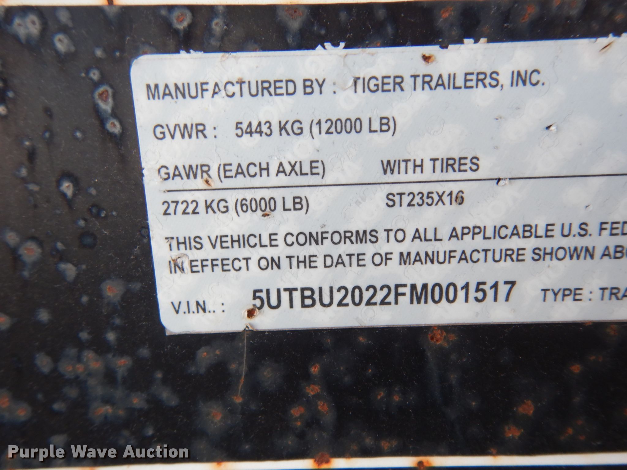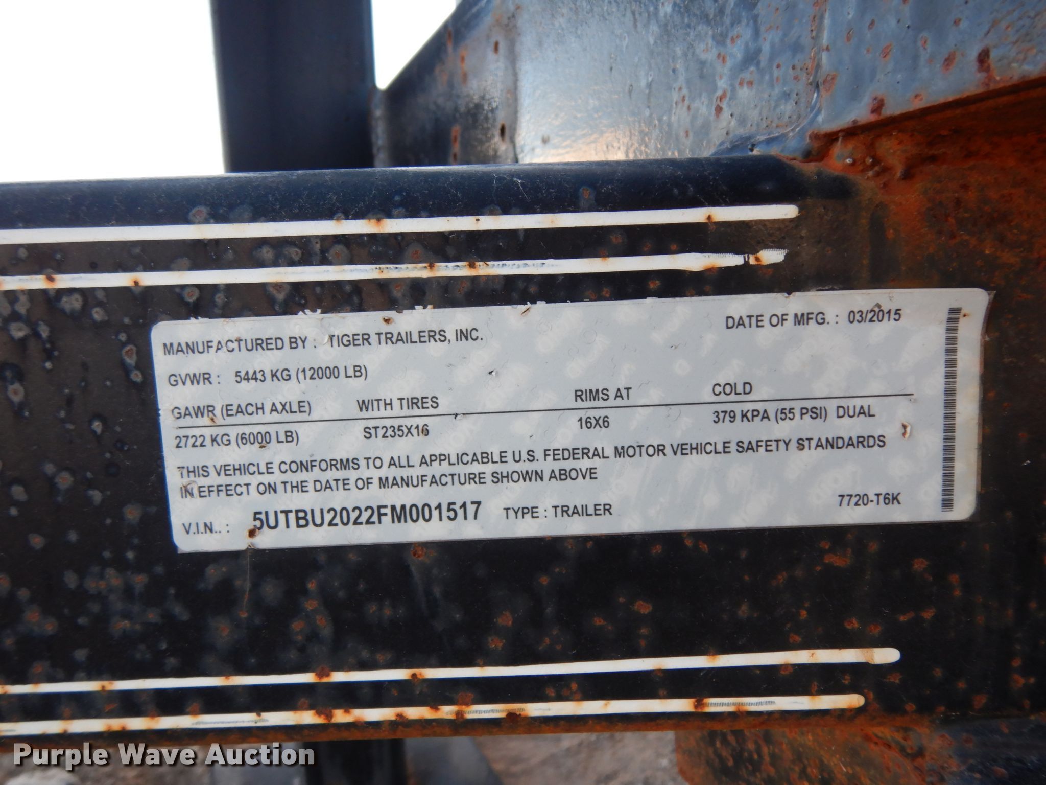 Purple Wave is selling a used Car or Utility Trailer in Texas. This item is a 2015 Tiger utility trailer with the following: 24'L x 96"W overall, 20'L x 76"W wood deck, 6' side height, 20" floor height, 2 5/16" ball hitch, Single leg landing gear, Spring suspension, Electric brakes, Tandem axle, Steel wheels, ST235/80R16 tires, GVWR 12,000 lbs, Cans and porta-potties included, Unit# UT-151