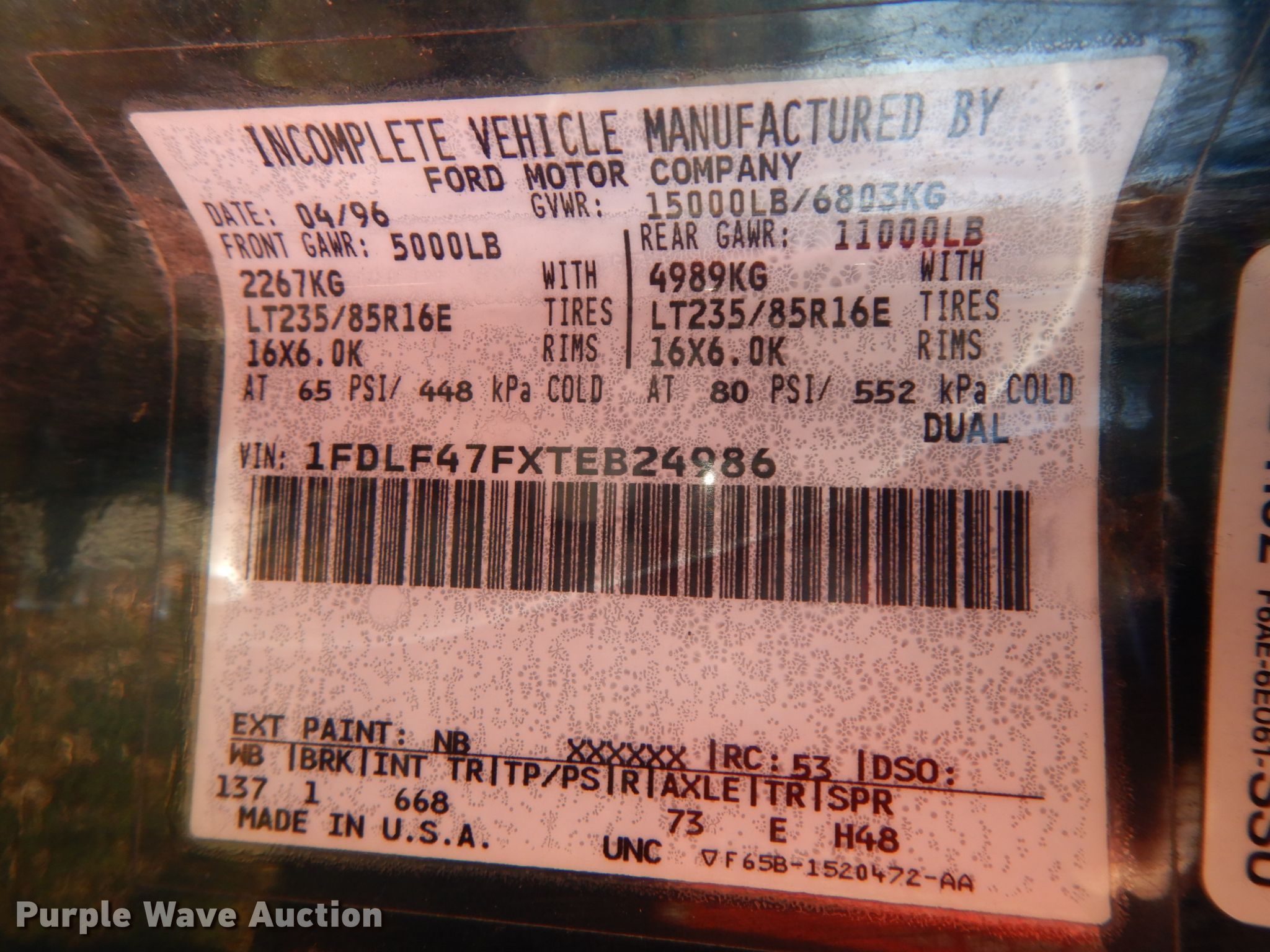 1996 Ford F450 Super Duty utility truck. 224,588 miles on odometer. Engine Displacement: 7.3L V8 OHV 16V, Cylinders: 8, Fuel type: Diesel. Transmission Automatic. Chassis Axles: Single, Suspension: Spring, Brakes: Hydraulic. Interior AC, Heat. Operational Utility bed Reading 108FADW, Length: 9'. Tires Size: LT235/85R16. Missouri title. 1FDLF47FXTEB24986. Edd's Plumbing/Livingston County. 11334 Liv 233. Chillicothe, MO 64601