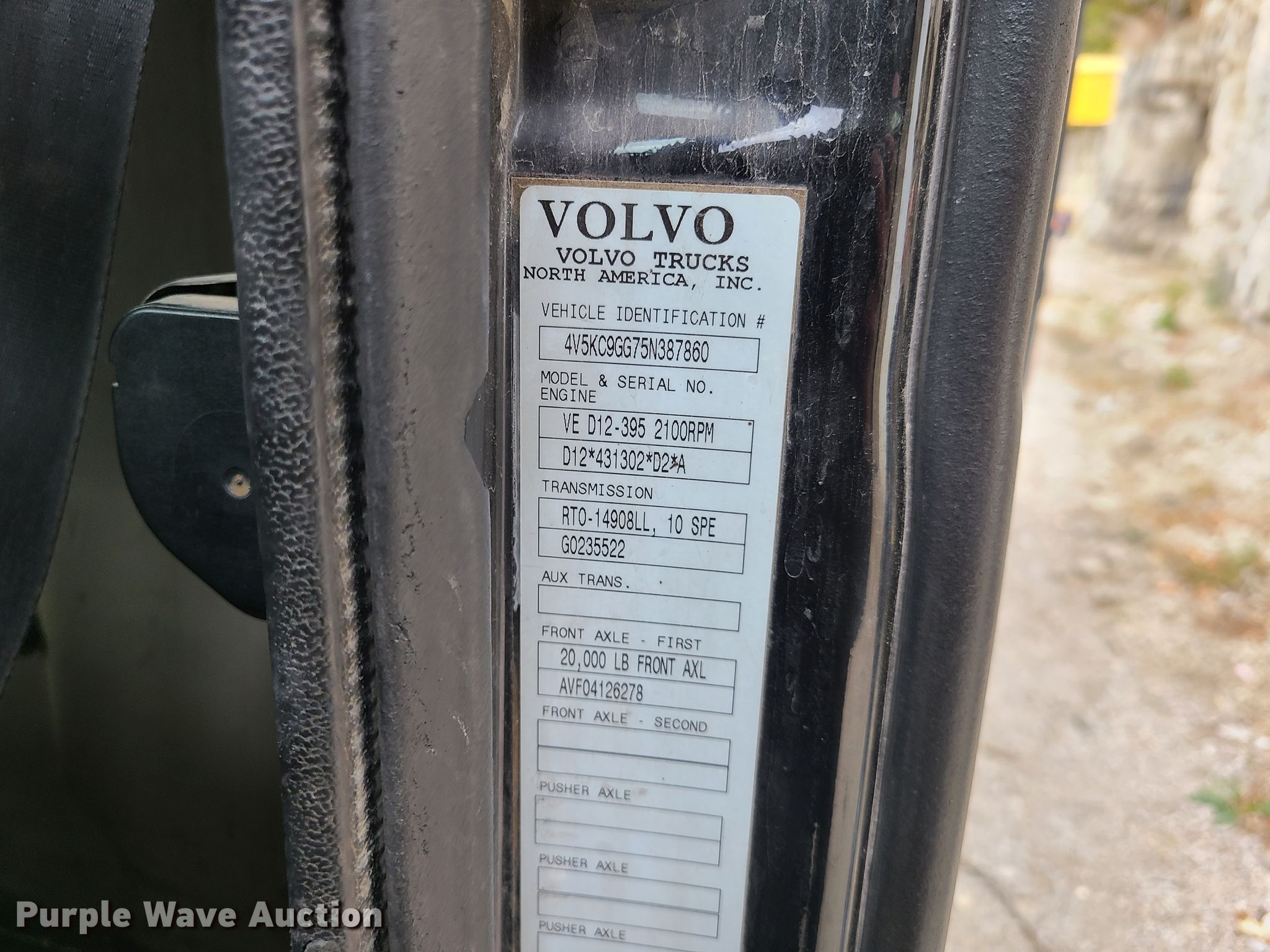 2005 Volvo VHD truck cab and chassis. 263,265 miles on odometer. Engine Volvo D12, Displacement: 12.1L, Cylinders: 6, Fuel type: Diesel. Transmission Eaton Fuller, Manual, Speed: 8. Chassis Axles: Triple, Brakes: Air, PTO. Interior AC, Heat. Tires Front: 315/80R22.5, Rear: 11R24.5. Notes Bed not included and will be removed. Missouri title. Title distribution may be delayed up to 14 days from verification of funds. 4V5KC9GG75N387860. Vance Bros Inc.. 5201 Brighton Ave. Kansas City, MO 64130