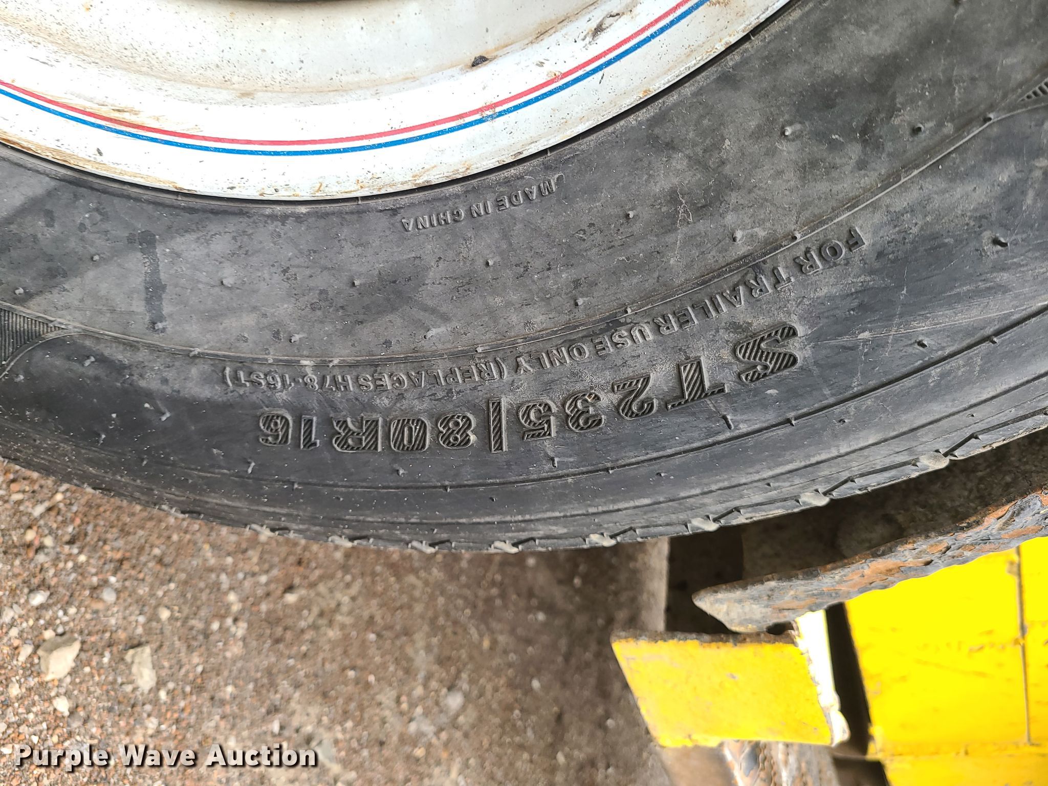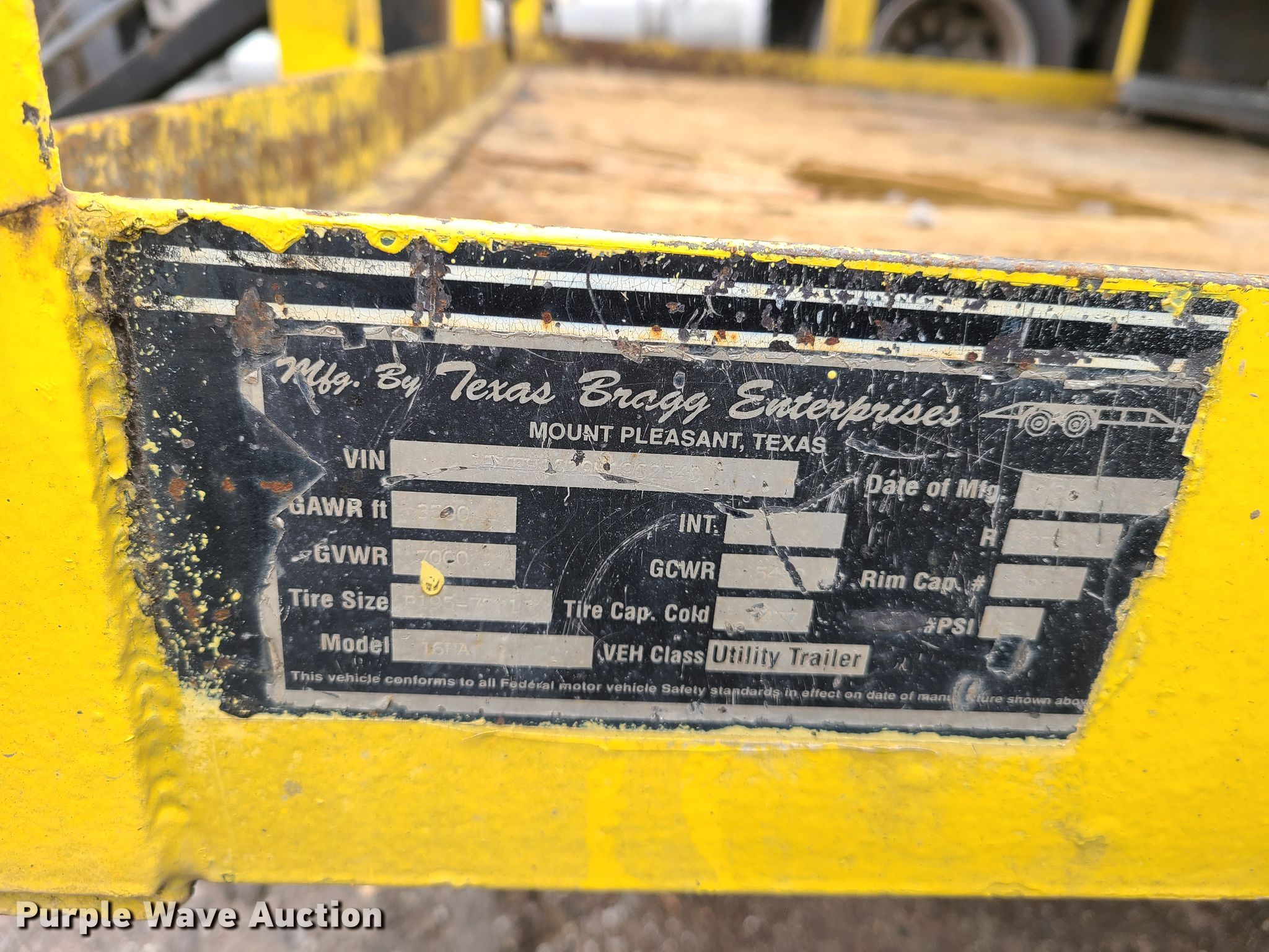 Purple Wave is selling a used Car or Utility Trailer in Missouri. This item is a 1996 Texas Bragg utility trailer with the following: 20'L x 102"W overall, 16'L x 81"W deck, Single leg landing gear, Spring suspension, Electric brakes, Tandem axle, 235/80R16 tires, GVWR 7,000 lbs, Black boxes not included