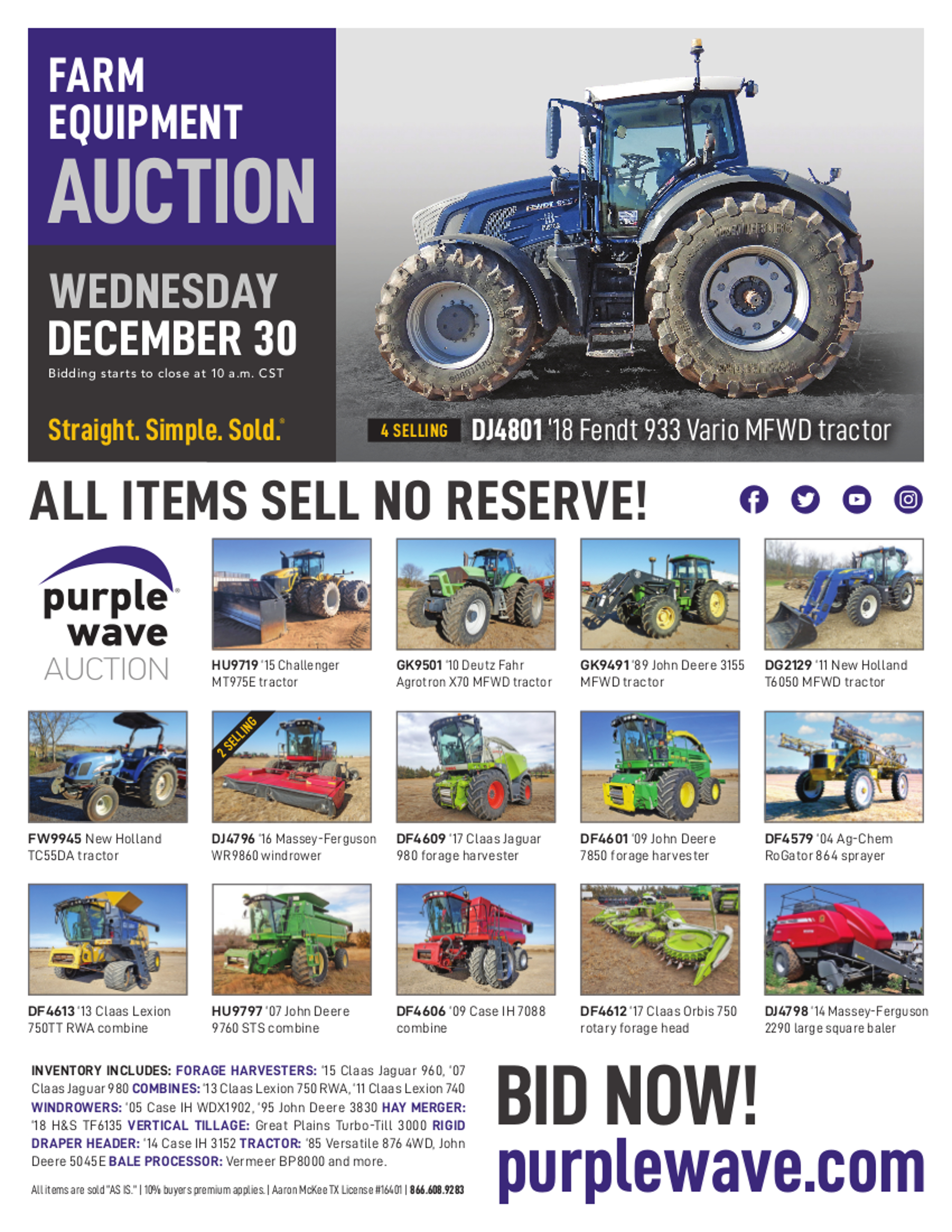This auction is conducted by Purple Wave, Inc., whose home office is 825 Levee Drive, Manhattan, Kansas. Aaron McKee, Texas auctioneer license # 16401, operates Purple Wave, Inc. Complaints against us may be directed to the Texas Department of Licensing and Regulation, P.O. Box 12157, Austin, Texas 78711, (512) 463-6599. For additional required information, see the attached document.