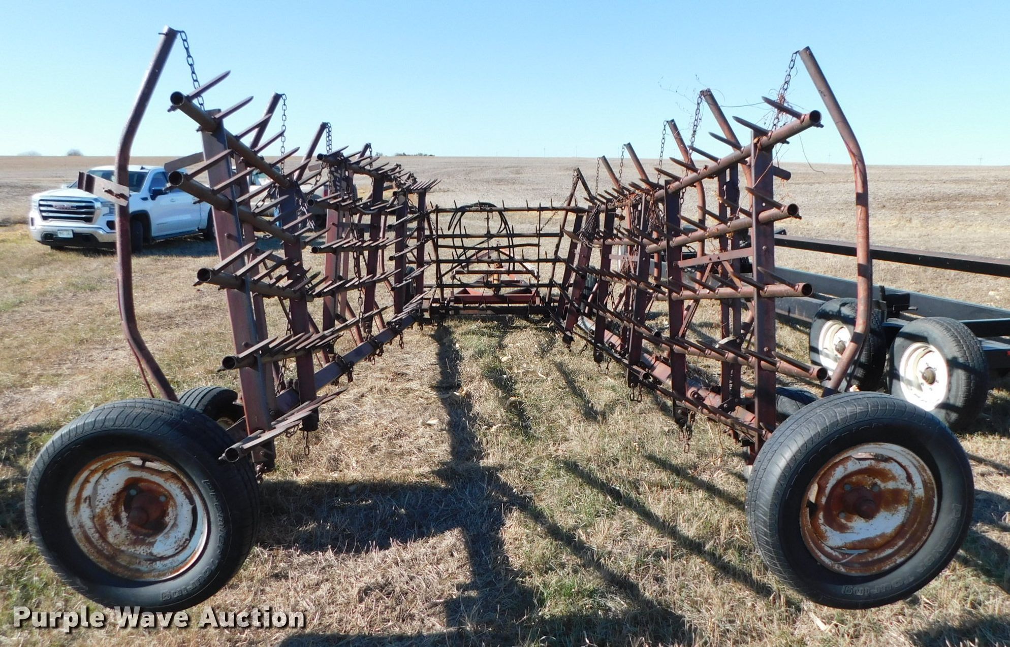 International drag. 40'W, (7) approx. 48"L x 65"W drag sections, Hydraulic lift, Adjustable bar width, P205/70R15 tires, Serial 0110000U000960. TB Farms & Seed Sales. 71365 570th Ave. Fairbury, NE 68352